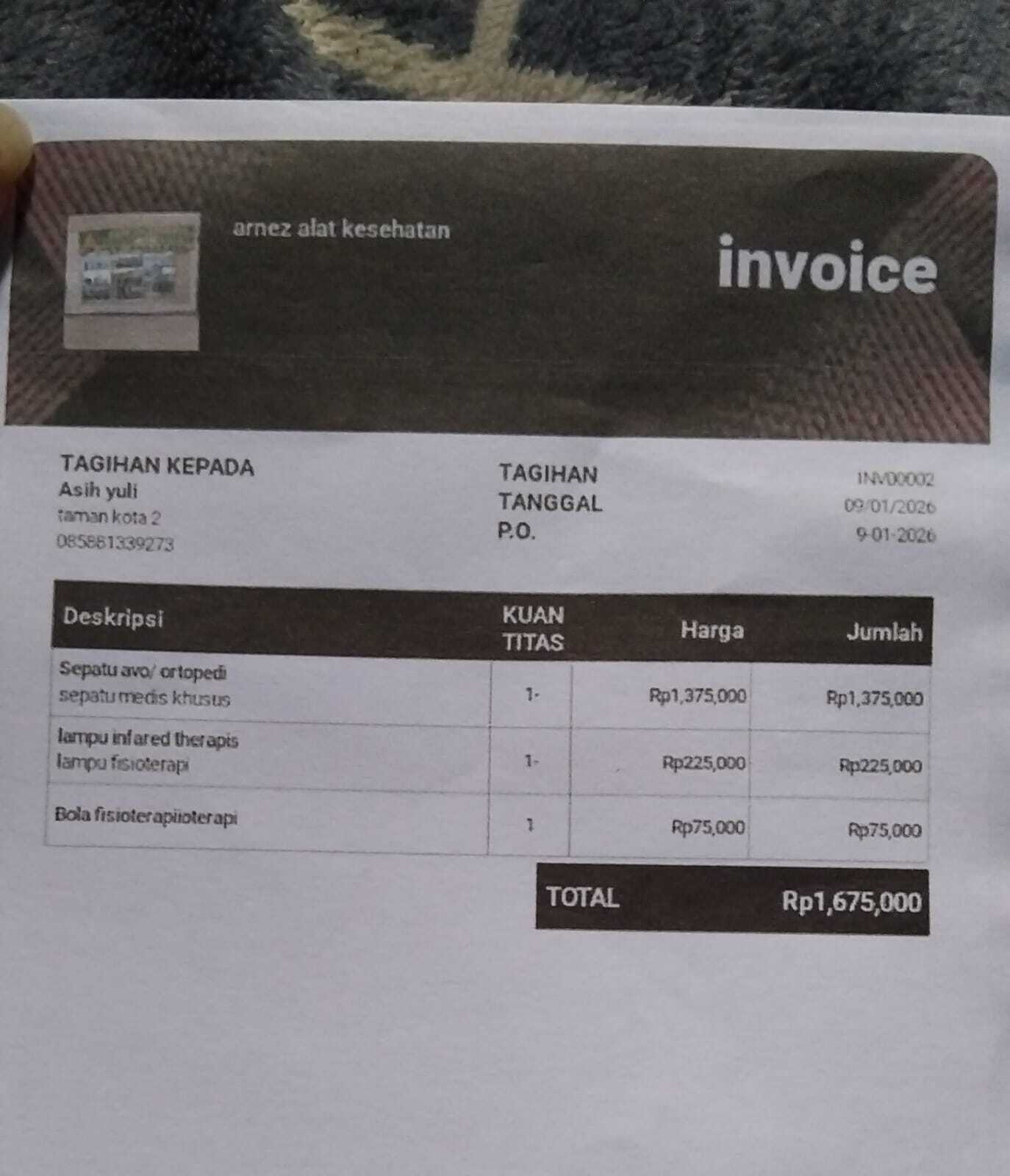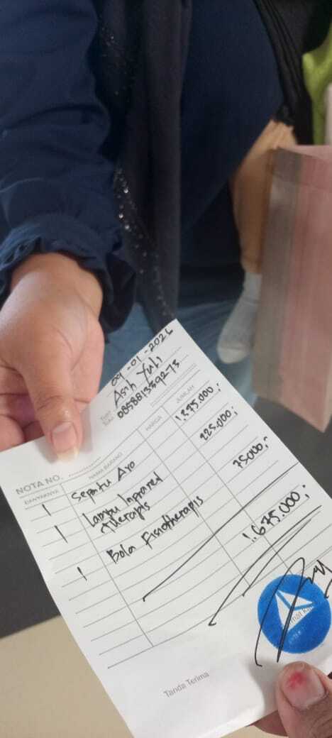 Dana digunakan untuk 1. Stroller Rp1.300.000 2. Set Sepatu Avo Rp1.200.000 3. Bola terapi Rp75.000 4. Lampu infrared Rp225.0002026-01-07 14:59:10