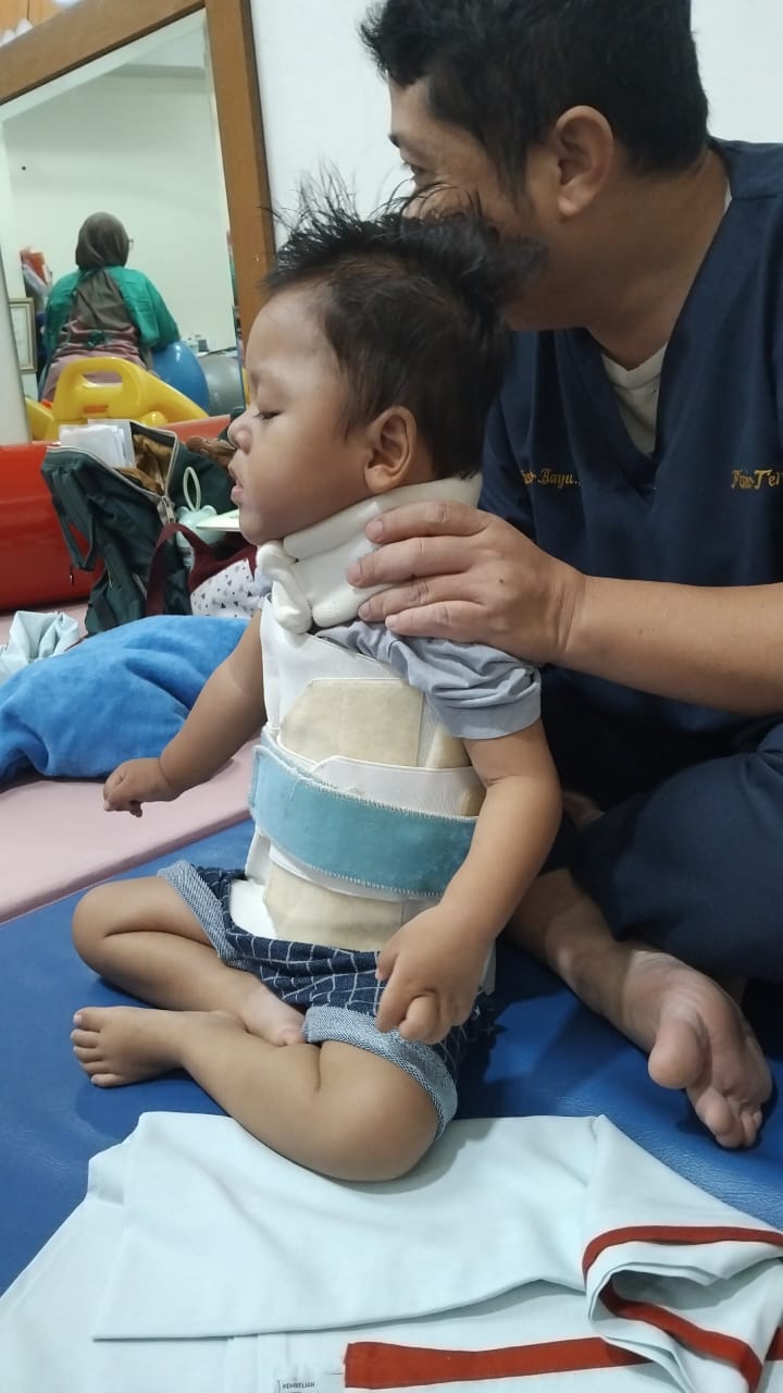Alhamdulillah, berkat donasi dari #TemanBaik, Cio kini dapat memiliki collar untuk digunakan di rumah. Collar ini sangat penting karena selama ini Cio hanya memakainya saat terapi di rumah sakit, dan itupun merupakan fasilitas dari rumah sakit. Dengan adanya collar pribadi, Cio bisa lebih rutin berlatih di rumah karena lehernya masih lemah dan belum dapat tegak dengan baik.
