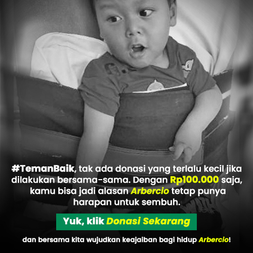 #TemanBaik, tak ada donasi yang terlalu kecil jika dilakukan bersama-sama. Dengan Rp100.000 saja, kita bisa jadi alasan Arbercio tetap punya harapan untuk sembuh. Yuk, klik Donasi Sekarang dan bersama kita wujudkan keajaiban bagi hidup Arbercio!