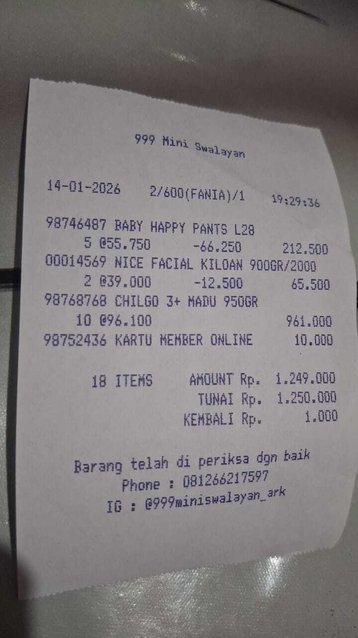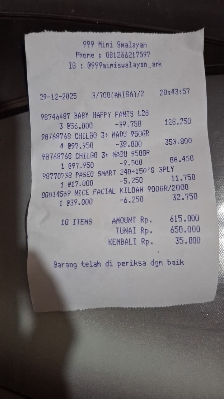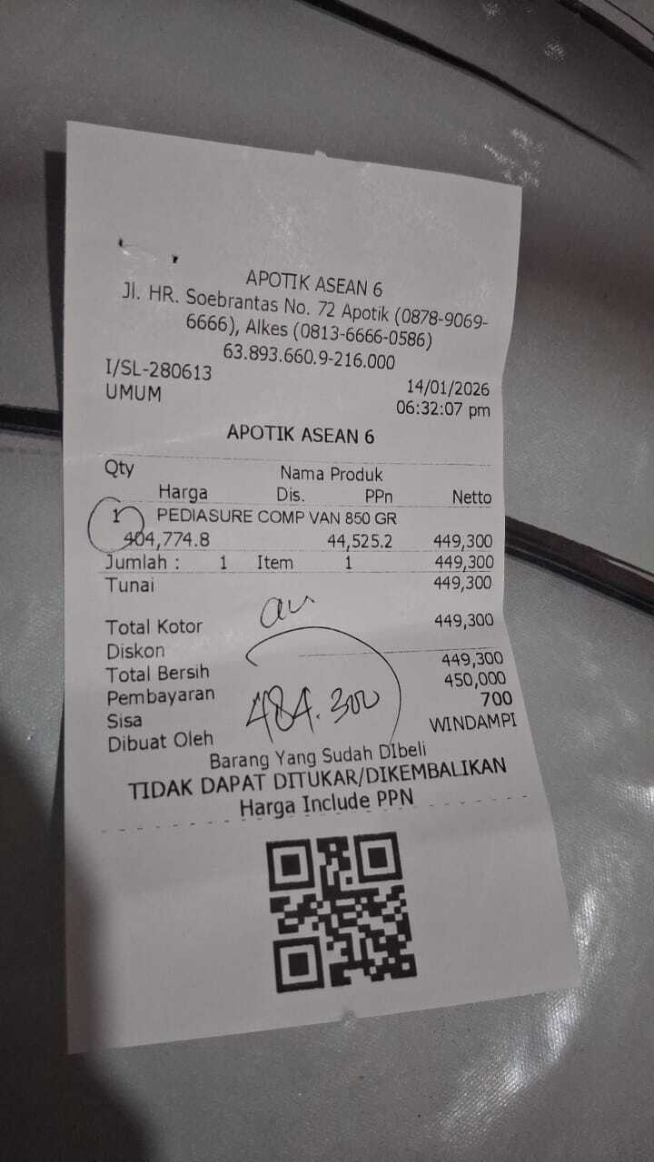 Dana diguakan untuk 1. susu chilgo Rp.100.000 x 4 dus =Rp.400.000 2. pempes beby heppy Rp.50.000 x3 = Rp150.000 3.Transportasi grap kontrol ke rs awalbros PP Rp.100.0002025-12-30 10:34:22