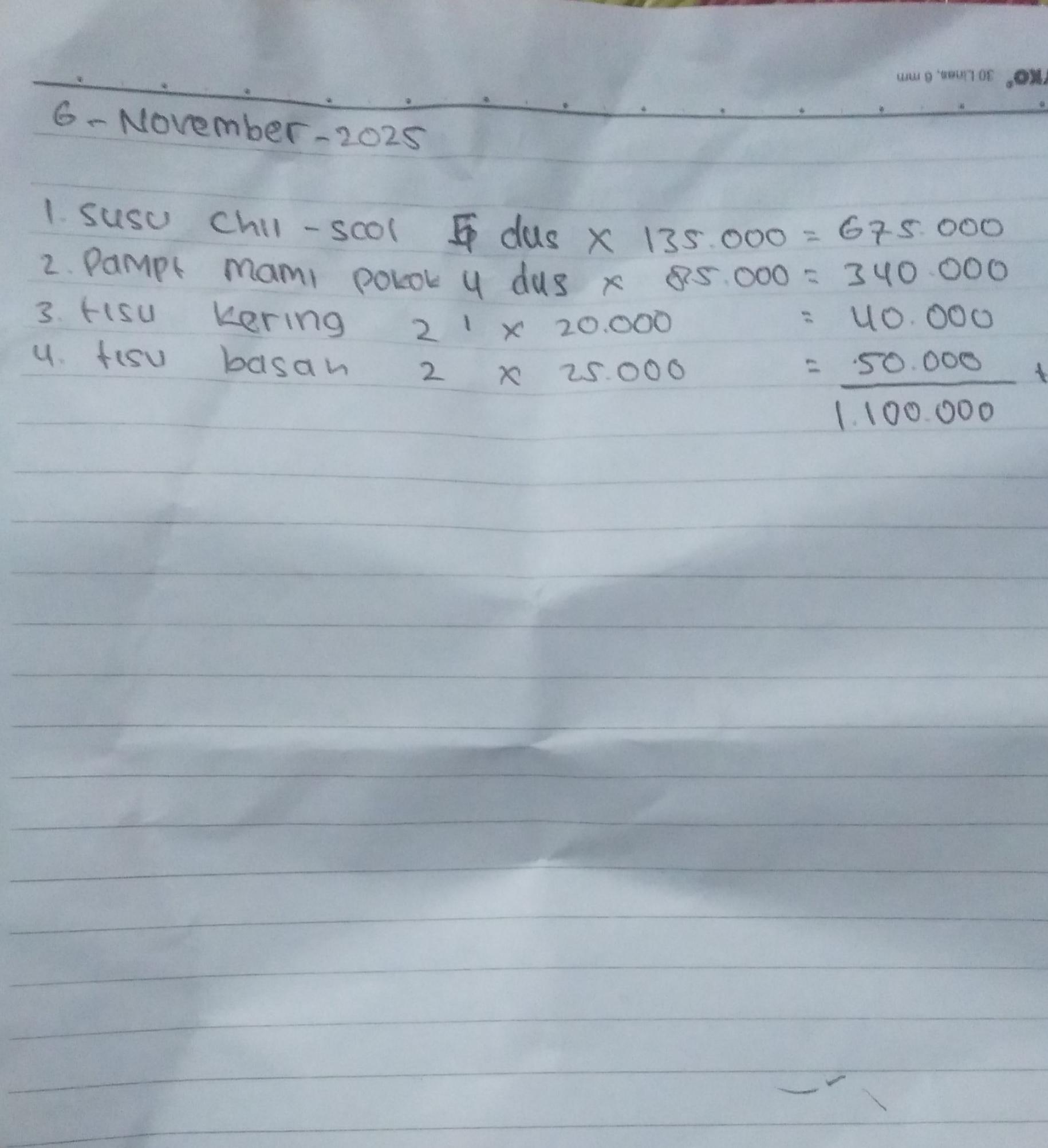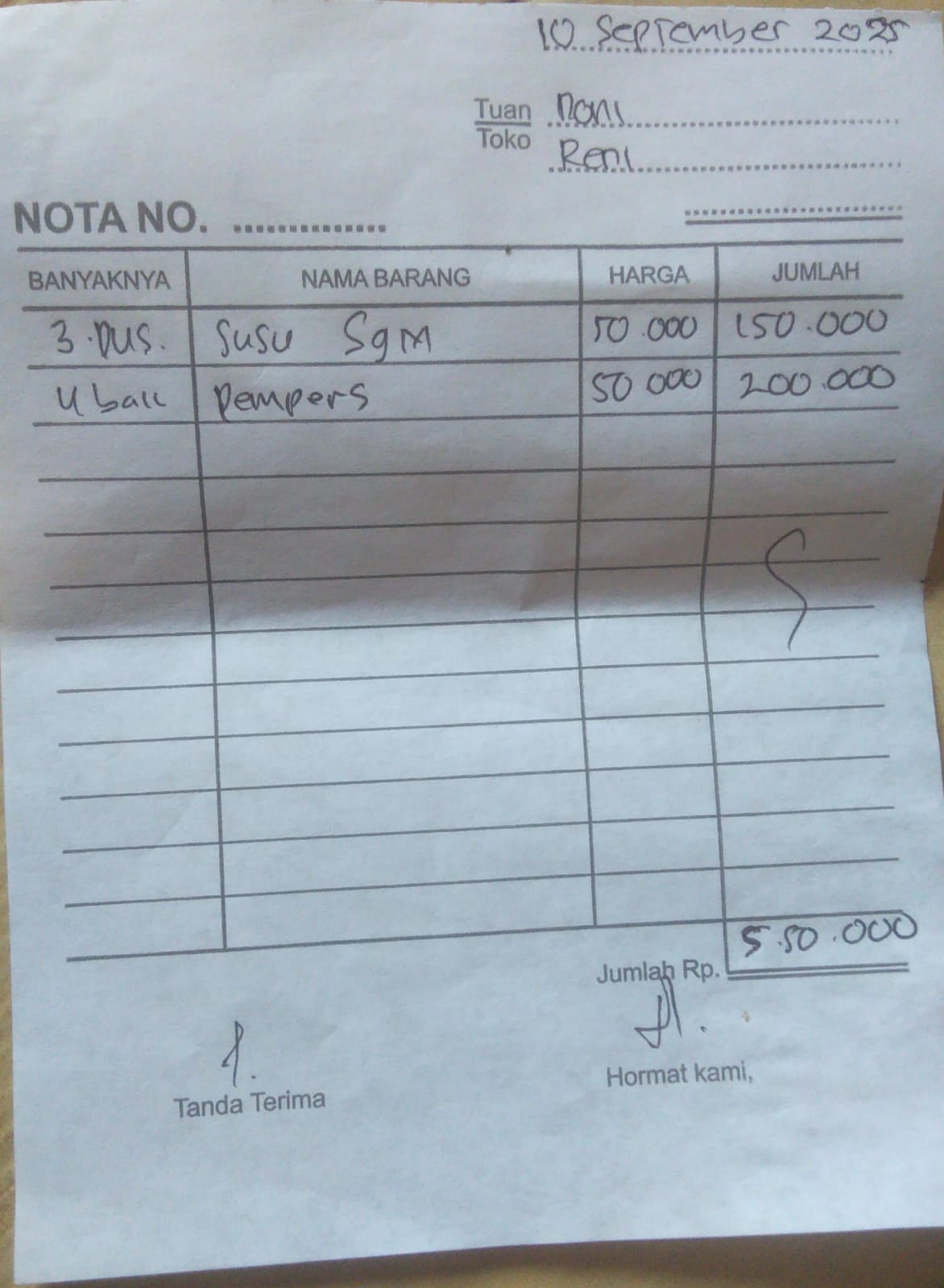 Dana digunakan untuk 1. Pampers baby happy 4 ball × Rp80.000= Rp320.000 2. Susu chilscol 2 kotak x Rp75.000= Rp150.0002025-12-02 10:48:06