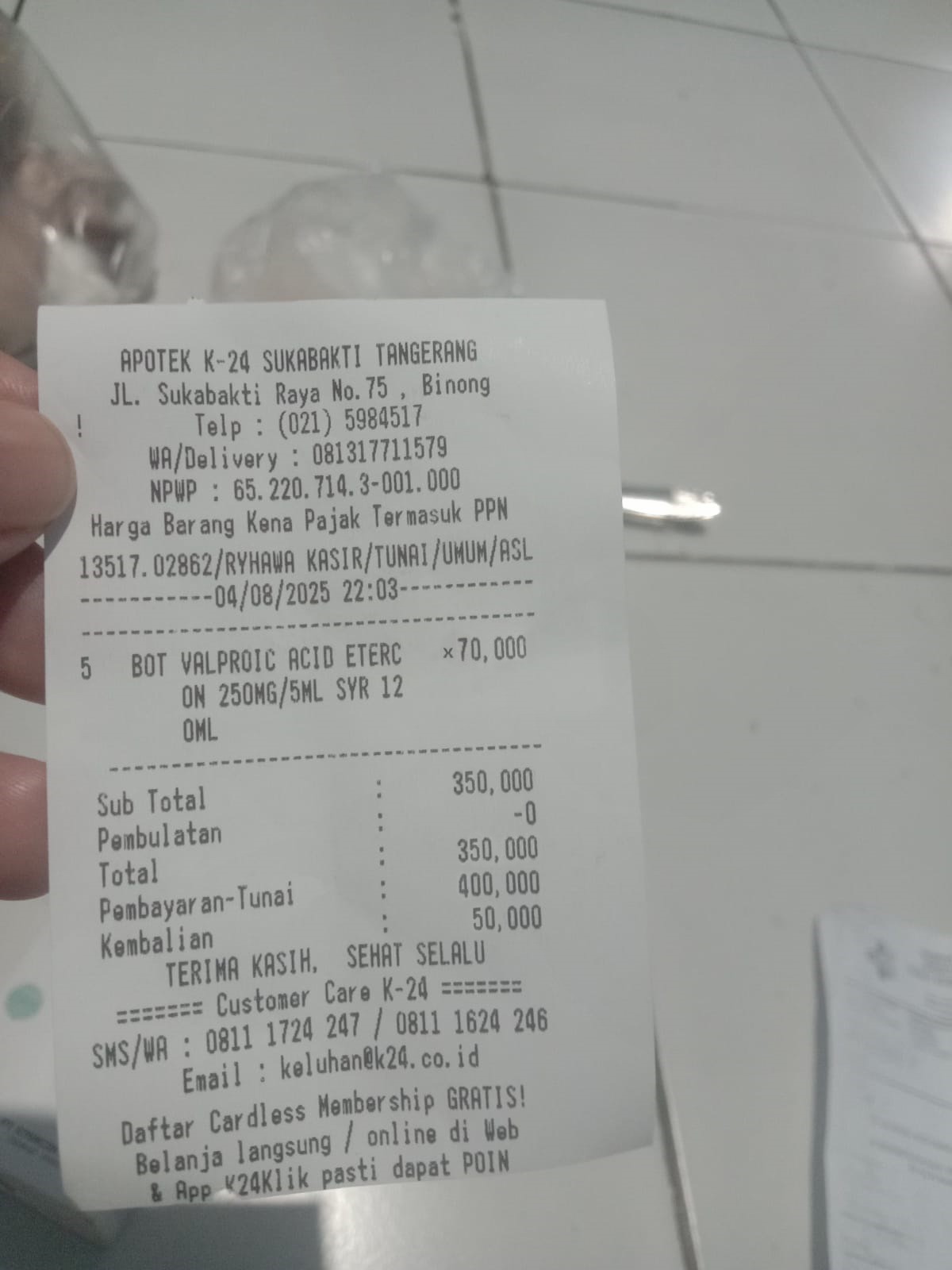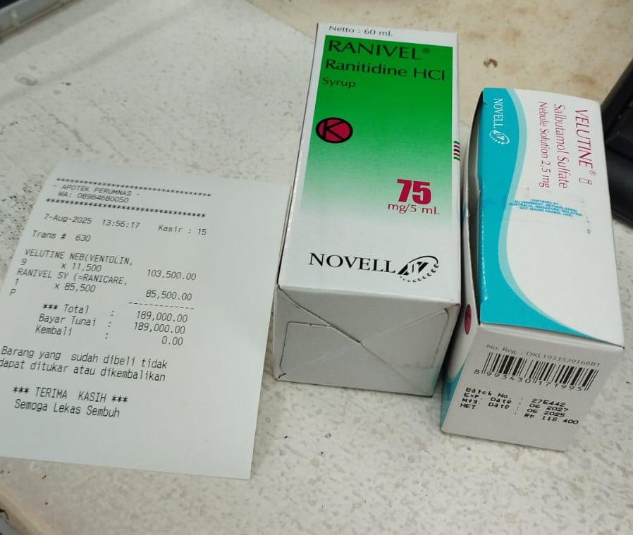 1. Reimburse Susu SGM optigrow Rp100,000 x 10= Rp1.000,000 2. Reimburse Pampers kinto Rp78,000 3. Reimburse Minyak telon my baby Rp35,000 x 2= Rp70,000 4. Reimburse Levetracetam 250mg . Rp65.000 x 8 = Rp520,000 5. Reimburse budesonide 0,25 mg Rp23.000 x 10pcs = Rp230,000 6. Reimburse aloclair plus gel Rp120,000 7. Reimburse pamol supp 125mg Rp30,000 x 5 = Rp150,000 8. Reimburse prove D Rp185,0002025-07-09 10:04:58