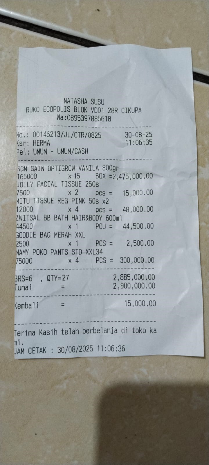 Dana digunakan untuk Reimburse Susu SGM optigrow vanila 800 gram Rp165,000 x 15 = Rp2,475,000 .2025-09-04 08:56:57