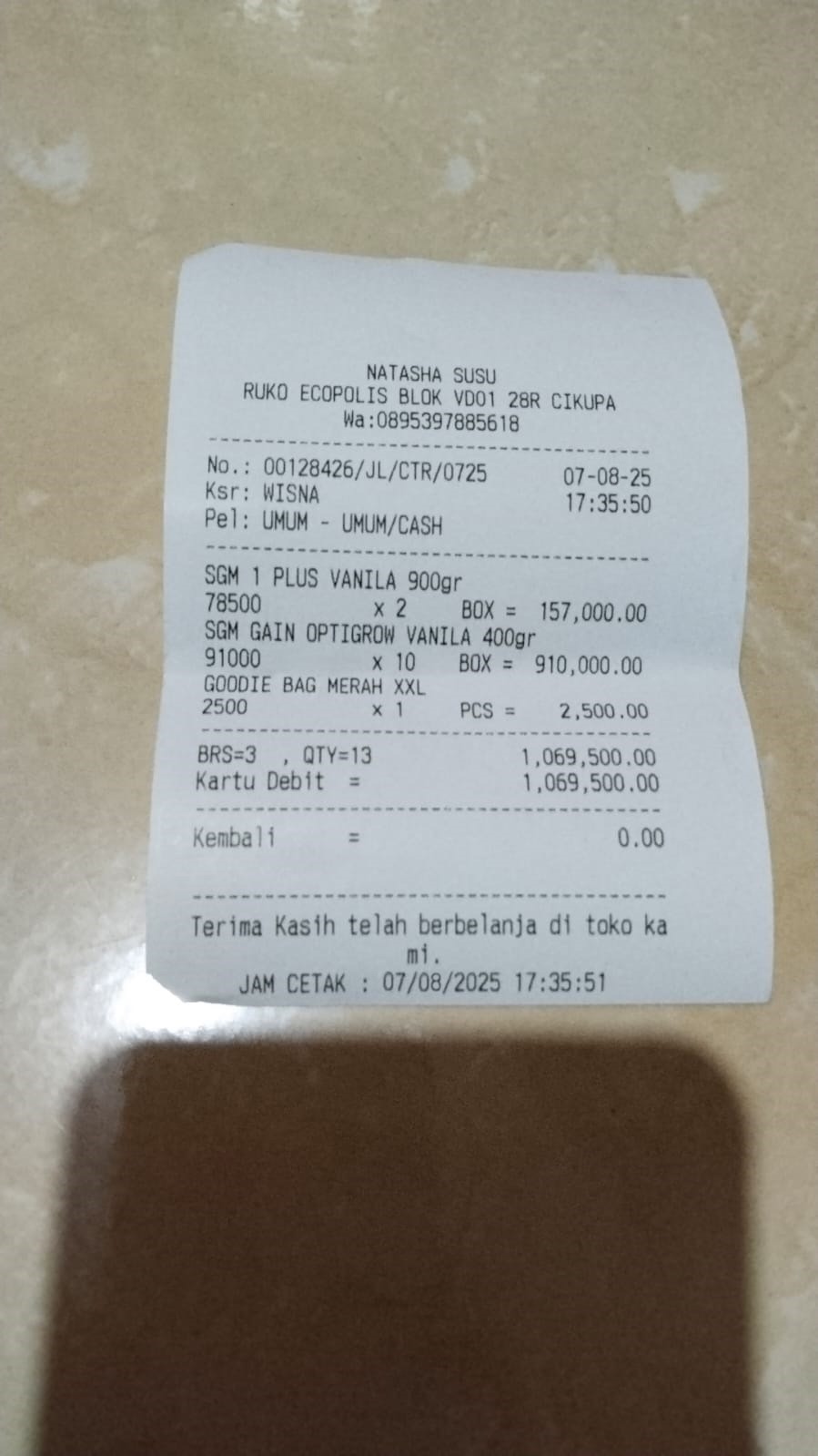 Dana digunakan untuk 1 . Susu SGM gain optigrow vanila Rp165,000 x 2dus= Rp330,000. 2 . Pampers mamy Poko size XL Rp65,000x2 ball = Rp130,000 . 3 . Prolacta dha Rp70,000x20 tablet = Rp140,000 . 4 . Maltofer zat besi Rp80,000.2025-09-29 11:52:13