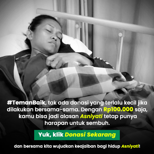 #TemanBaik, tak ada donasi yang terlalu kecil jika dilakukan bersama-sama. Dengan Rp100.000 saja, kita bisa jadi alasan Asniyati tetap punya harapan untuk sembuh. Yuk, klik Donasi Sekarang dan bersama kita wujudkan keajaiban bagi hidup Asniyati!