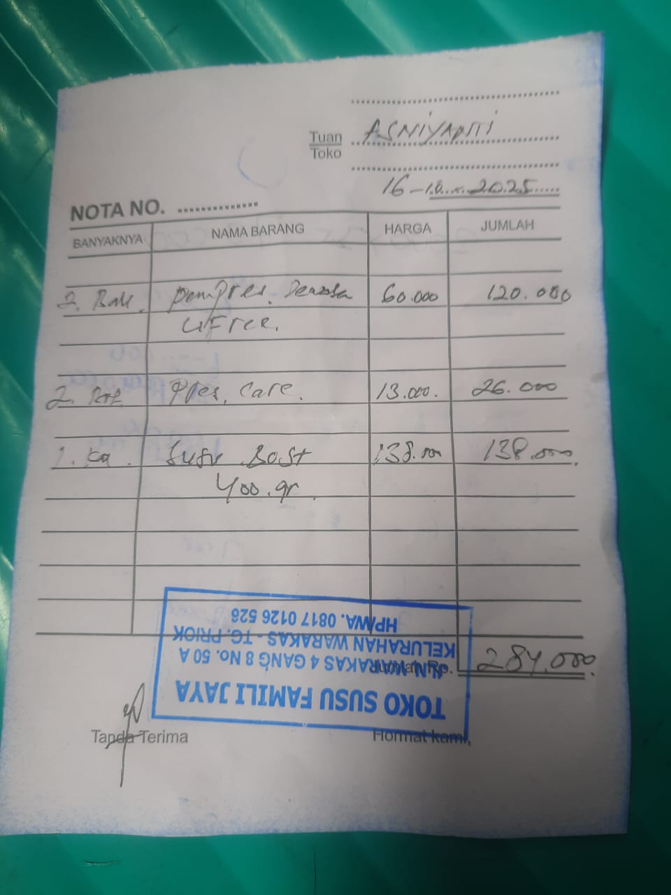 Dana digunakan untuk 1. Obat Fiotram Rp776.000 2. Pampers merek lifree Rp60.000 x 5 = Rp300.0002025-11-21 10:00:40