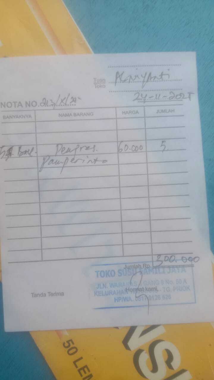 Dana digunakan untuk 1. Pampers confidance Rp50.000 x 30 = Rp1.500.000 2. Susu ensure gol 38g Rp150.000 x 4 = Rp600.0002026-01-05 09:25:20