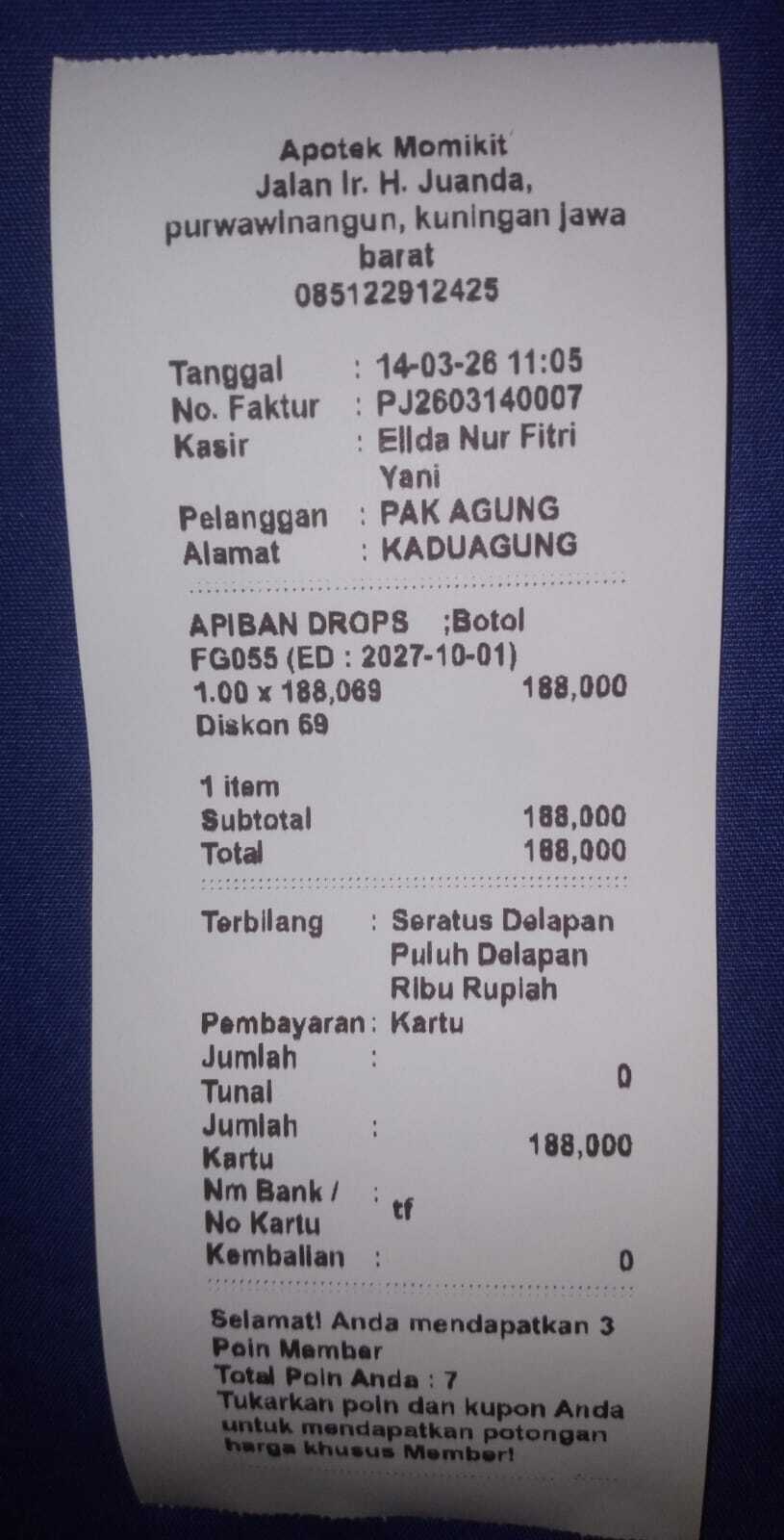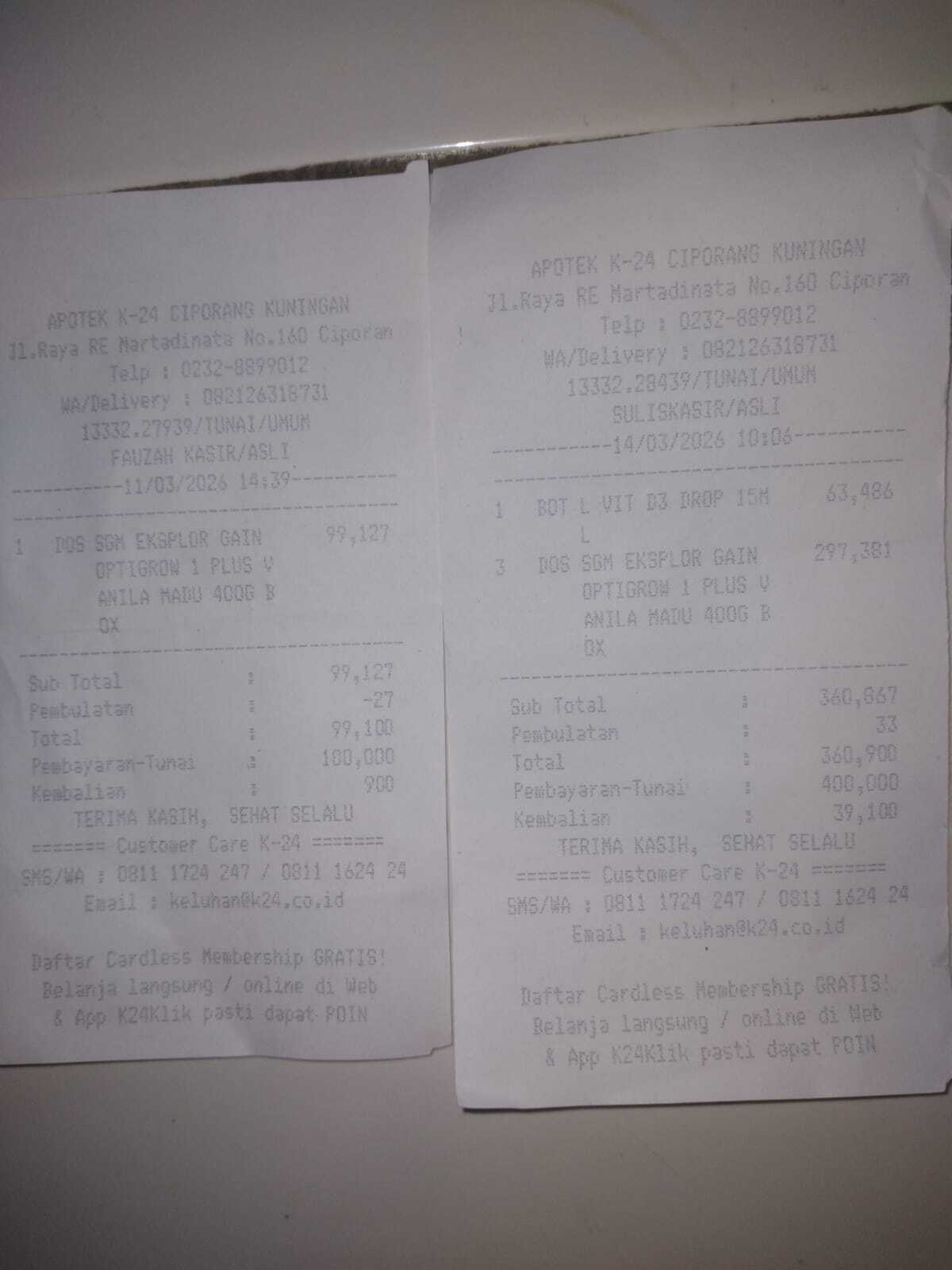 Dana digunakan untuk 1. Susu Sgm Eksplor gain optigrow Rp100.000 x 3 = Rp300.000 2. PampresRp59.000 x2Ball= Rp117.000 3. Vitamin L-VitD3 Rp70000 4. Vitamin Apiban Drops Rp200.000 5. Reimburse susu sgm Rp100,0002026-03-16 15:39:27