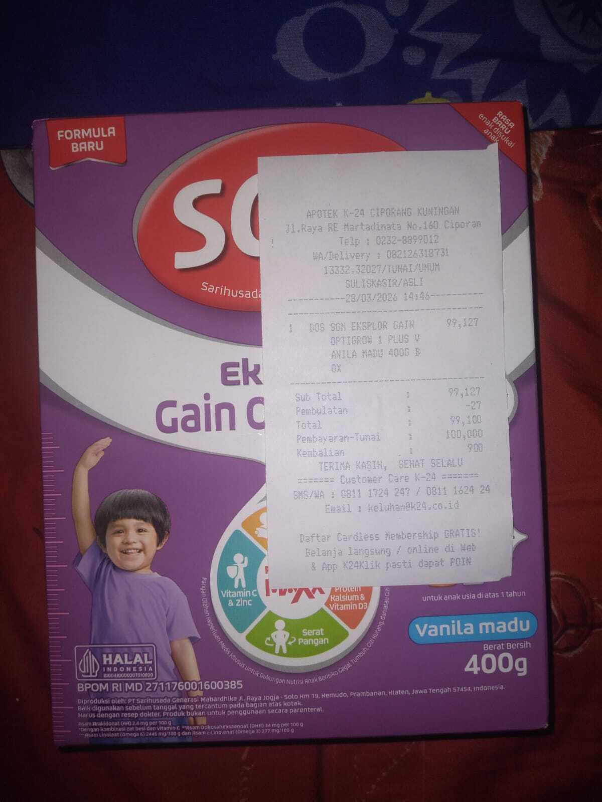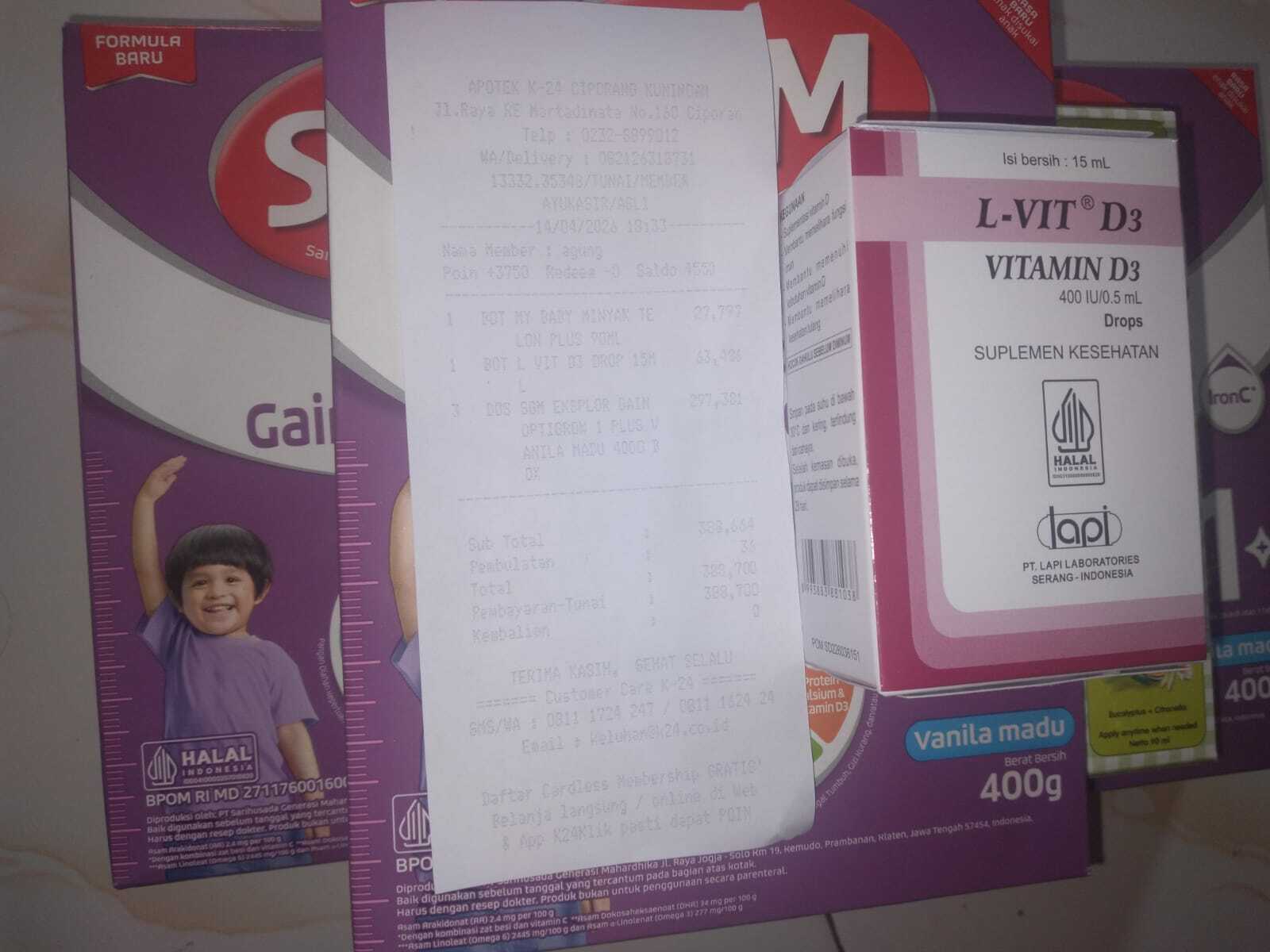 Dana digunakan untuk 1. Reimburse susu sgm eksplor 2 dus Rp200.000 2. Susu sgm eksplor gain optigrow harga Rp100.000 x 3Dus= Rp300.000 3. Obat Vitamin Apiban Rp188.000 4. Beli obat L-Vit D3 Rp70.000 5. Pempers baby happy ukuranS56 Rp58.500×2= Rp117.000 6. Minyak telon Rp35.0002026-04-16 09:51:19