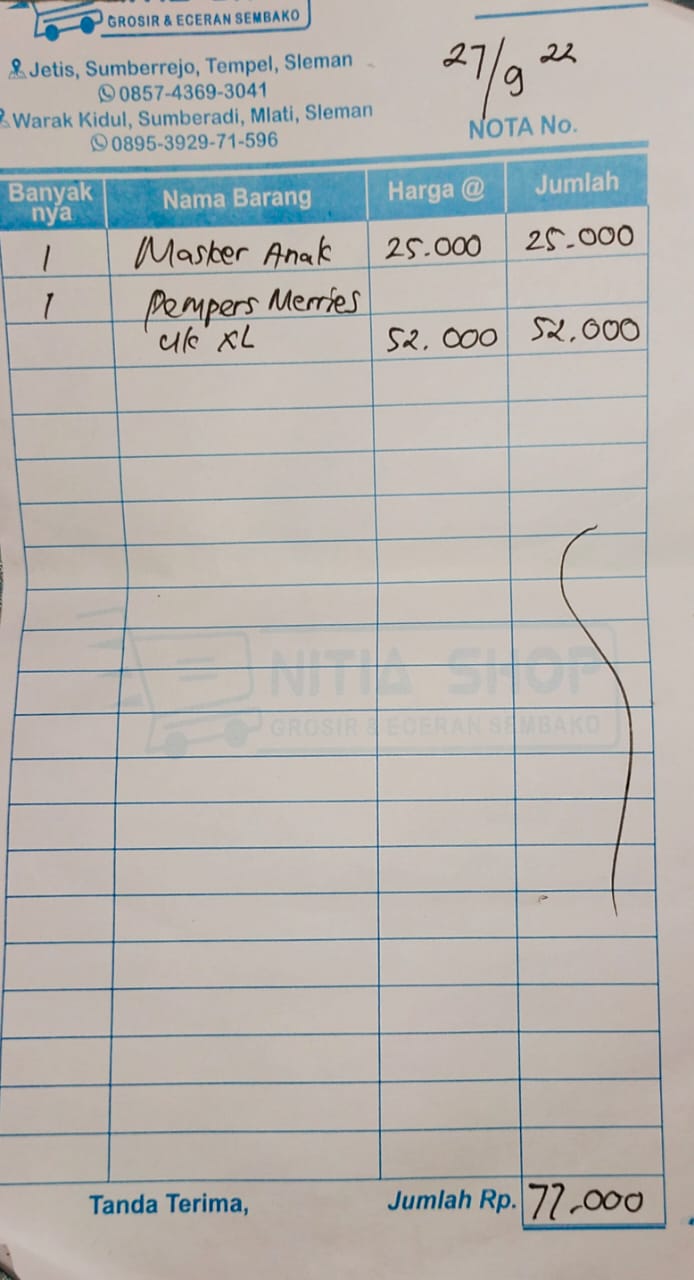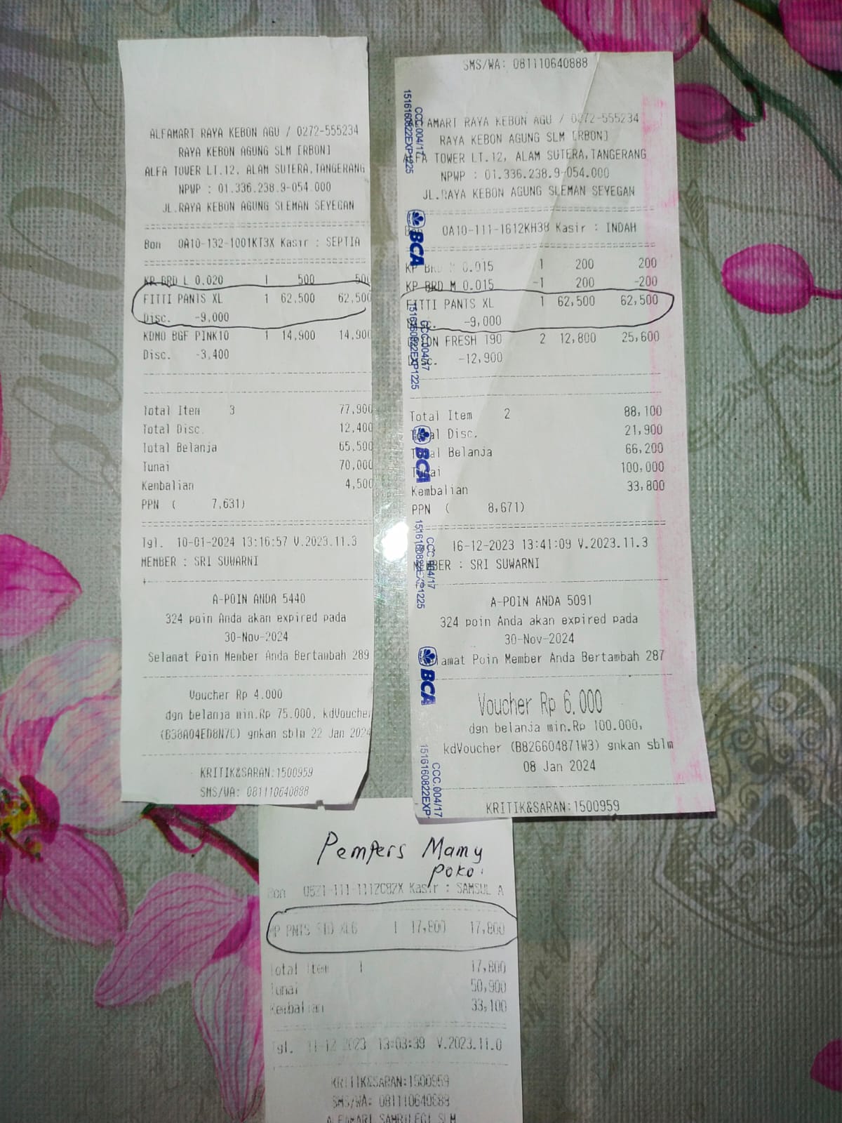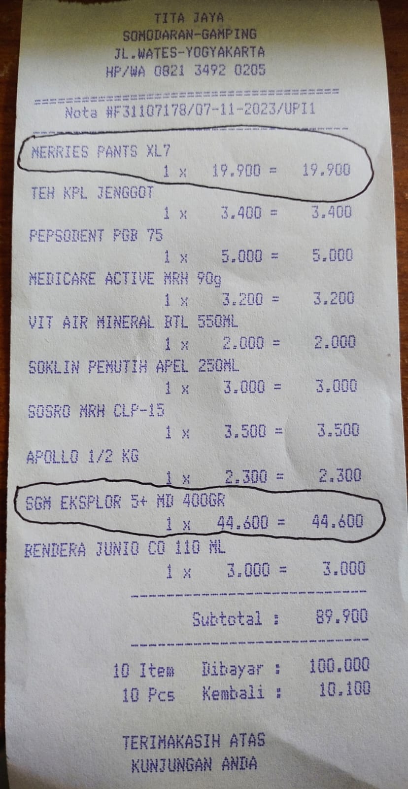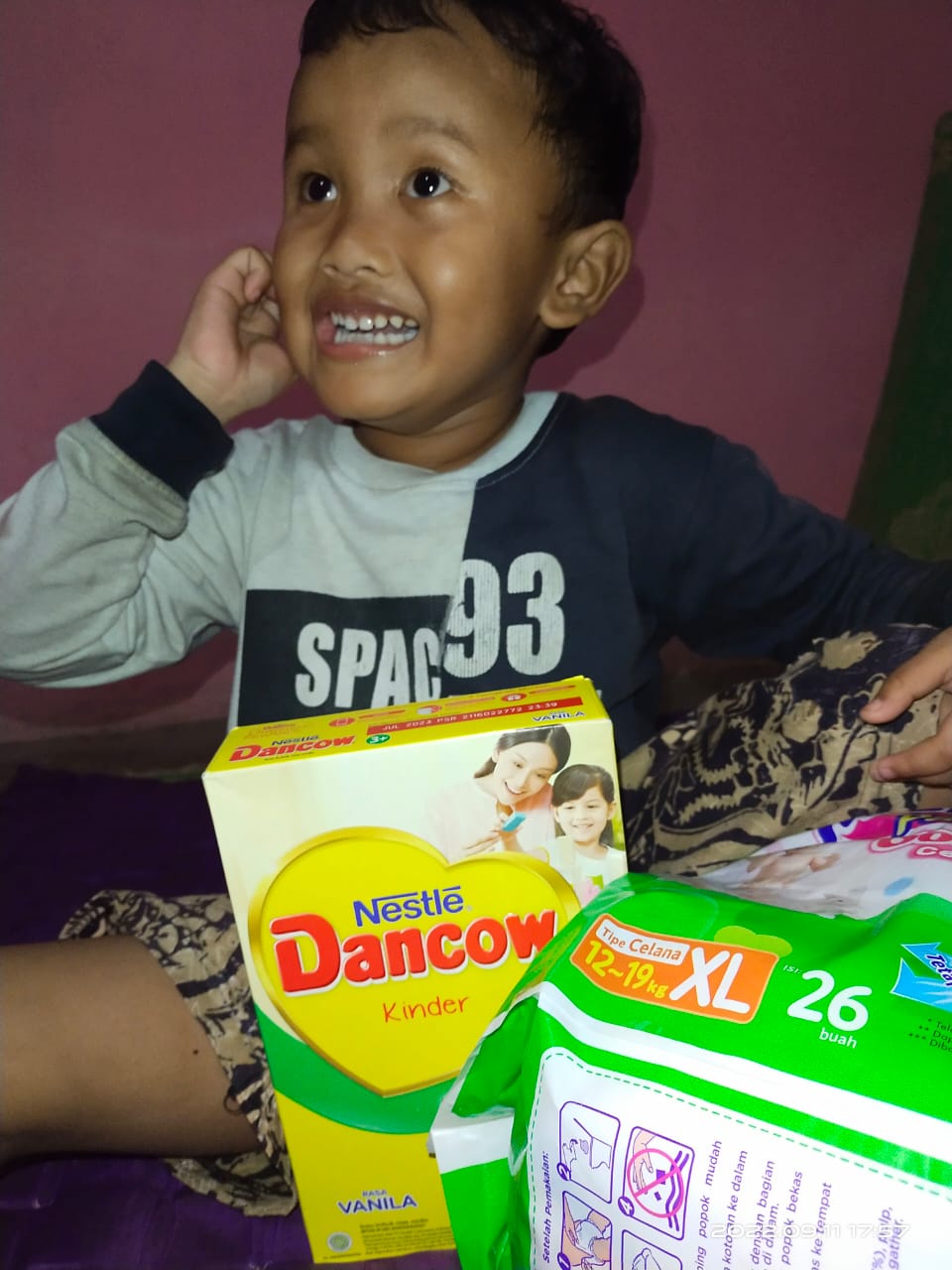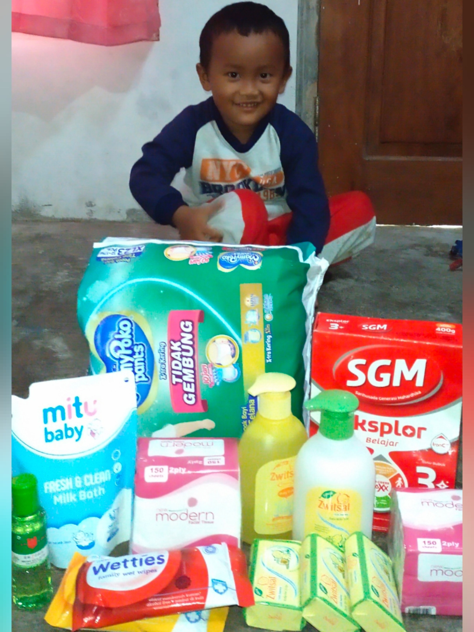 untuk membeli kebutuhan fadhil popok sekali pakai, susu formula 3+, Sabun mandi, minyak telon, multivitamin curcuma plus