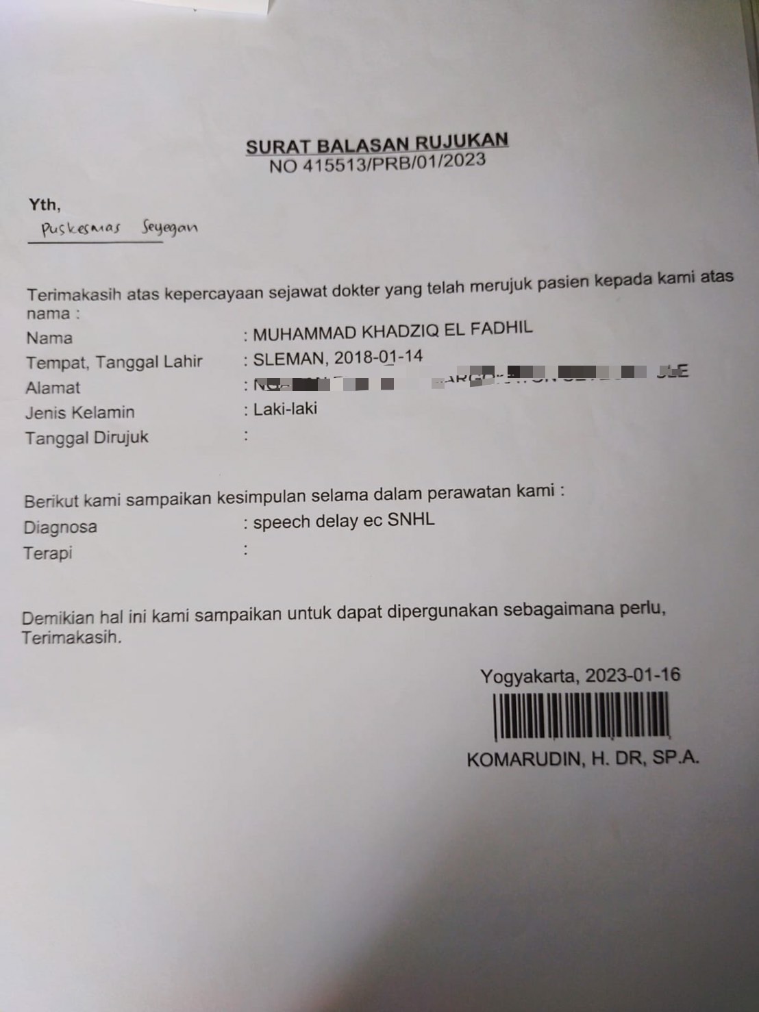 Fadil masih menjalani terapi di RS PKU Yogyakarta dan baru saja memperpanjang rujukan ke rumah sakit untuk melanjutkan kontrol ke dokter anak dan tumbuh kembang. Mohon doanya #TemanBaik, semoga keadaan Fadhil lekas membaik.