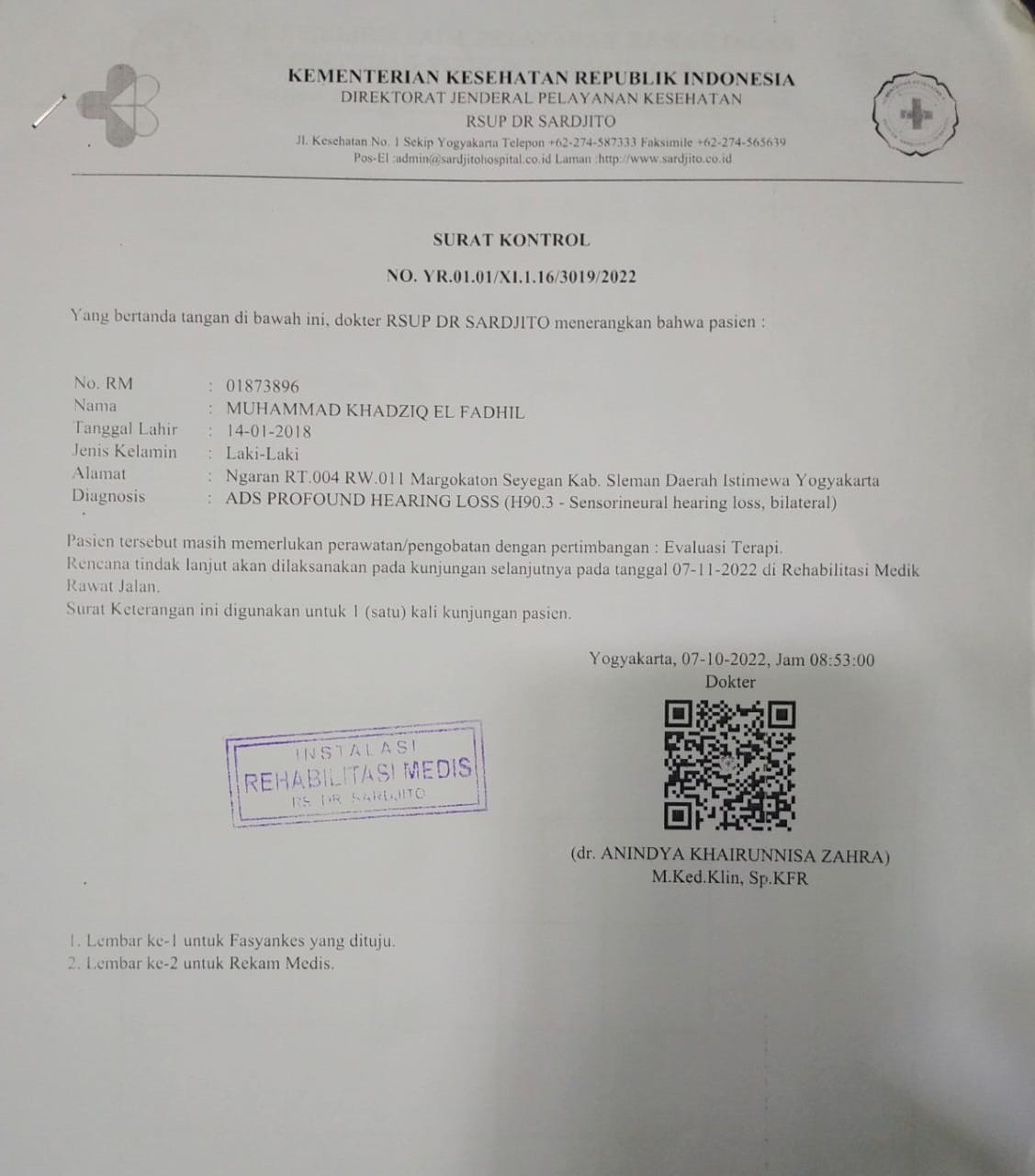 Fadhil kemudian dirujuk ke RSUP Dr. Sardjito untuk pemeriksaan lanjutan. Dari pemeriksaan CT scan lingkar kepala Fadhil normal, namun volume otaknya mengalami pengecilan/cerebri atrofi . Fadhil divonis mengalami global development delay (GDD) dan speech delay. Dari uji pendengaran dengan tes BERA, audiometri dan ASSR baru ketahuan kalau Fadhil juga mengalami gangguan pendengaran profound hearing loss SNHL 105 Desible telinga kanan kiri.