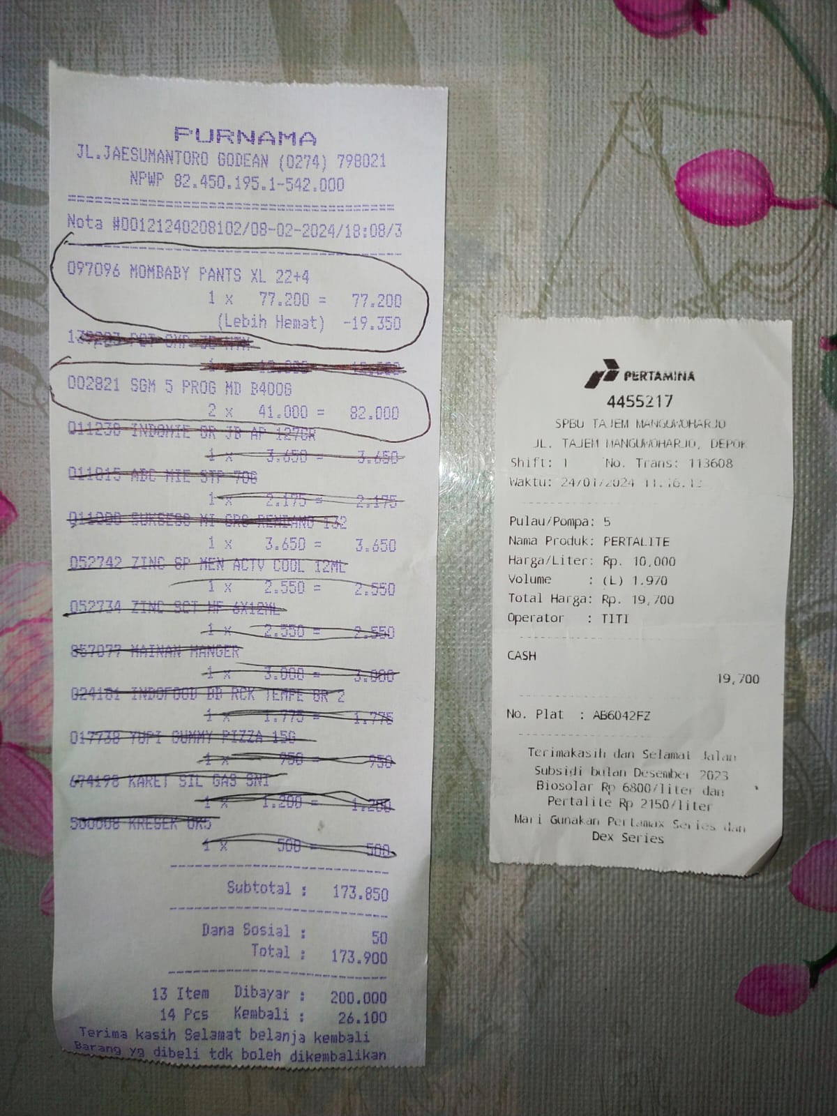 Dana digunakan untuk 1. Susu SGM 5+ Rp50.000 2. Pampers ukuran XL 2 pcs Rp100.000 3. Biaya bensin untuk 2 kali Rp40.000.