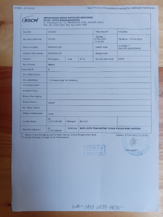 Mama Khaira sebagai calon donor sudah menjalani konsultasi ke poli madya RSCM, sekaligus menanyakan hasil biopsi mama Khaira (biaya untuk sekali konsultasi sebesar Rp. 254.000,-). Hasilnya ternyata di bagian hati mama Khaira ada sedikit masalah dan harus cek CK7 (imunopatologi per anti body) di patologi anatomi RSCM.