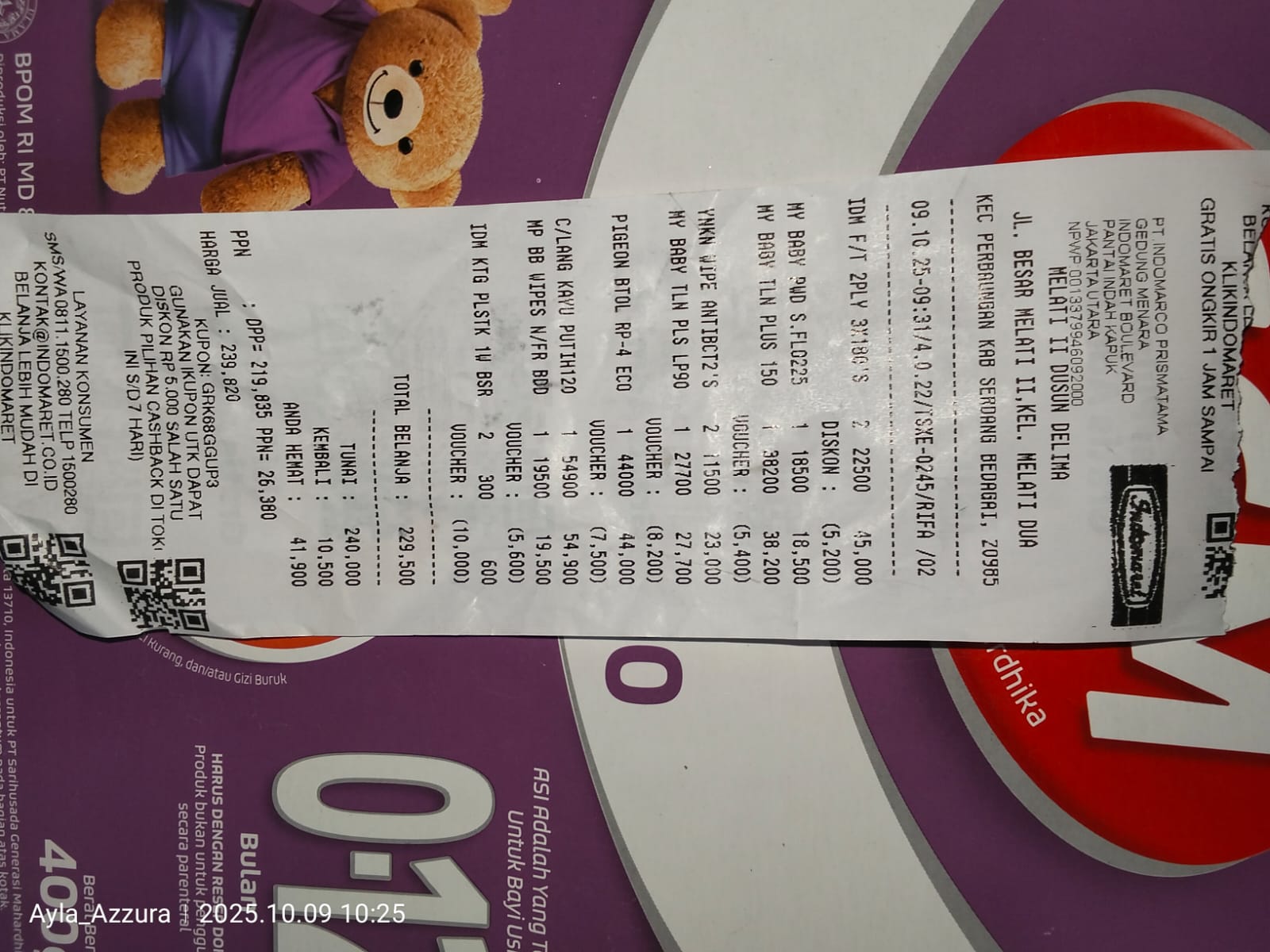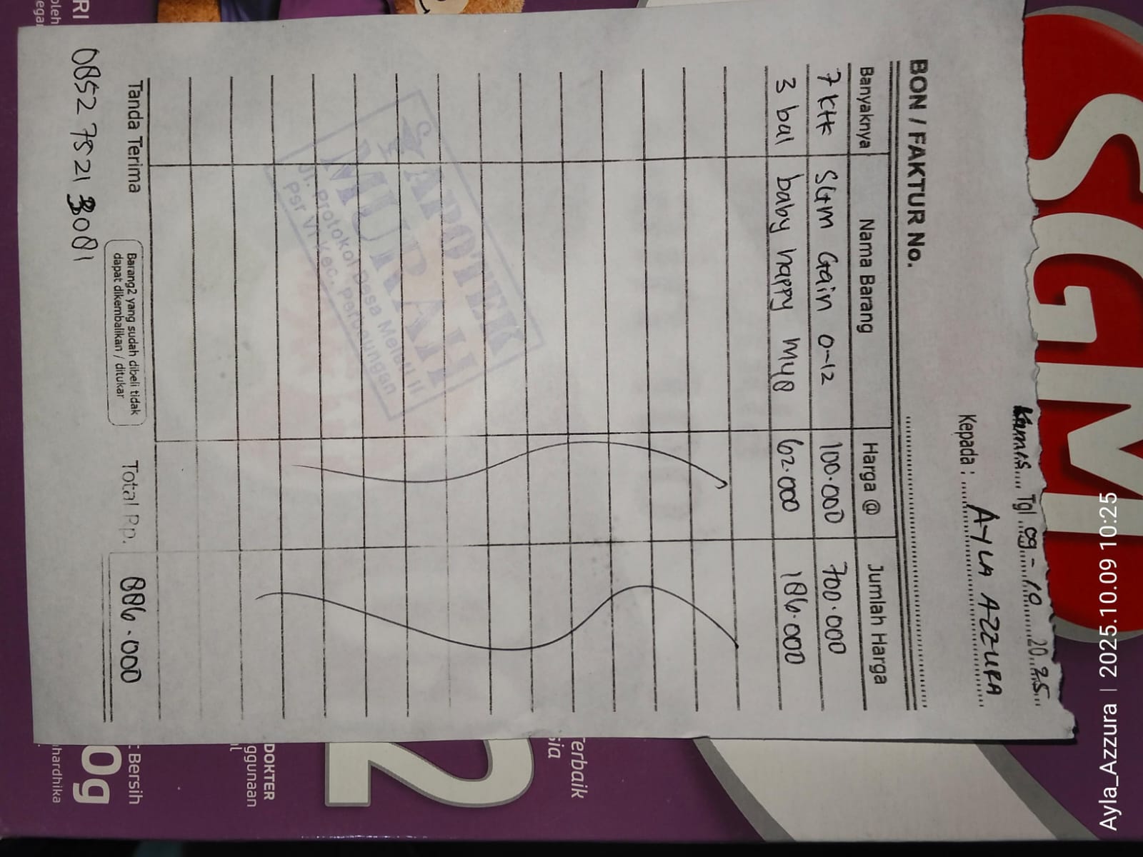 Dana digunakan untuk 1. Reimburse Susu SGM Gain 100 0- 7 kotak x Rp.100.000 =Rp.700.000 2. Reimburse Baby happy size M-48 3bal x Rp.62.000 = Rp186.000 3. Reimburse biaya transportasi ke RS Rp62.000 4. Reimburse Tisu kering 2 pcs Rp.39.800 5. Reimburse bedak baby powder Rp Rp18.500 6. Reimburse Minyak telon Plus150 Rp. 32.800 7. Reimburse Tisu basah antibiotik 2 pcs Rp 23.000 8. Reimburse Minyak Telon plus90 1 pRp.19.500 9. Reimburse Pigion 1 pcs Rp.36.5002025-10-15 09:01:34
