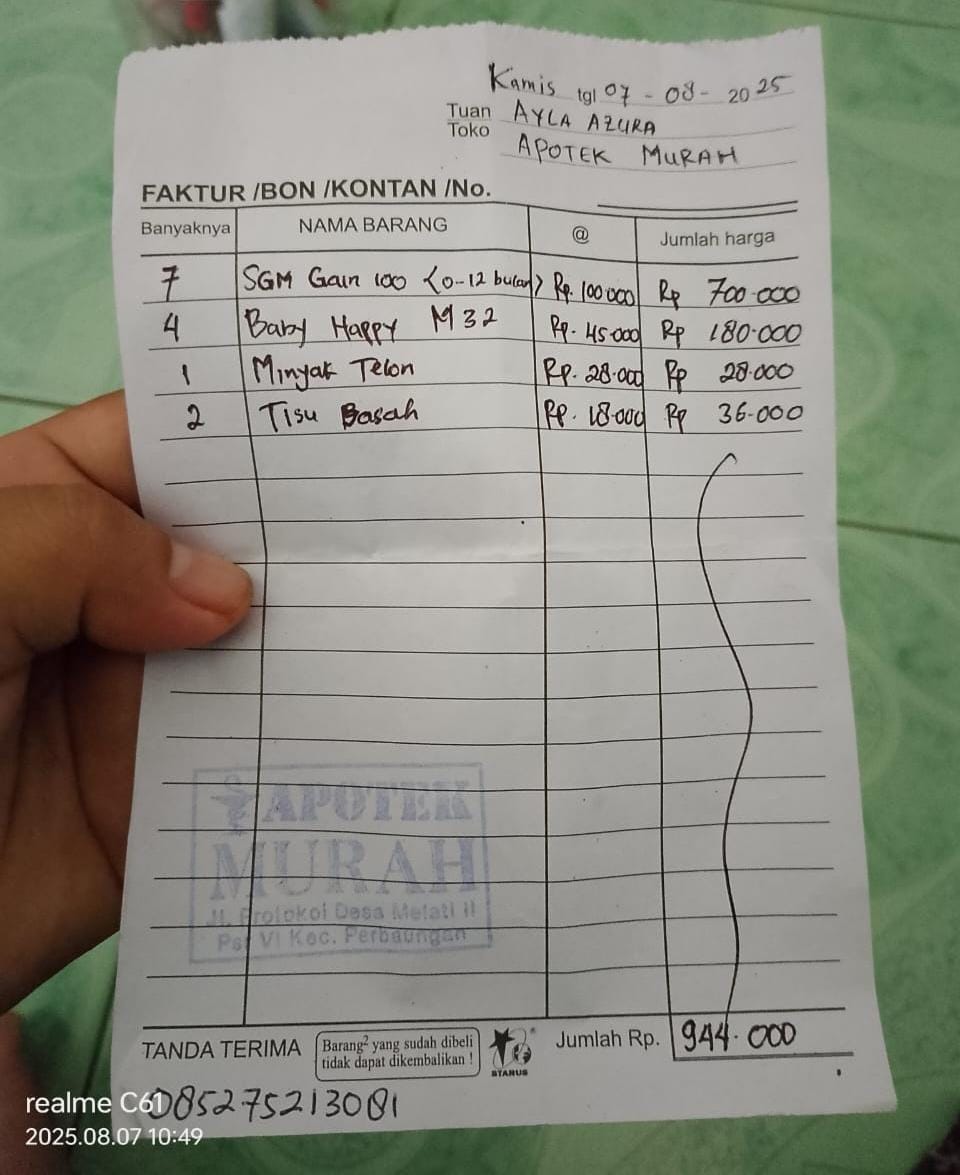 Dana digunakan untuk 1. Reimburse Susu SGM gain 100 Rp100.000 x 7 dus =Rp700.000 2. Reimburse Pampers baby happy M32 Rp45.000 x 4 ball= Rp180.000 3. Reimburse minyak Telon Rp28.000 4. ReimburseTisu basah Rp18.000 x 2 pcs =Rp36.0002025-08-11 09:01:13