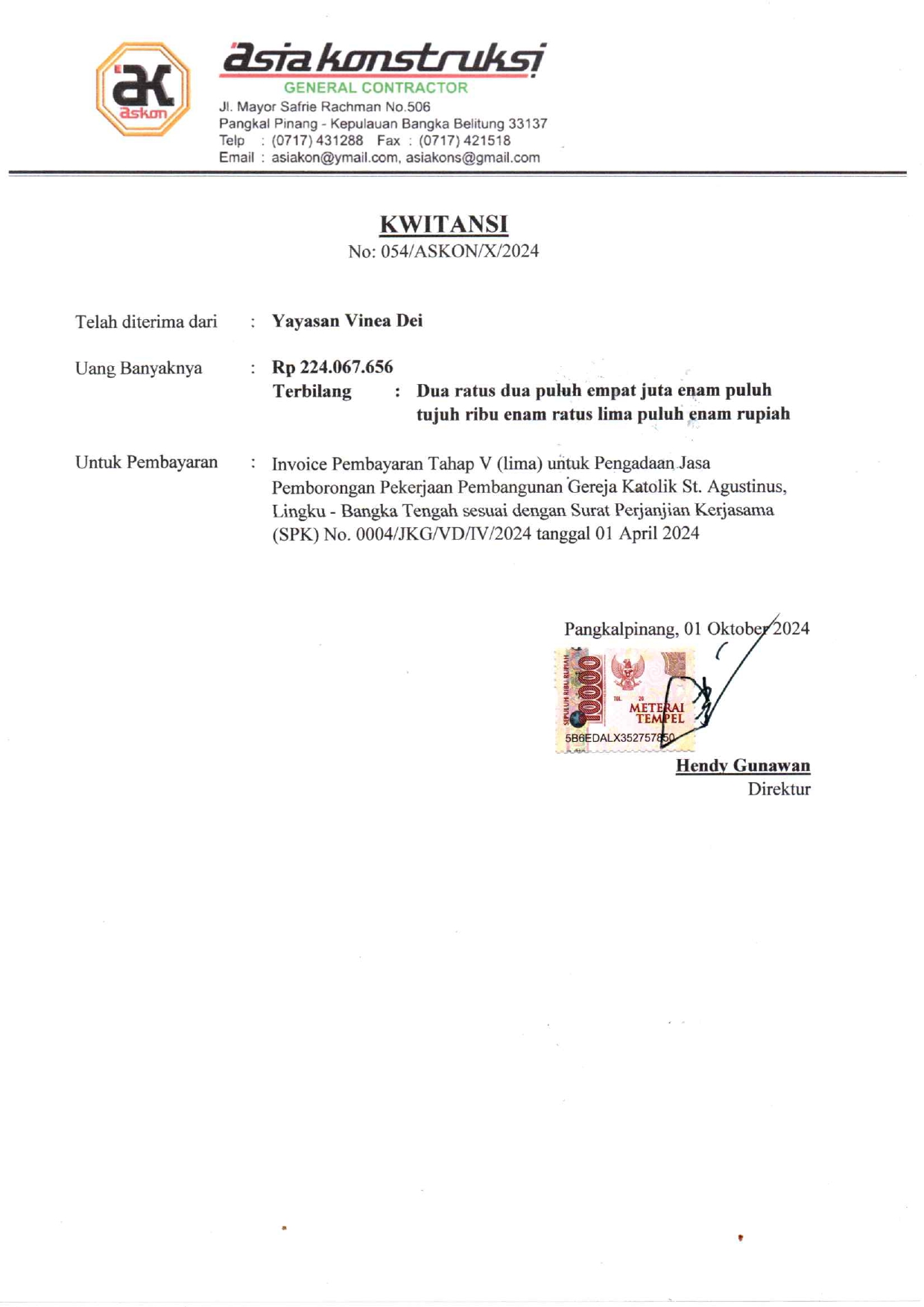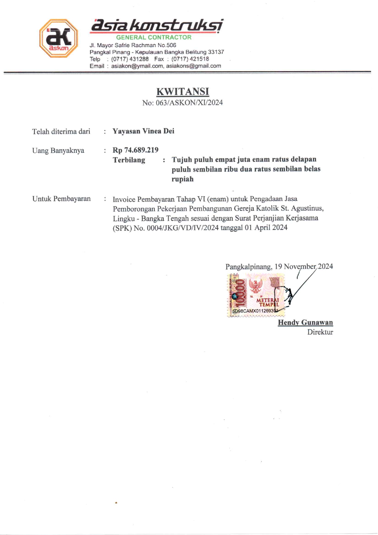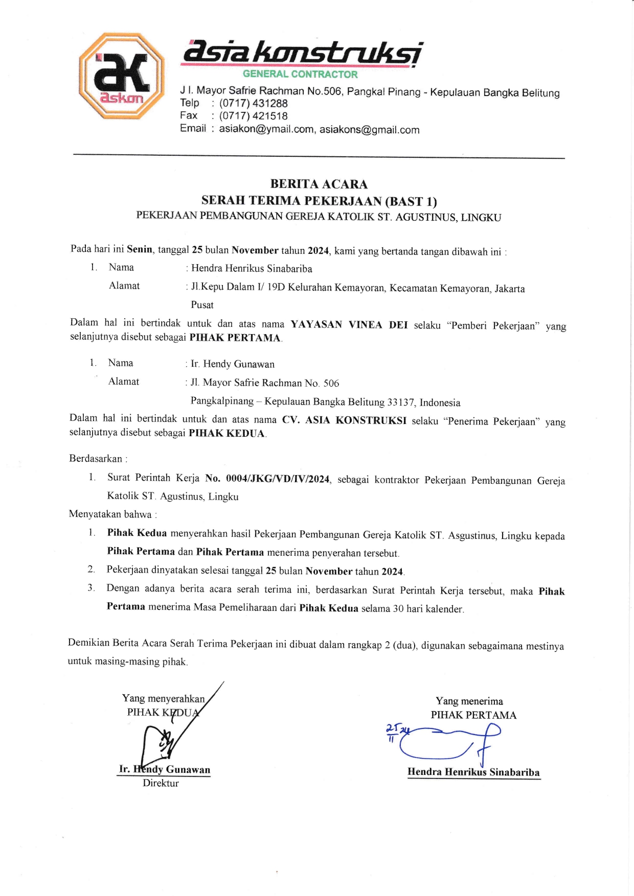Sebagai bentuk transparansi, kami bagikan foto-foto kondisi gereja yang baru selesai dibangun. Kami juga melampirkan kwitansi pelunasan biaya pembangunan tahap V (sebagian) dan tahap VI (penuh) dari kontraktor, yang semuanya didukung oleh donasi #TemanBaik, serta Berita Acara Serah Terima bangunan yang menandakan bahwa pembangunan gereja telah selesai dilaksanakan.
