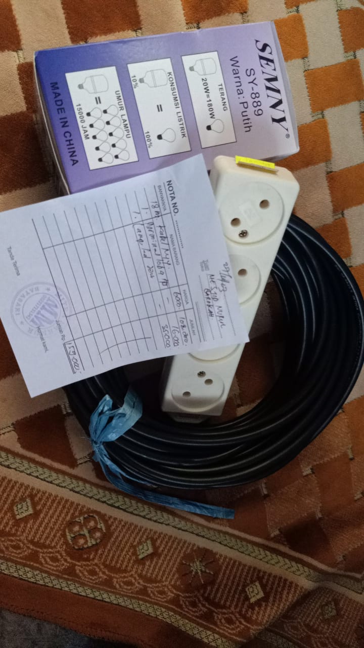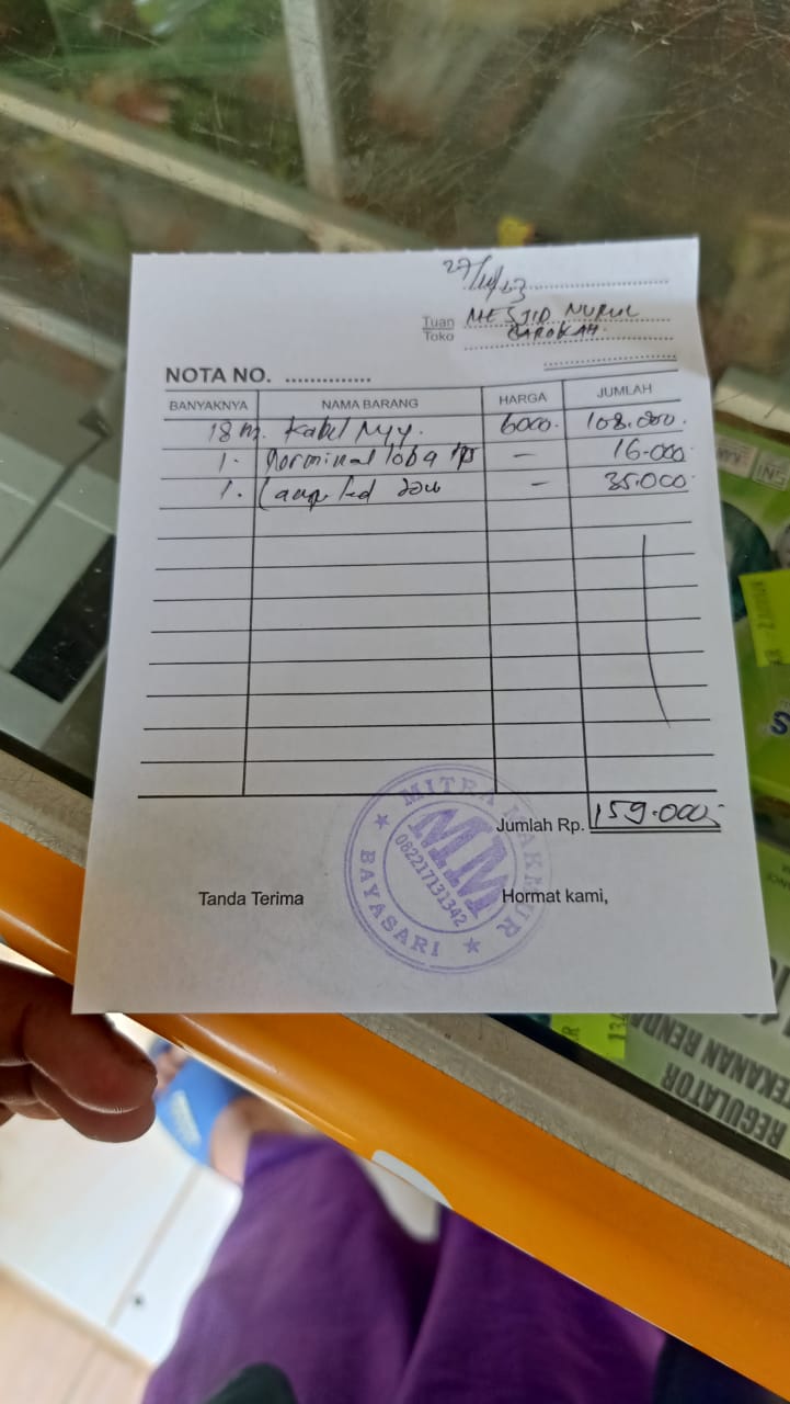 Dana digunakan untuk 1. Lampu masjid 70.000 x 3= Rp210.000 2. Kabel 6.000 x 15 meter= Rp90.000.2024-01-09 18:01:53