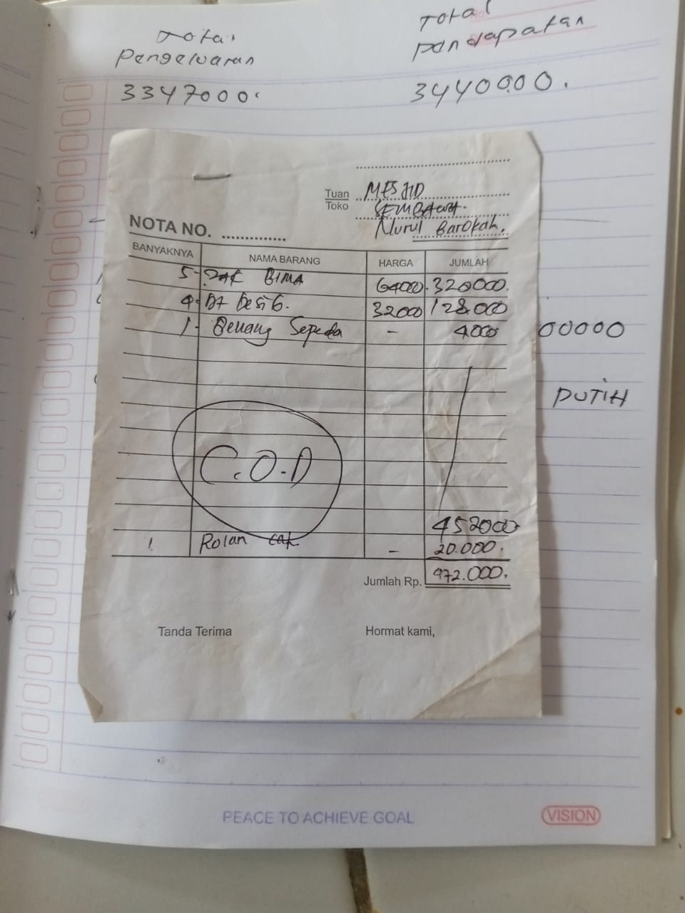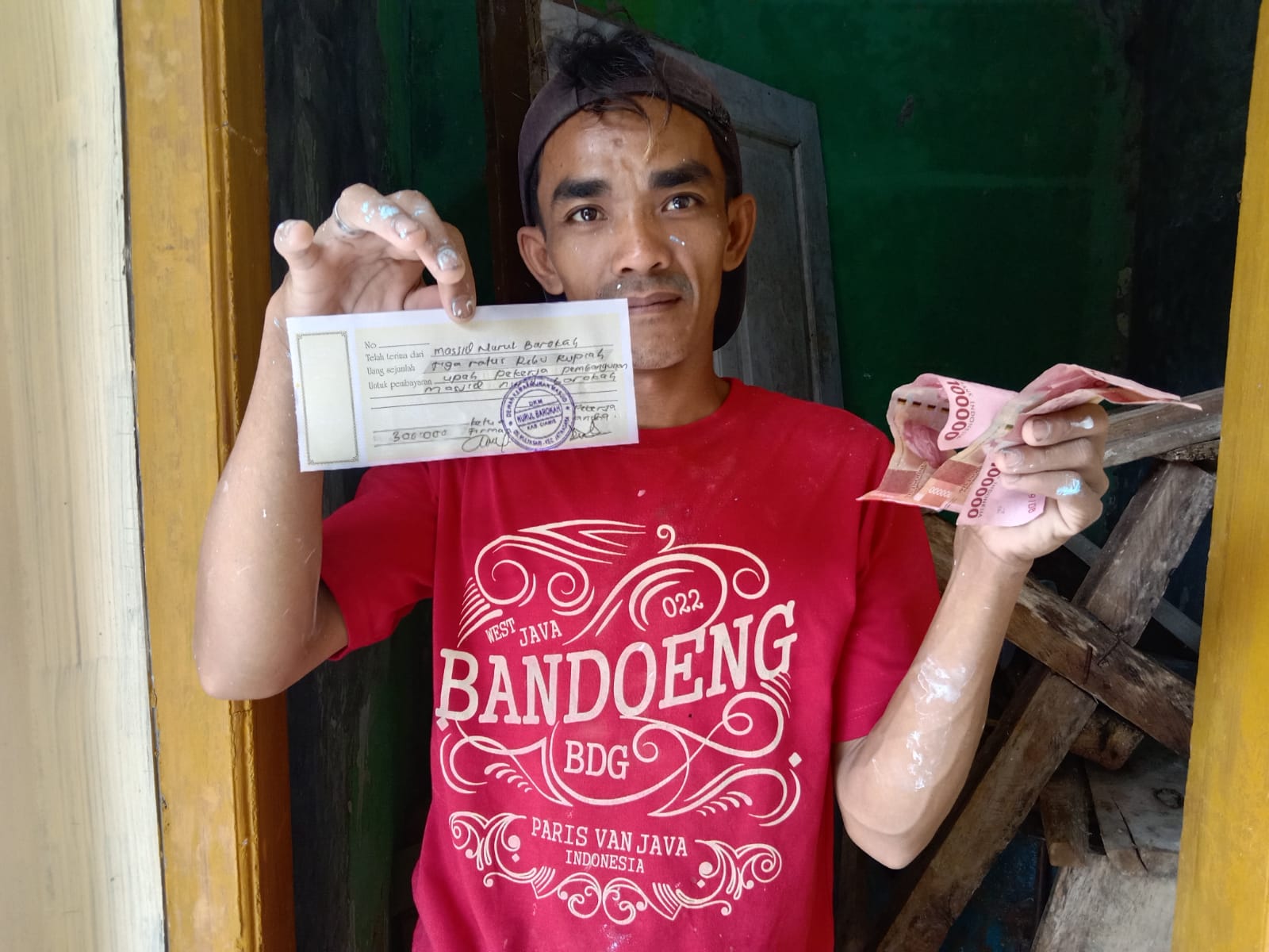 dan sisa donasi yang terkumpul kami gunakan untuk tambahan upah 1 orang pekerja waktu satu minggu Rp.1.050.000 yang tertera di nota hanya Rp.300.000 sesuai rencana di penarikan,