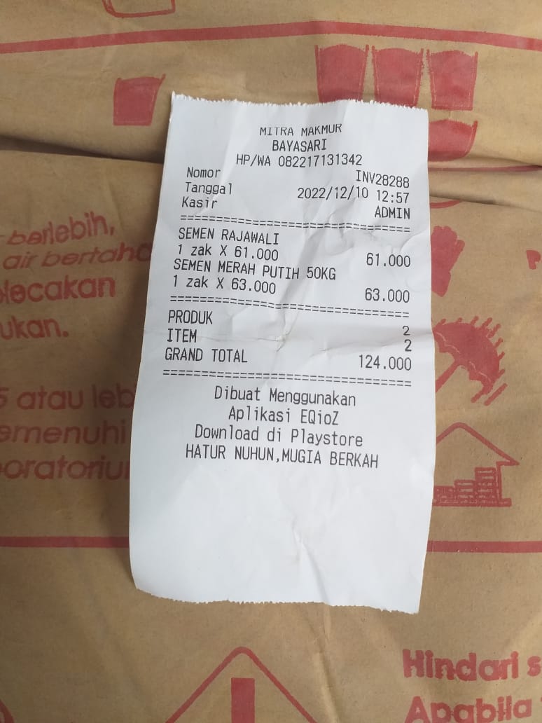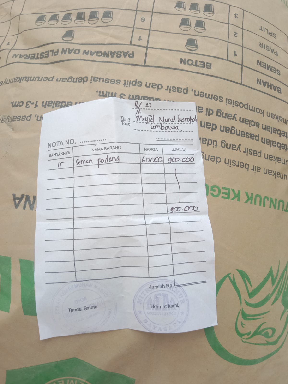 Donasi dari TemanBaik sudah digunakan dengan baik untuk pembelian 1 sak semen.