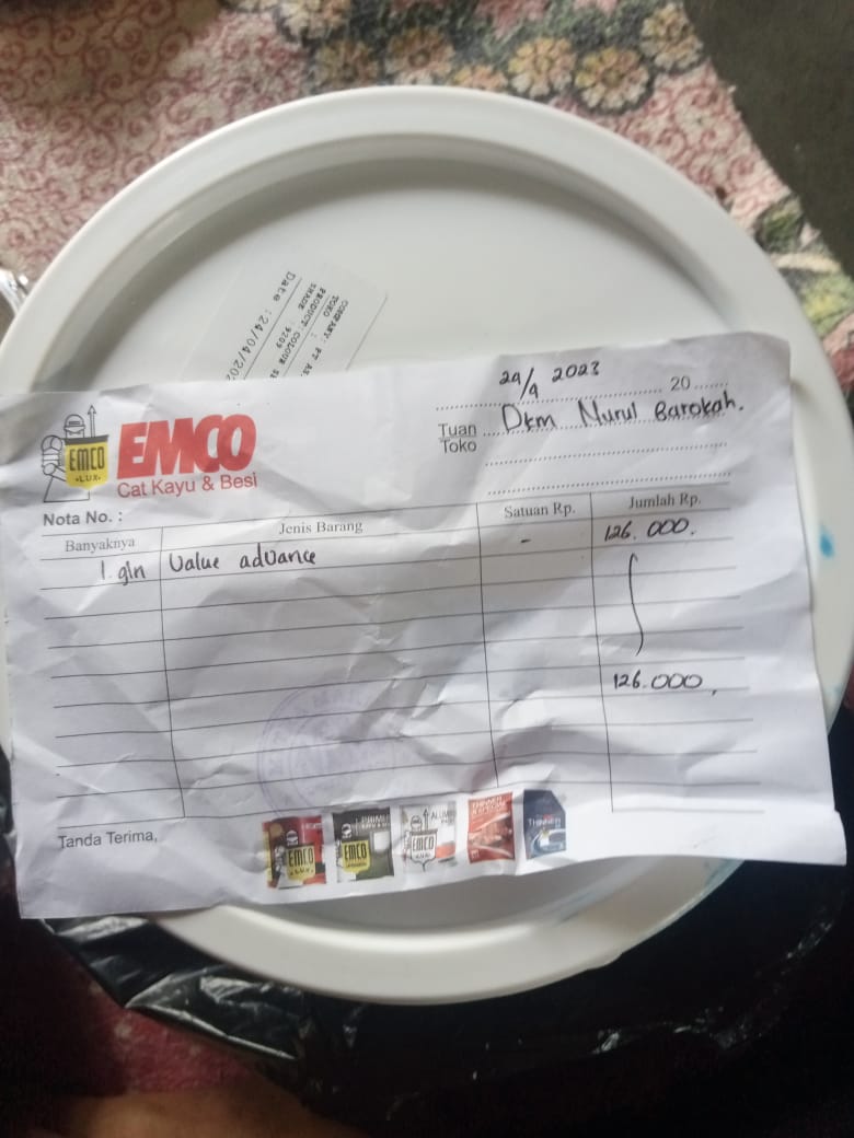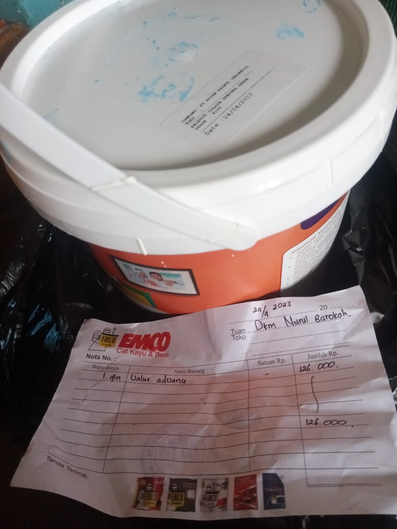 Donasi yang sudah terkumpul sudah digunakan dengan baik untuk pembelian cat. Oya, karena harga cat lebih murah dari perkiraan awal, jadi sisanya kami gunakan untuk membeli rol dan kuas. Pembelian kami lakukan di beda toko sehingga tidak ada notanya. Semoga bisa dimaklumi ya TemanBaik.