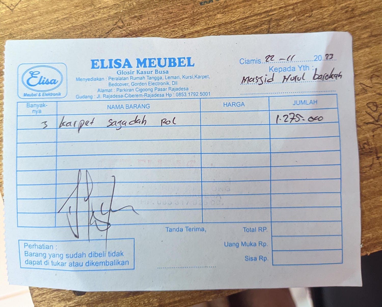 Dana digunakan untuk pembelian karpet masjid.2023-11-21 18:17:28