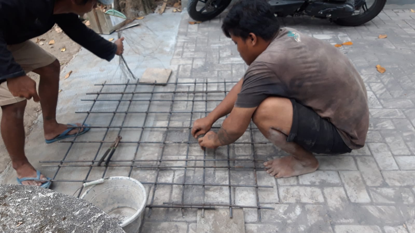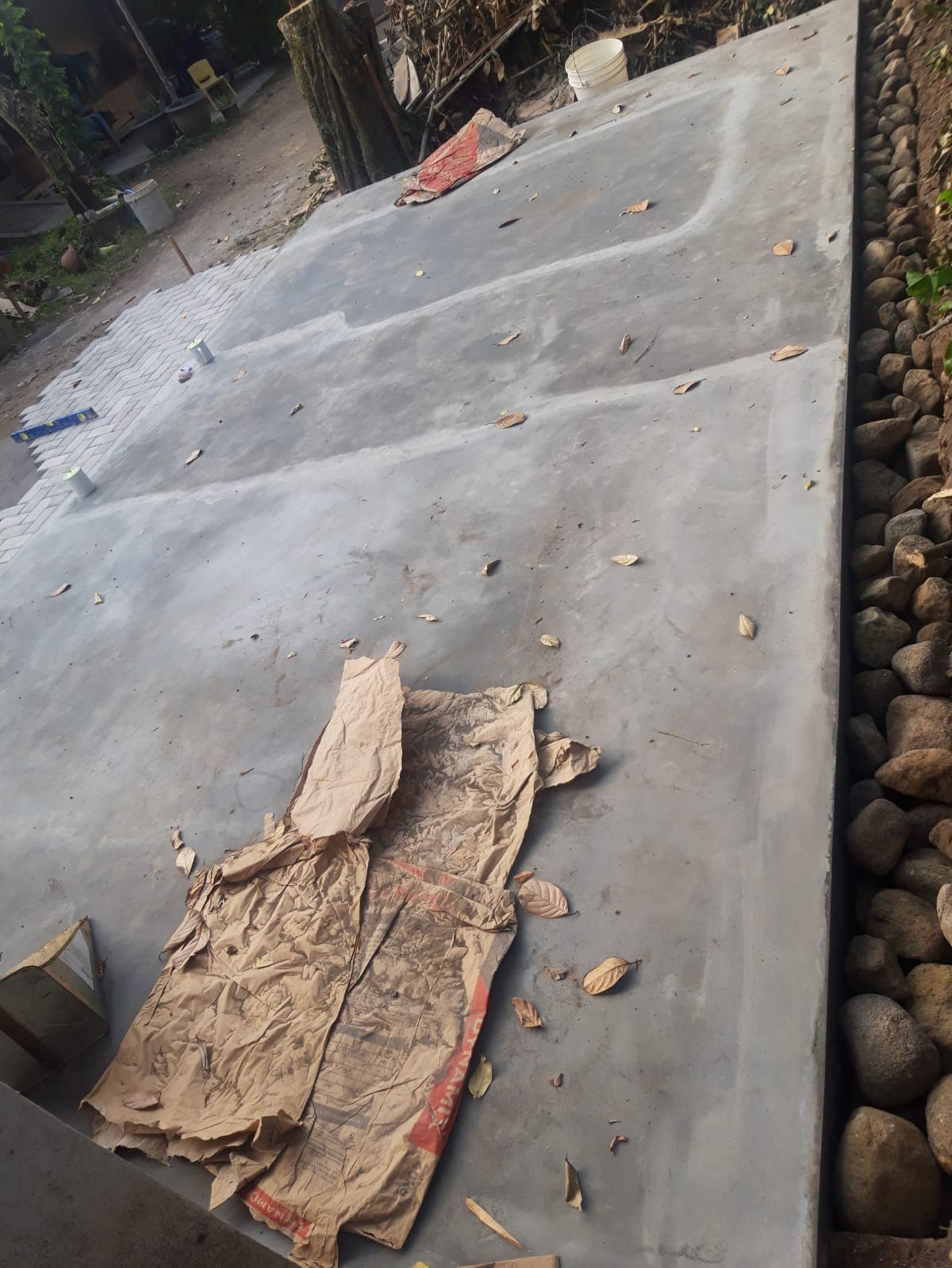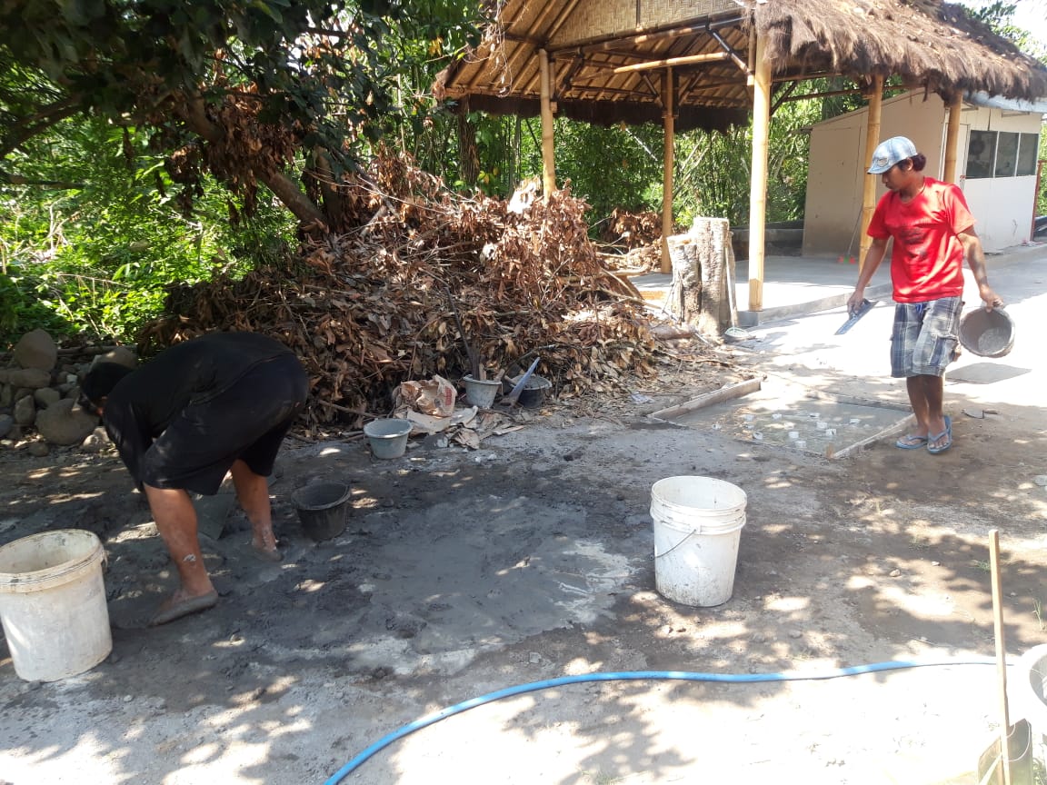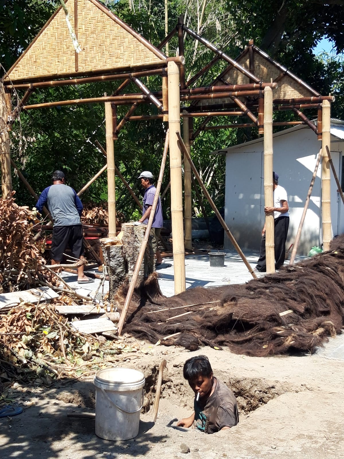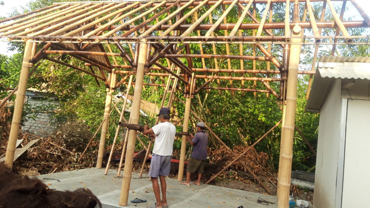 Pada tanggal 4 Mei 2023, pembangunan dimulai. Tahap pertama, kami membuat lantai untuk mendirikan rumah bambu agar kuat dan aman karena letak bangunan berada di dekat sungai irigasi yang memiliki kedalaman tebing sekitar dua meter. Maka lantai ini kami pondasi, di atasnya ada konstruksi beton ring melingkar, bagian atas ditutup plester. Selama enam hari proses berjalan sampai jubin kasar.