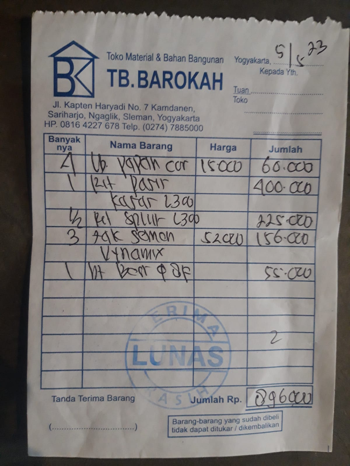 Dana digunakan untuk 1. Bangunan bambu Rp10.000.000 2. Pasir 400.000 x 3 pick up= Rp1.200.000 3. Batu 1 pick up Rp400.000 4. Semen 52.000 x 15 sak= Rp780.000 5. Besi (ukuran 8) 55.000 x 5 batang= Rp275.000 6. Begel (20 kg ukuran 8 x 12) Rp340.000 7. Kawat bendrat 18.000 x 2 kg= Rp36.000 8. Papan cor 15.000 x 6 lembar= Rp90.000 9. Paku reng bambu 1 kg Rp18.000 10. Benang 2.500 x 2 buah Rp5.000 11. Batako 3.200 x 150 biji= Rp480.000 12. Paving blok 80.000 x 3 x 10 meter= Rp2.400.0002023-05-10 15:26:12
