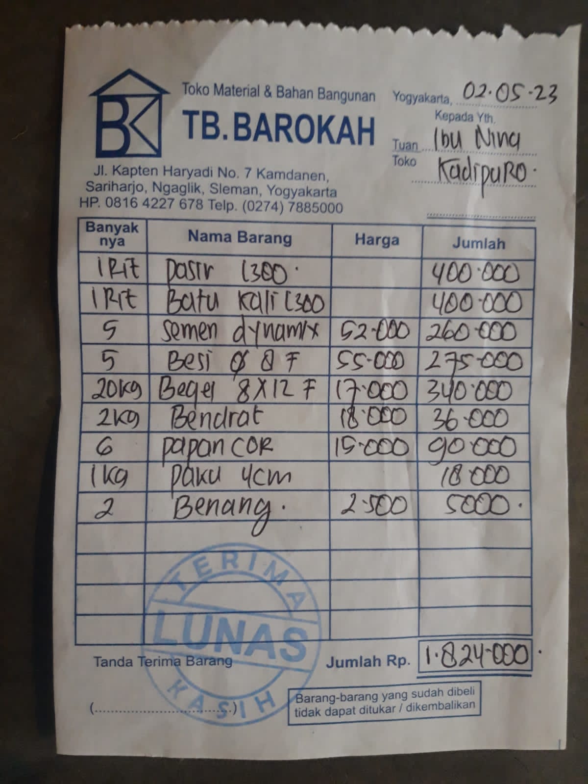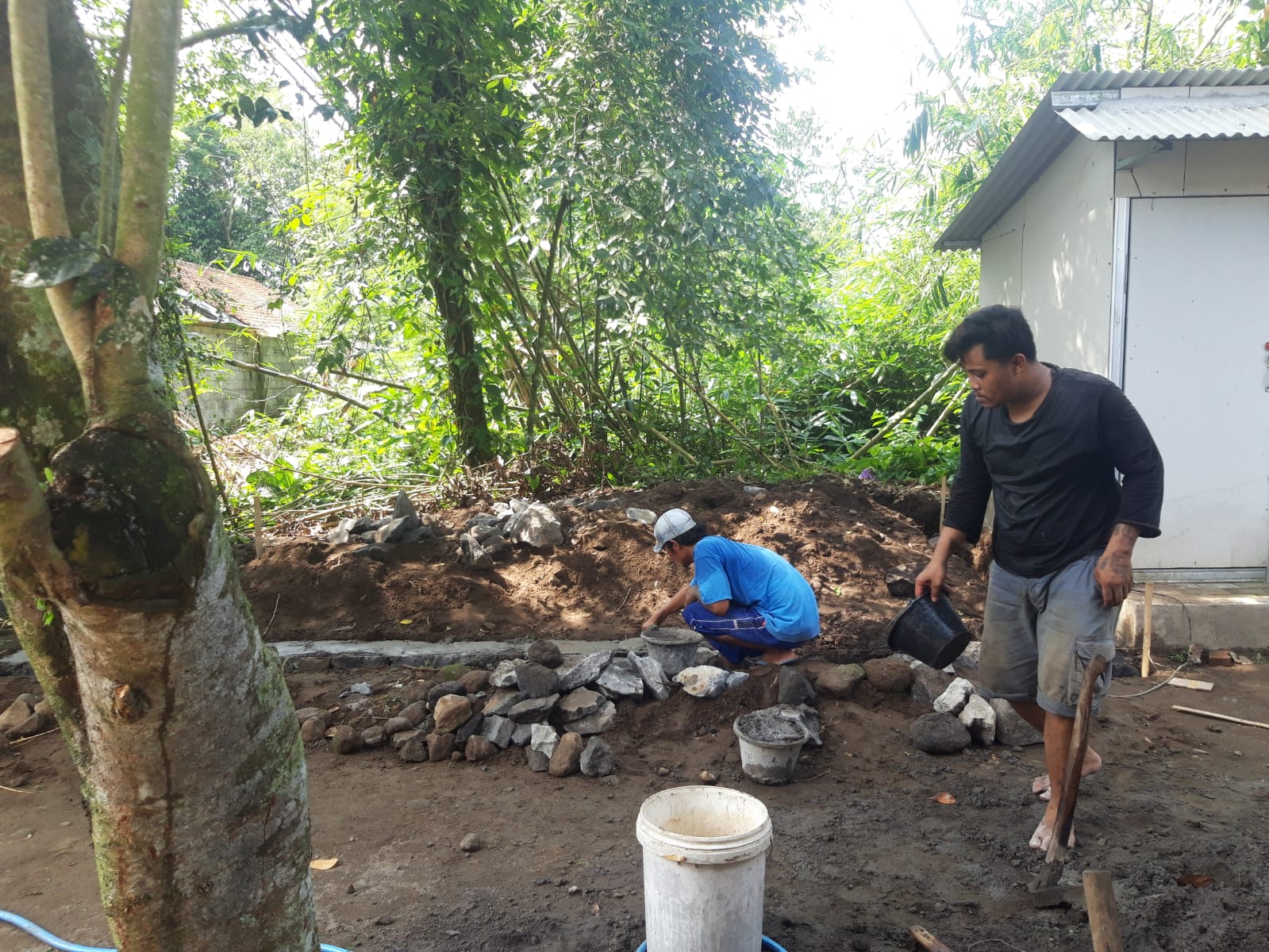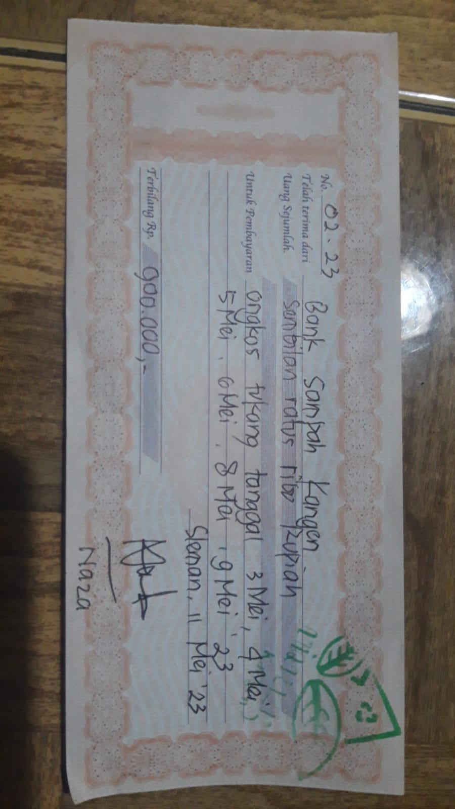 Pada akhir bulan April 2023, kami membuat rencana. Ada tiga hal yang akan kami bangun yakni rumah bambu, resapan, dan memasang konblok di depan BS KaNgen. Kami ingin mengabarkan bahwa bantuan dana sebesar Rp 23.149.000 telah digunakan dengan baik untuk biaya bangunan bambu, batu pickup, semen, besi, paku, paving blok, dan lainnya.
