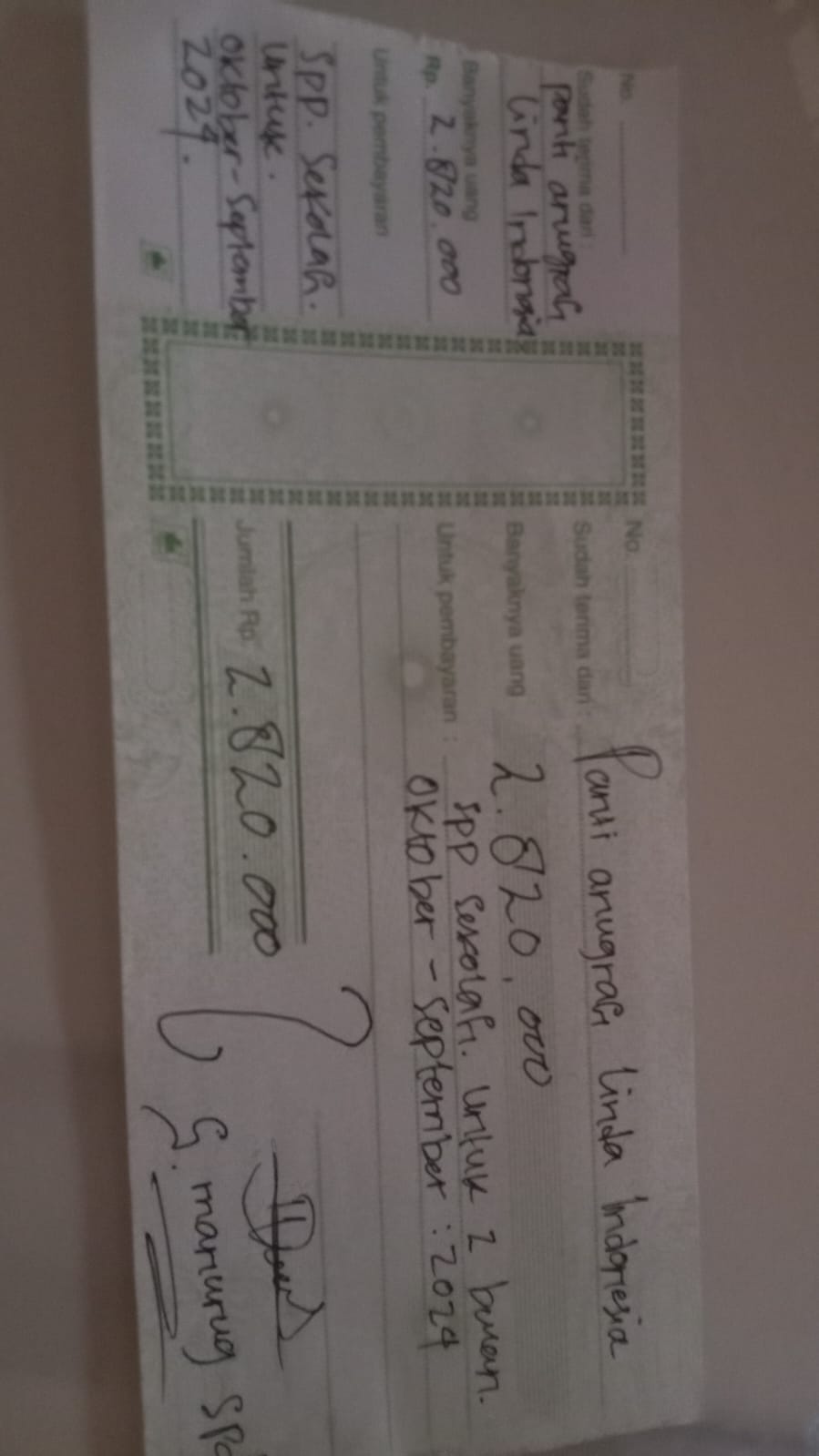 Dana digunakan untuk 1. Beras 10kg Rp135.000 x 20karung = Rp2.700.000 2. Minyak goreng 1liter isi 12pac Rp15.000 x 2 kardus = Rp360.000 3. Gula pasir Rp. 18.000 x 19 kg = Rp342.000 4. Sarden asahi isi 24pac Rp.8.000 x 1kardus = Rp192.000 5. Susu kaleng kecil Rp10.000 x 24kaleng = Rp240.000 6. Indomie goreng (mie instan) isi 40pcs Rp80.000 x 10 kardus = Rp800.000 7. Detergen daia kecil Rp5.000 x 72pcs = Rp360.000 8. Royko Rp10.000 x 10 bungkus = Rp100.000 9. Uang SPP Rp2.820.0002024-08-27 10:57:25