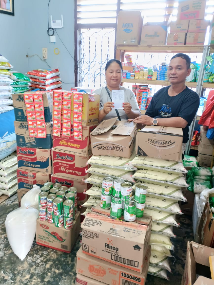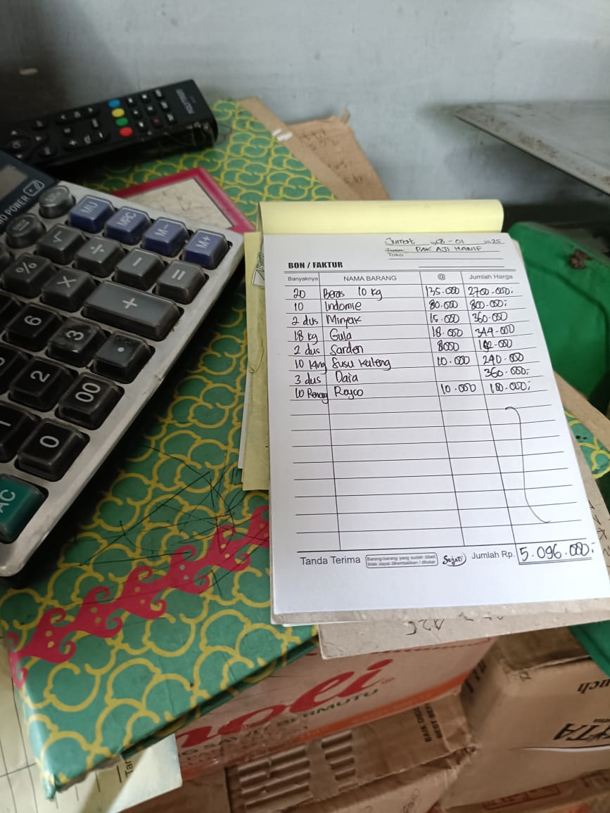 1. Beras 1 karung 100kg Rp135.000 x 10 karung = Rp1.35.000 2. Minyak goreng 1 liter Rp15.000 x 12 pcs = Rp180.000 3. Gula pasir 1 kilo Rp18.000 x 5 pcs = Rp90.000 4. Sarden Rp8.000 x 24 pcs = Rp192.000 5. Susu kaleng Rp10.000 x 2 kardus = Rp240.000 (perkardus isi 24) 6. Indomie goreng isi 40 Rp80.000 x 10 kardus = Rp800.000 7. Deterjen pakaian ukuran kecil 3 dus isi 72 Rp5.000 = Rp360.000 8. Royko Rp10.000 x 10 bungkus = Rp100.000 9. Kaos Rp45.000/ pcs x 35 = Rp1.575.000.2025-01-24 09:54:20