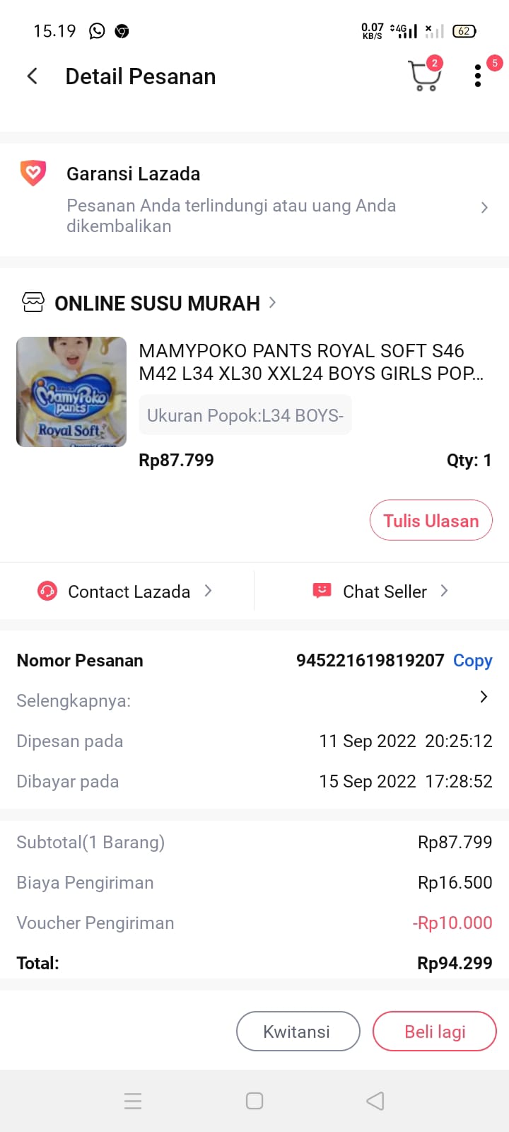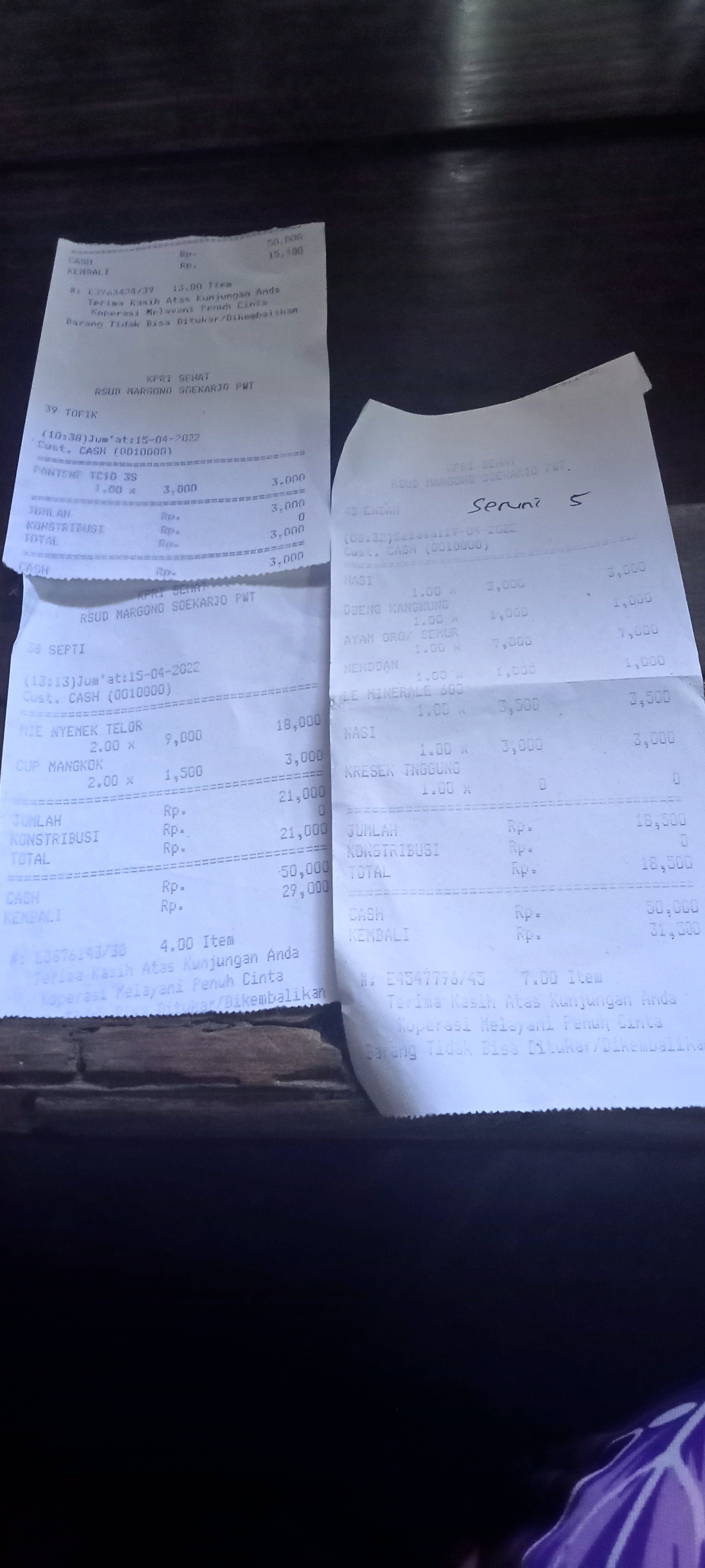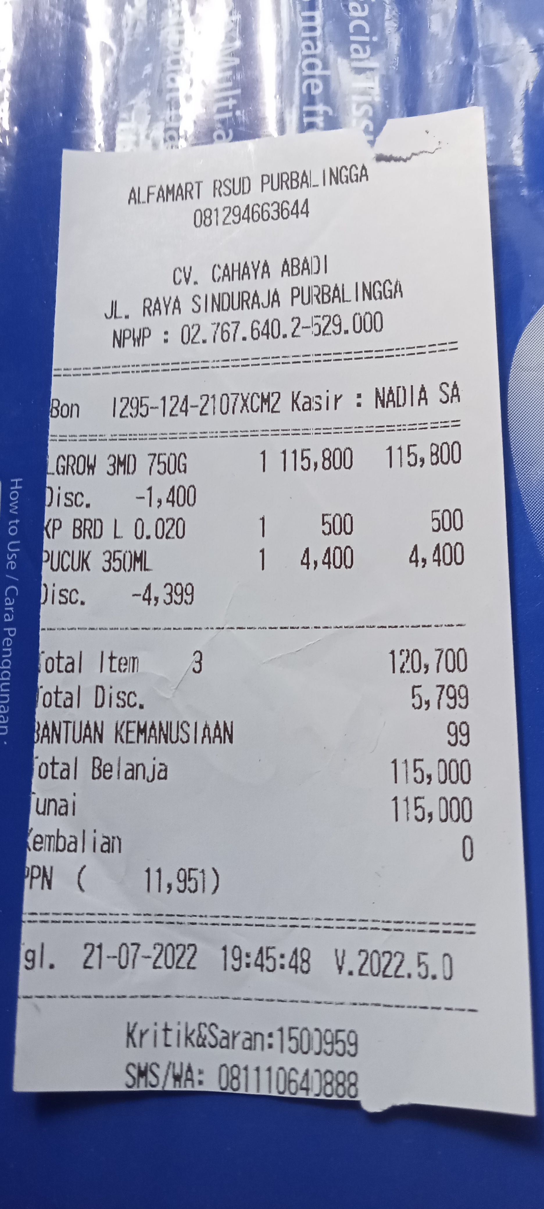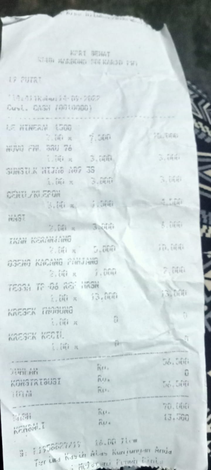 Underpad persiapan OP penutupan kolostomi 19×8 = 152.000 Popok sekali pakai model perekat persiapan OP penutupan kolostomi 170.000 Susu lactogrow 1Kg 136×6 =816.000 Plastik dan dobletape 80.000 Bpjs 300.000 NACL 11.000×10 = 110.000 Ultrafik 25.000×4 = 100.000 Tisu nice isi 900, 50.000 Popok sekali pakai L 44 pcs ,isi 4 model celana 328.000 Tisu basah 20.000×5 = 100.000 Operasional RS = 300.0002022-07-21 18:19:45