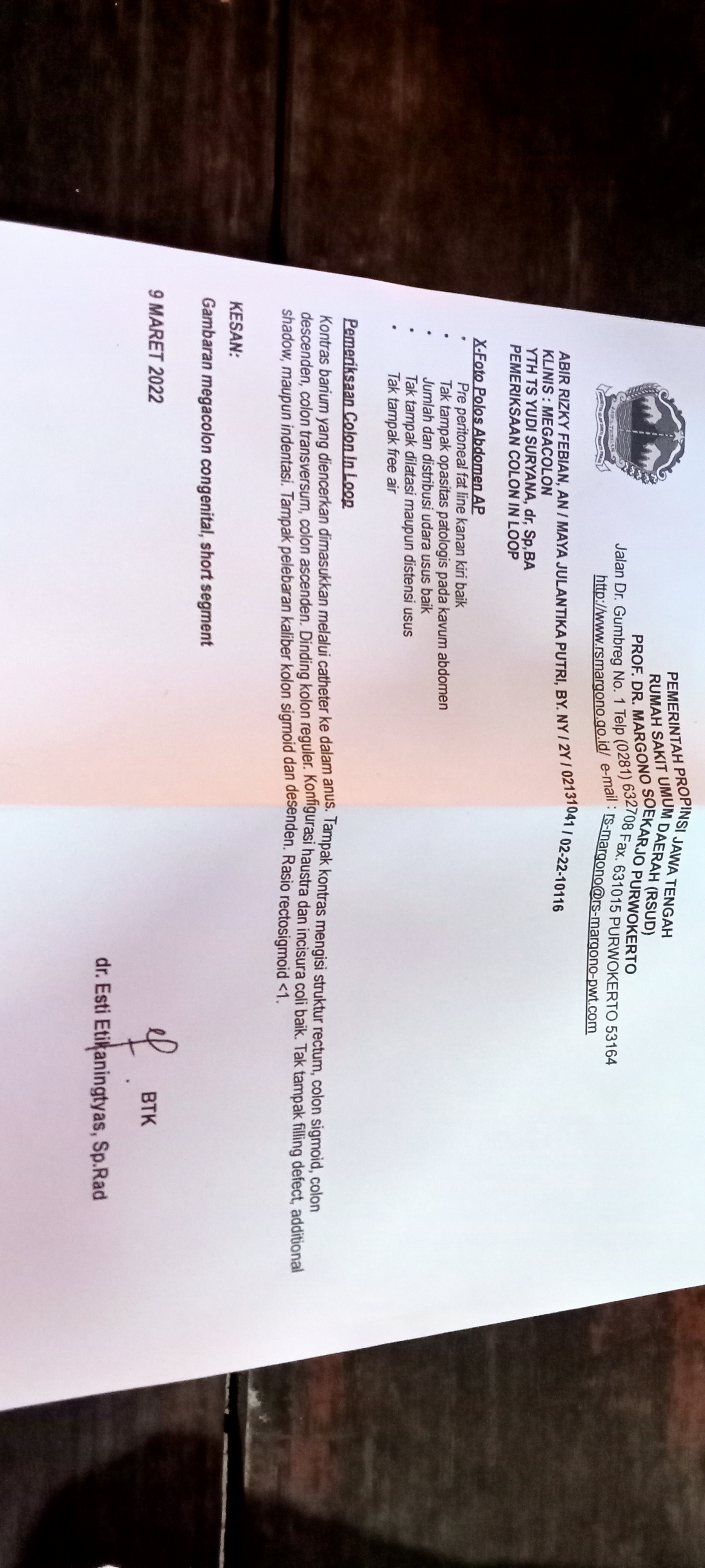 Dari hasil Rontgen Colon In Loop ( CIL ) adik Abir diharuskan operasi kolostomi ulang karena kondisi ususnya sudah bengkak.