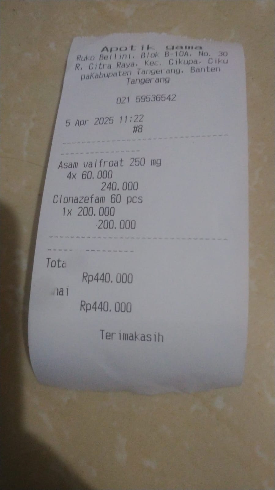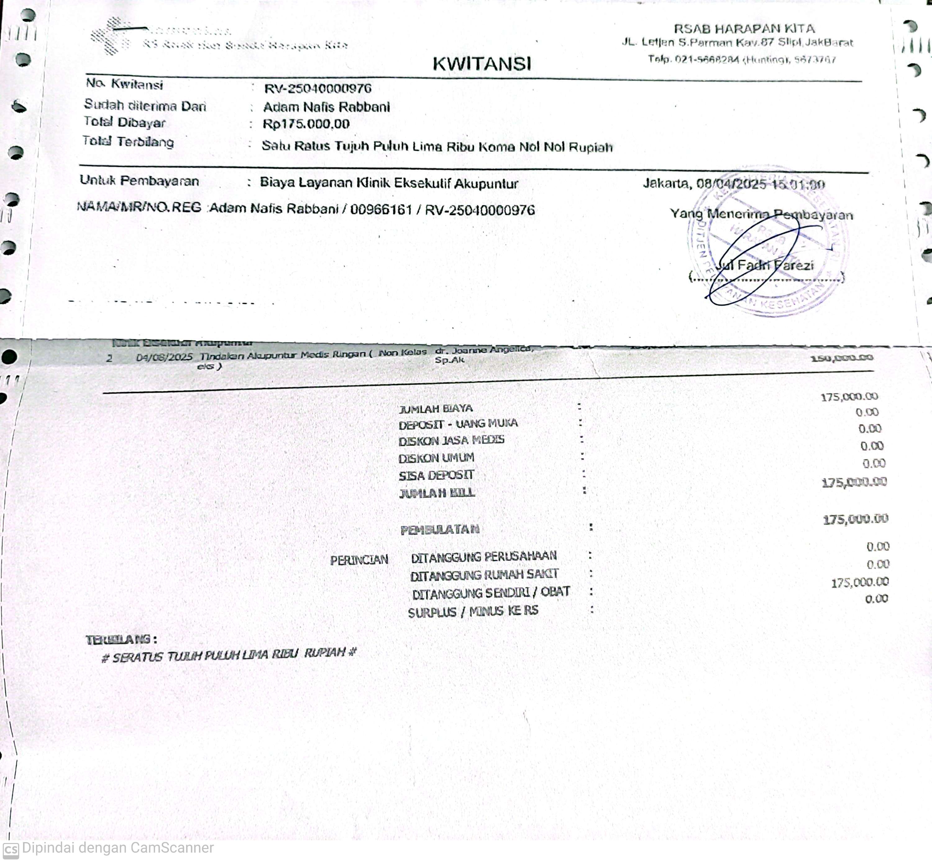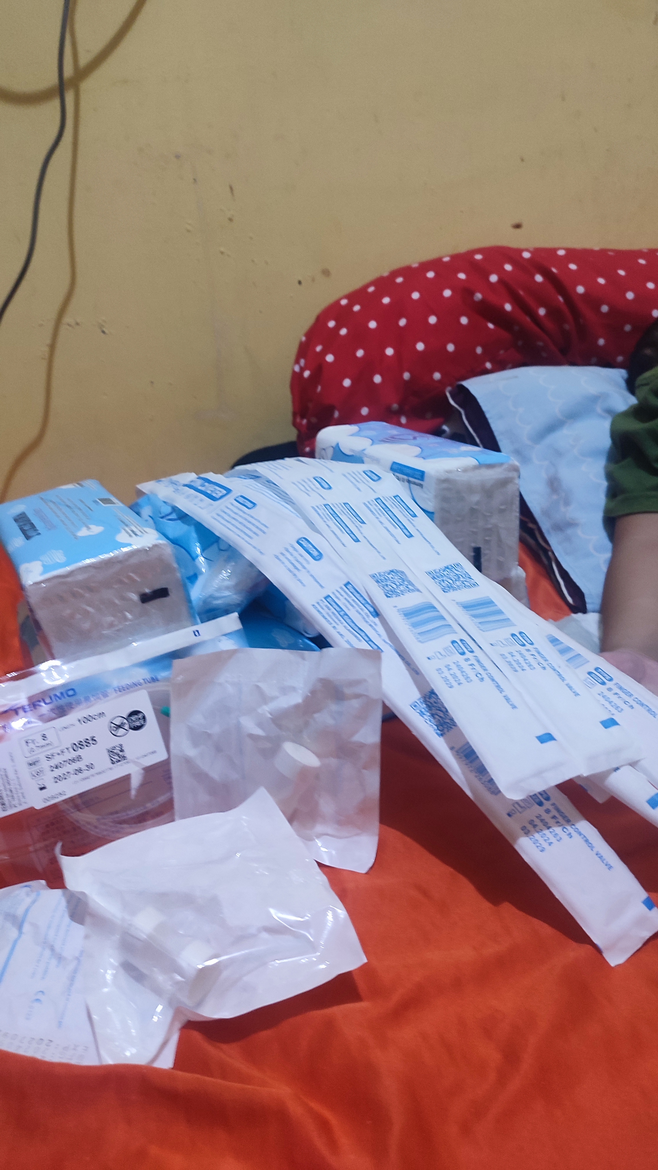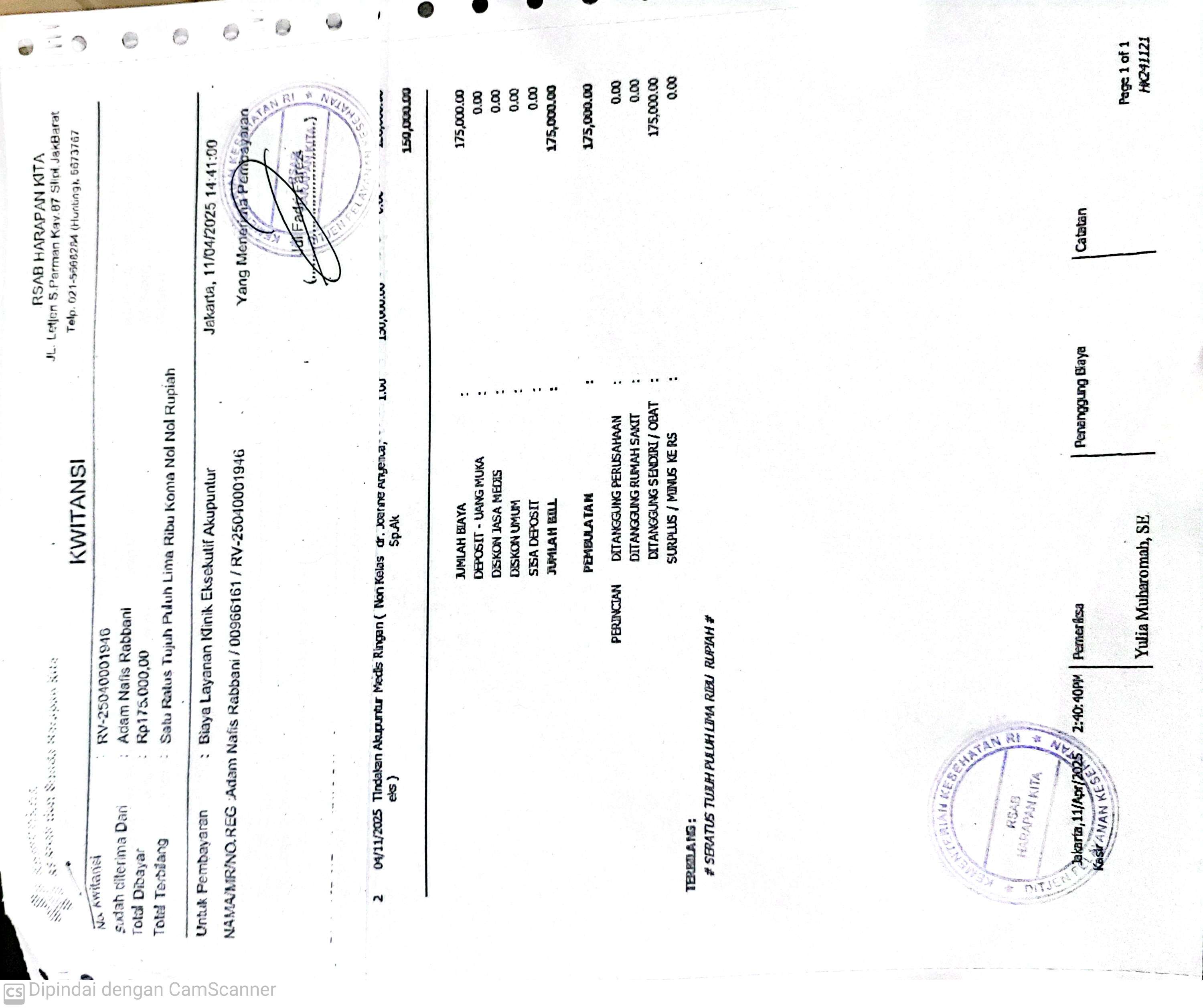 Rembesan Pempes mamy poko size xxl @1 71.000 x 5 pcs = 355.000 Chilkid reguler 314.000 x 2 = 600.000 Probaby liquid 1 pcs = 22.500 Isocal susu nestle x 2 = 120.600 x 3 = 361.800 Suction catheter selang fr 8 1@3000 x 5 = 15.000 + biaya layanan Rp. 792 = 15.792 Terumo ngt fr 8 = 21.000 + biaya layanan (1.108) = 22.108 HME filter trakeostomi @1 22.500 x 3= 67.500 Nestle isocal @2 120.600 x 2 = 241.200 Tisu pket isi 10 = 52.370 Ventolin nebu = 10 x 11.000 = 110.000 Total =Rp 1.749.2702025-03-26 09:46:17