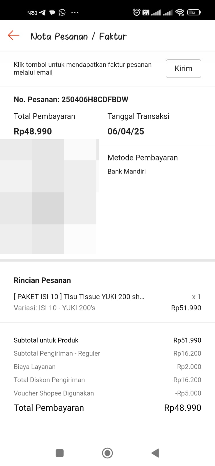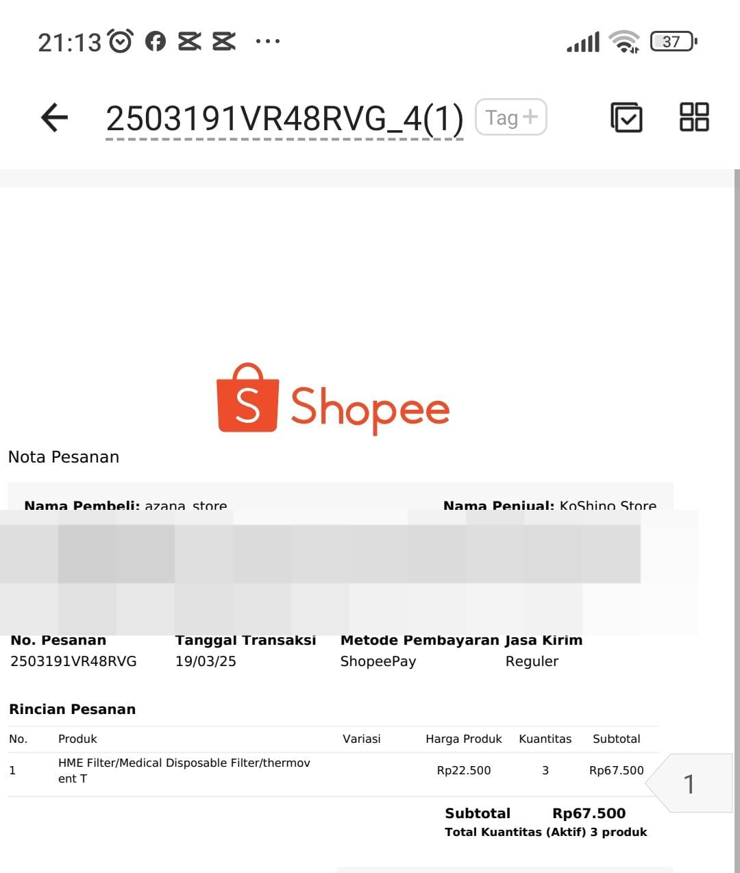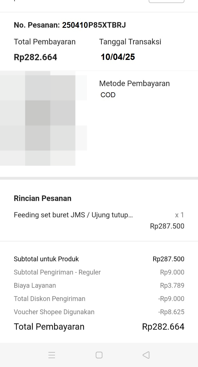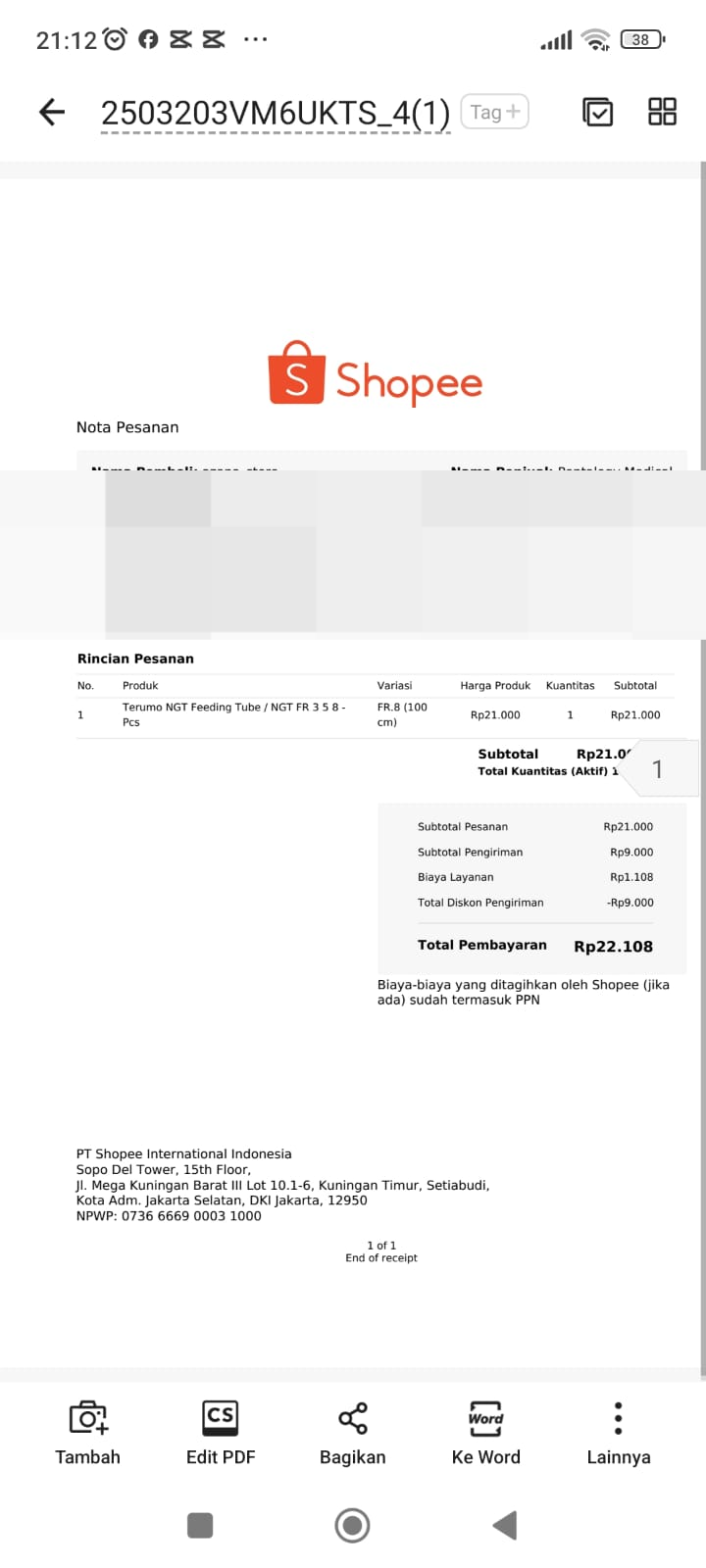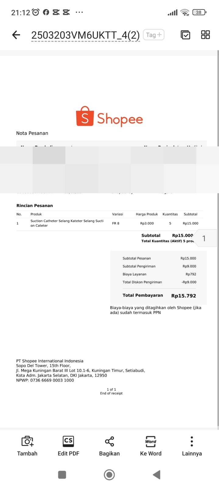 Rembesan Pempes mamy poko size xxl @1 71.000 x 5 pcs = 355.000 Chilkid reguler 314.000 x 2 = 600.000 Probaby liquid 1 pcs = 22.500 Isocal susu nestle x 2 = 120.600 x 3 = 361.800 Suction catheter selang fr 8 1@3000 x 5 = 15.000 + biaya layanan Rp. 792 = 15.792 Terumo ngt fr 8 = 21.000 + biaya layanan (1.108) = 22.108 HME filter trakeostomi @1 22.500 x 3= 67.500 Nestle isocal @2 120.600 x 2 = 241.200 Tisu pket isi 10 = 52.370 Ventolin nebu = 10 x 11.000 = 110.000 Total =Rp 1.749.2702025-03-26 09:46:17