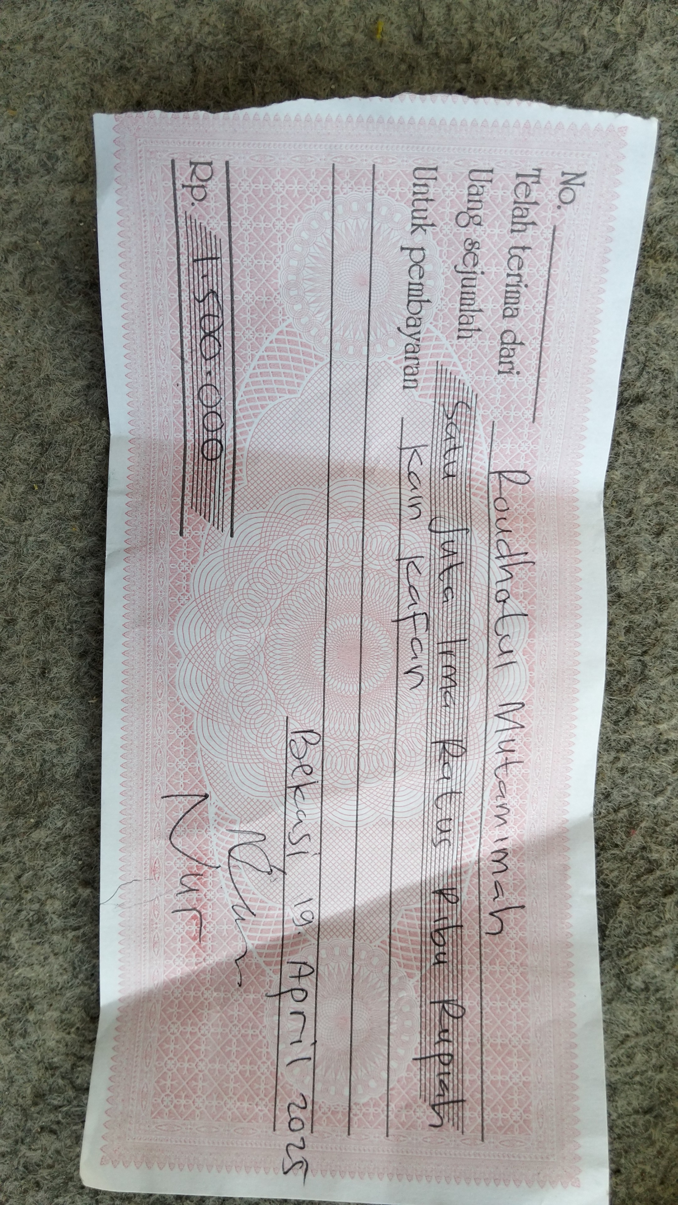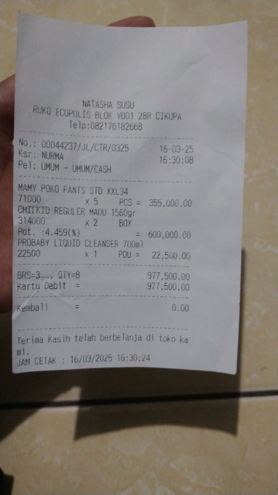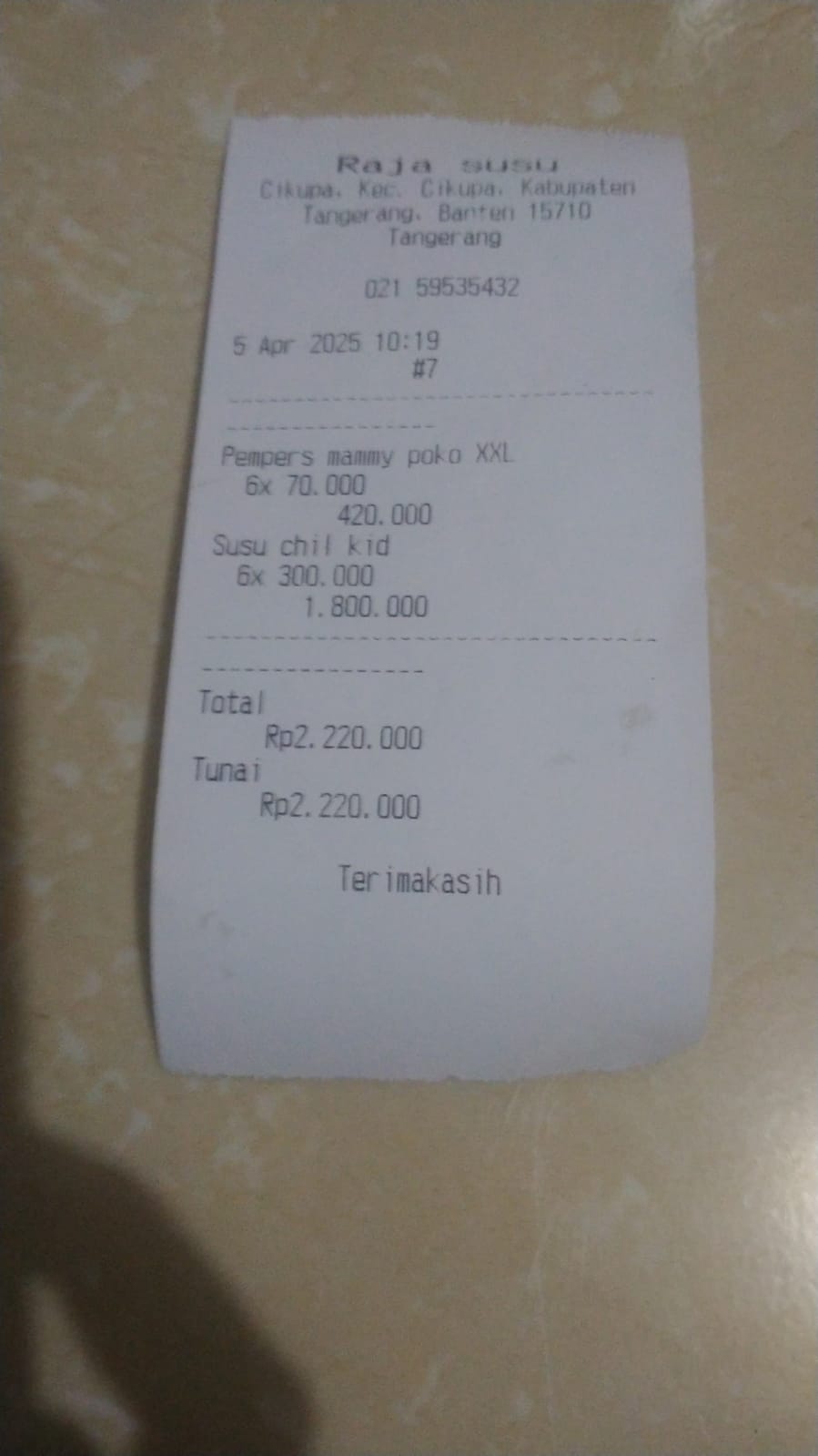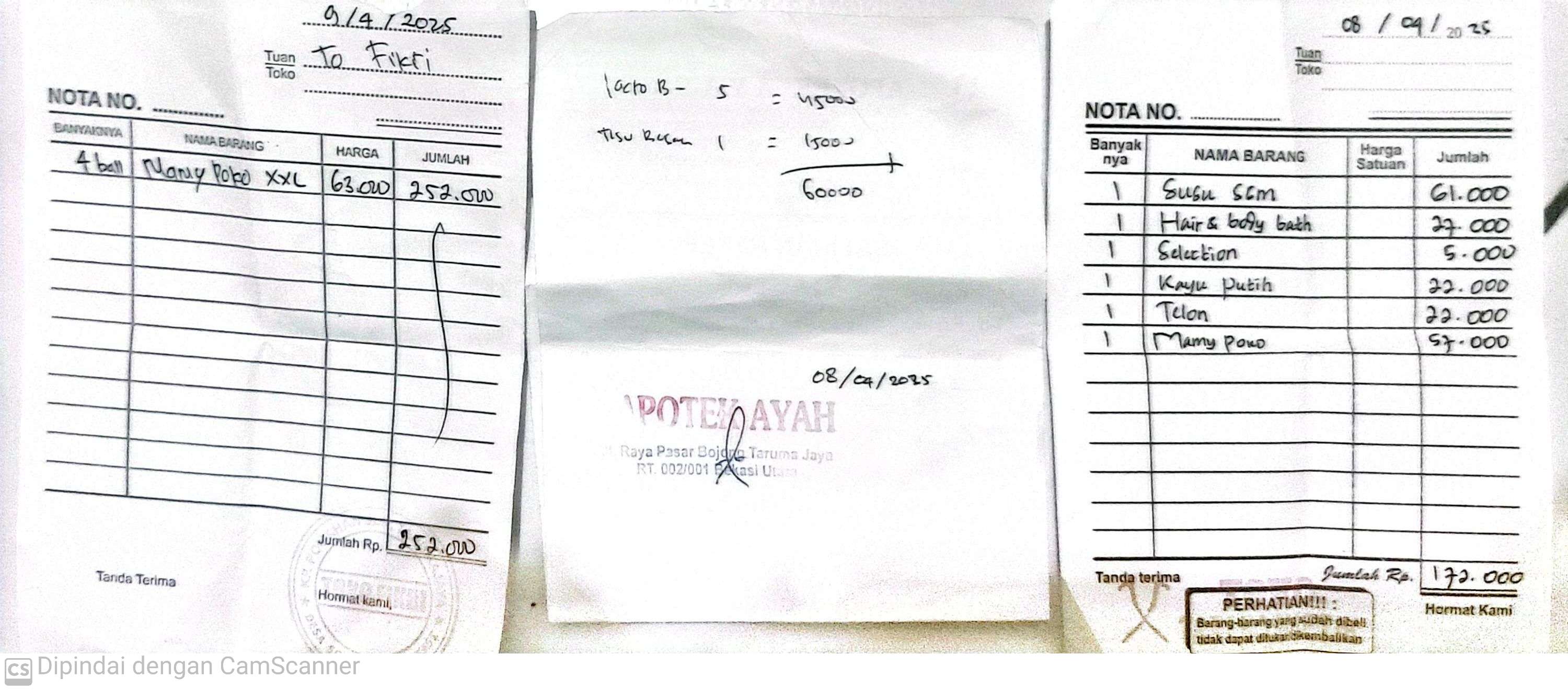 Dana digunakan untuk 1. Susu Nestle isocal Rp120.600 × 5kaleng = Rp603.000 2. Pampes mamypoko xxl Rp63.000 × 5ball = Rp315.000 3. Fedding burret JMS Rp283.000 4. Minyak telon Rp22.000 5. Minyak kayu putih Rp22.000 6. Susu SGM 600 gr Rp61.000 7. Tisu Rp48.000 8. Akupuntur satu kali Rp175.000 9. Stroller Rp1.026.000 10. Underpad Rp32.000 × 4 ball = Rp128.000 11.Lacto b Rp9000 × 5pcs = Rp45.0002025-04-08 09:36:15