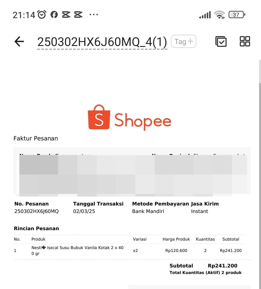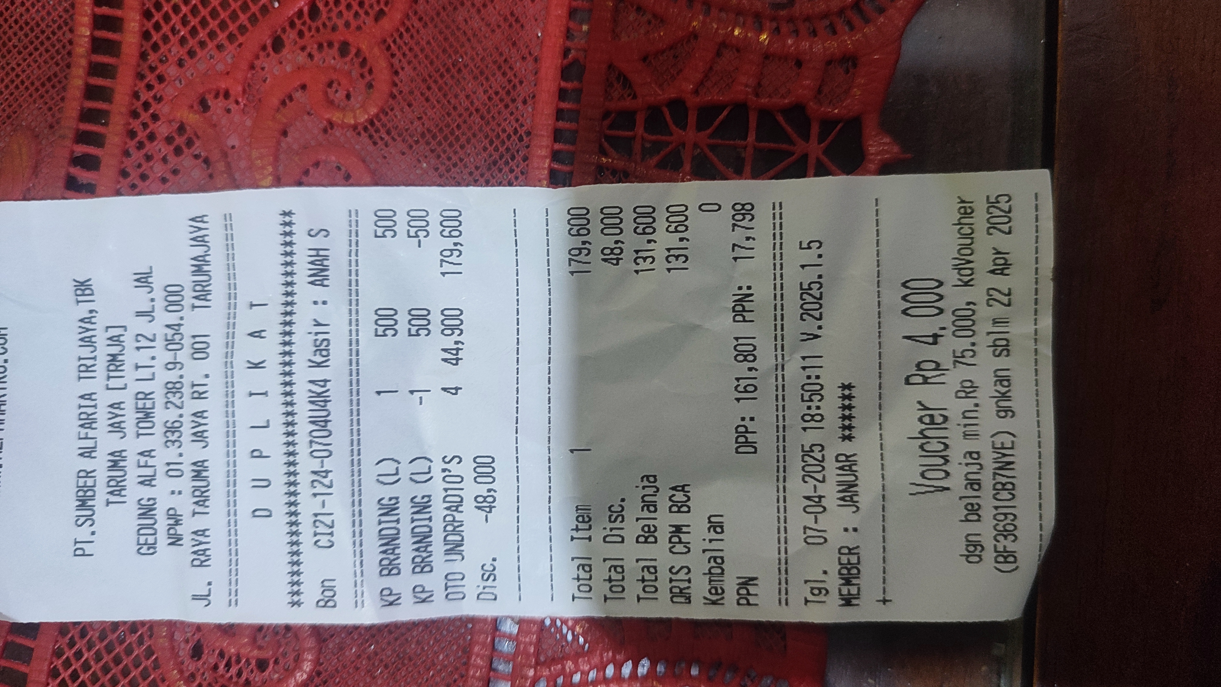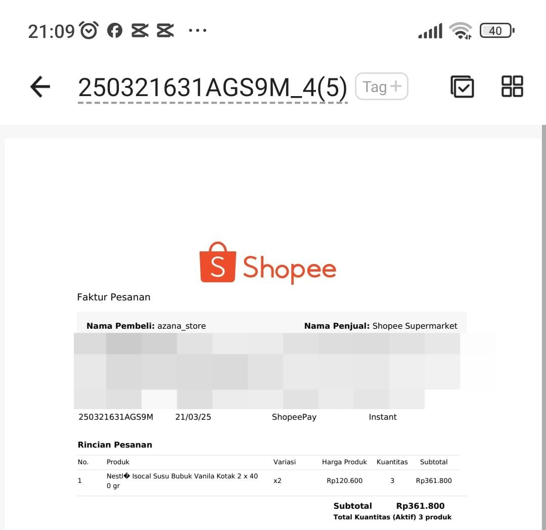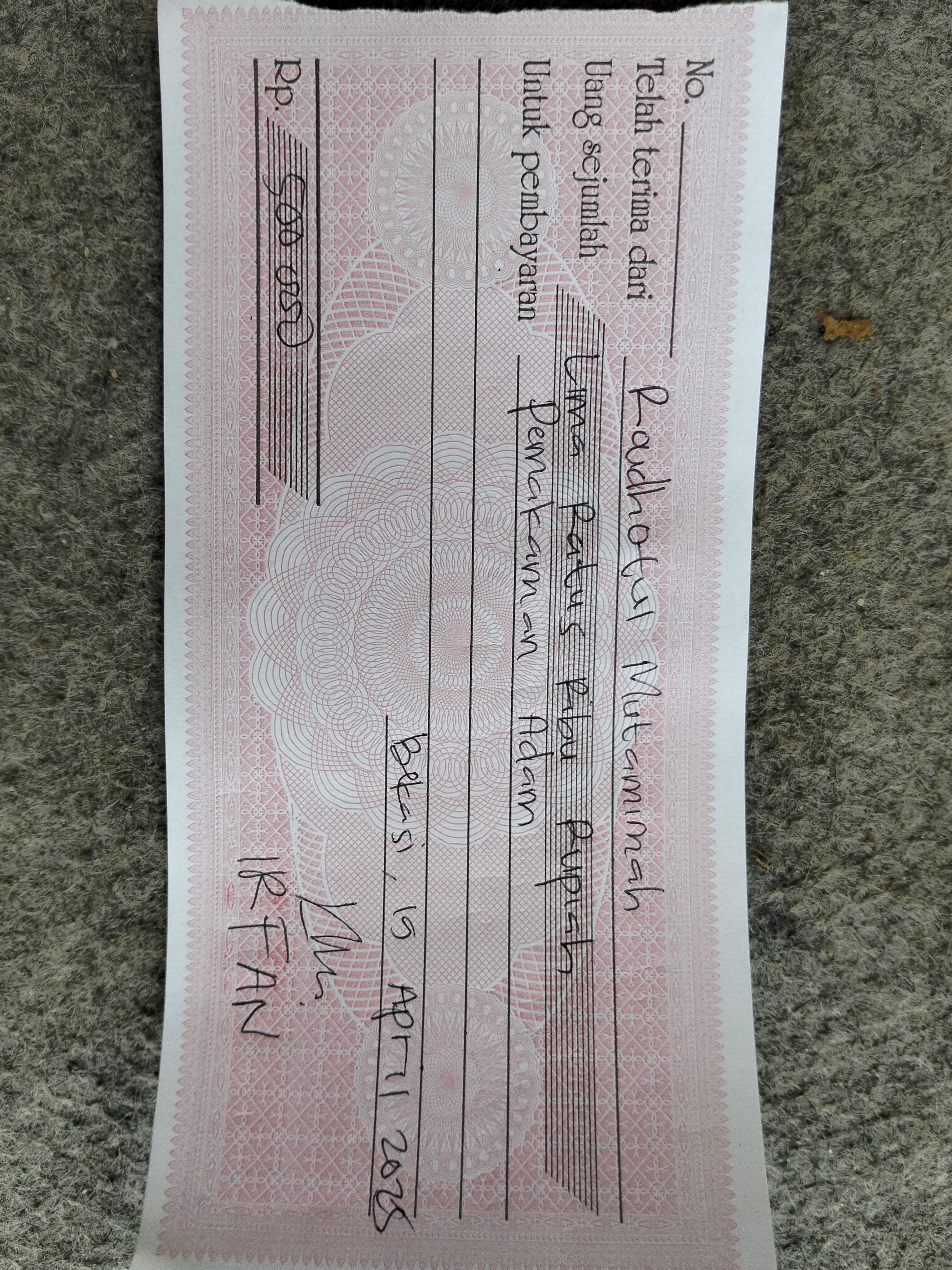 Dana digunakan untuk 1. Susu Nestle isocal Rp120.600 × 5kaleng = Rp603.000 2. Pampes mamypoko xxl Rp63.000 × 5ball = Rp315.000 3. Fedding burret JMS Rp283.000 4. Minyak telon Rp22.000 5. Minyak kayu putih Rp22.000 6. Susu SGM 600 gr Rp61.000 7. Tisu Rp48.000 8. Akupuntur satu kali Rp175.000 9. Stroller Rp1.026.000 10. Underpad Rp32.000 × 4 ball = Rp128.000 11.Lacto b Rp9000 × 5pcs = Rp45.0002025-04-08 09:36:15