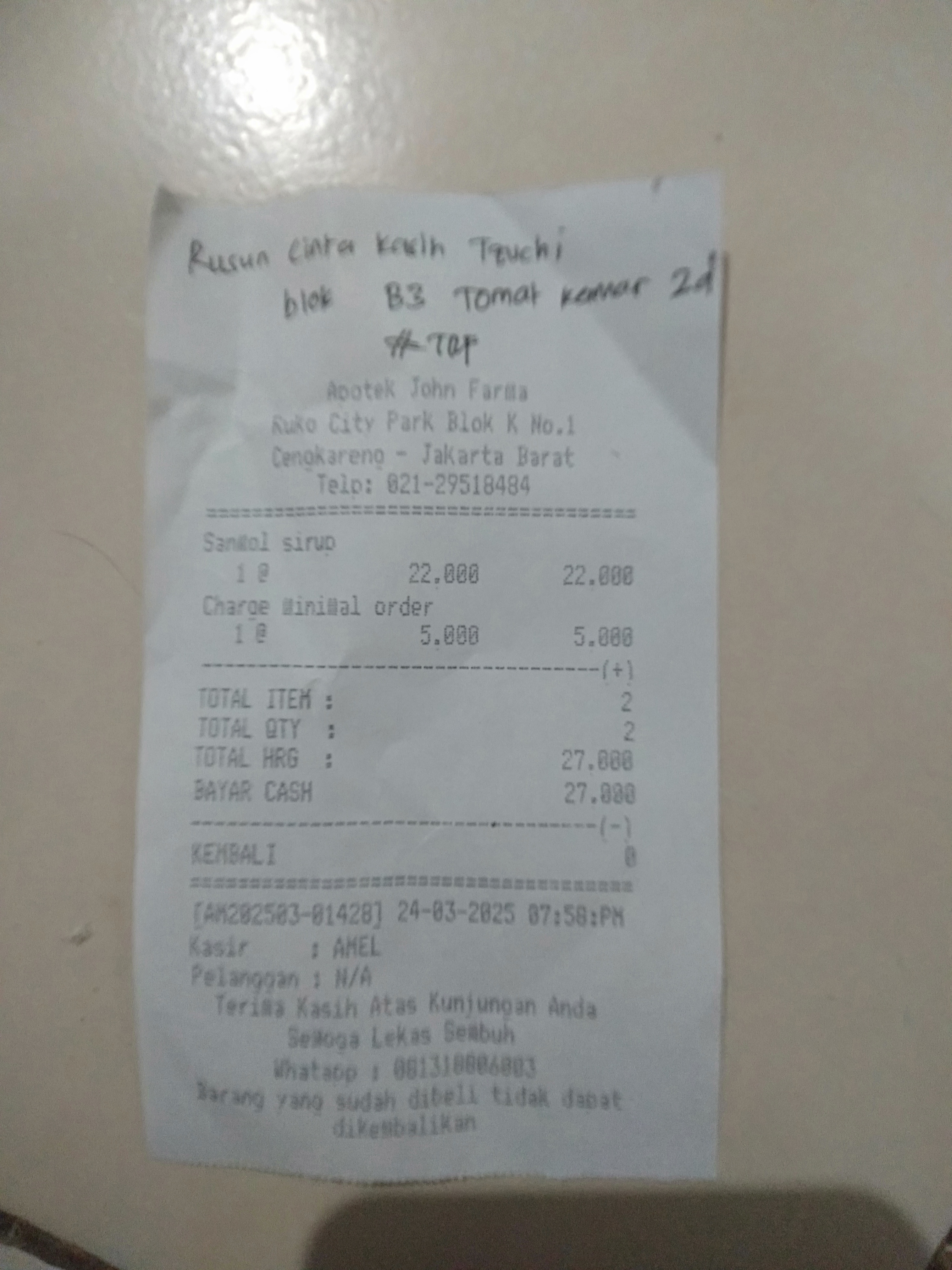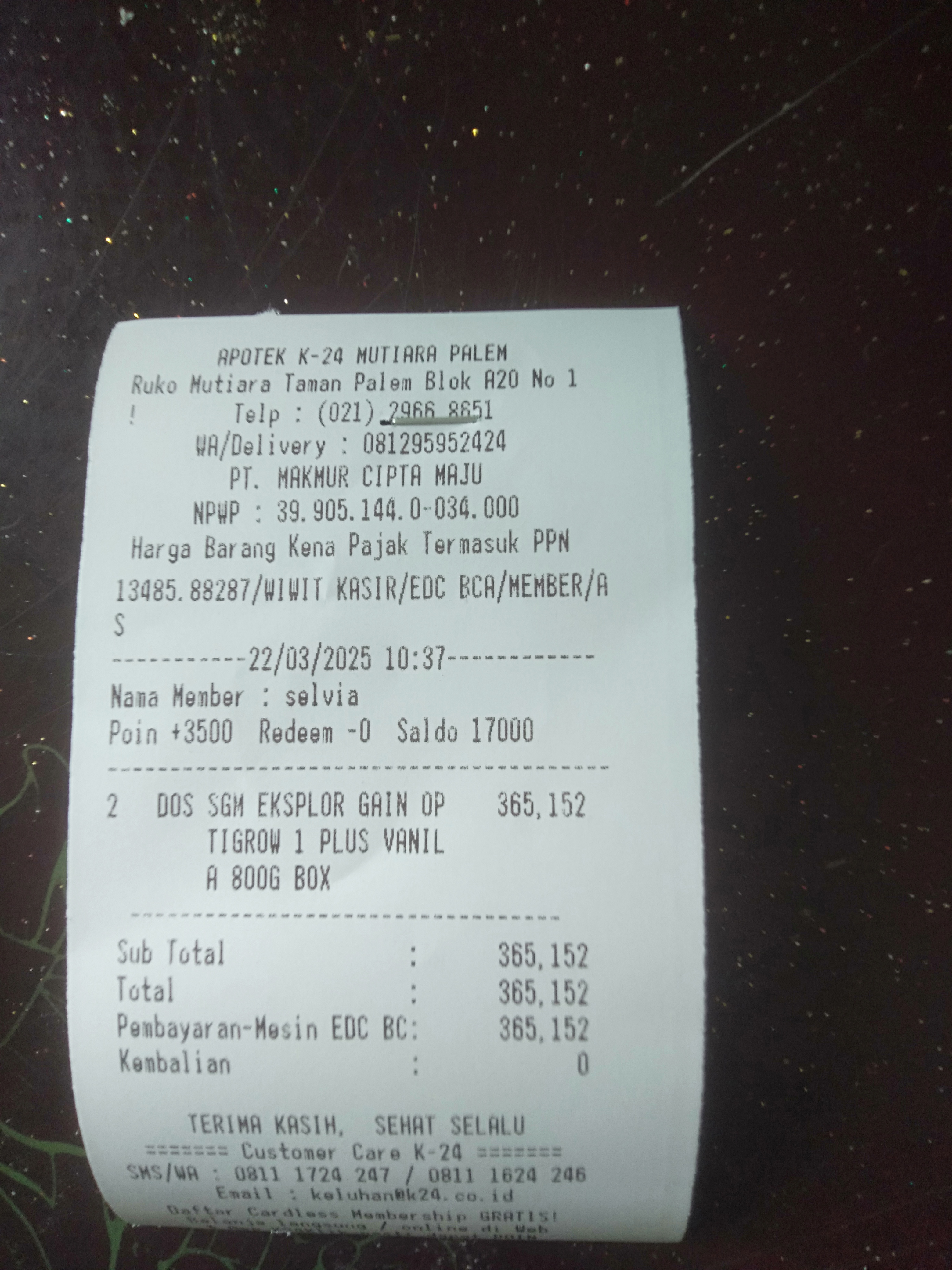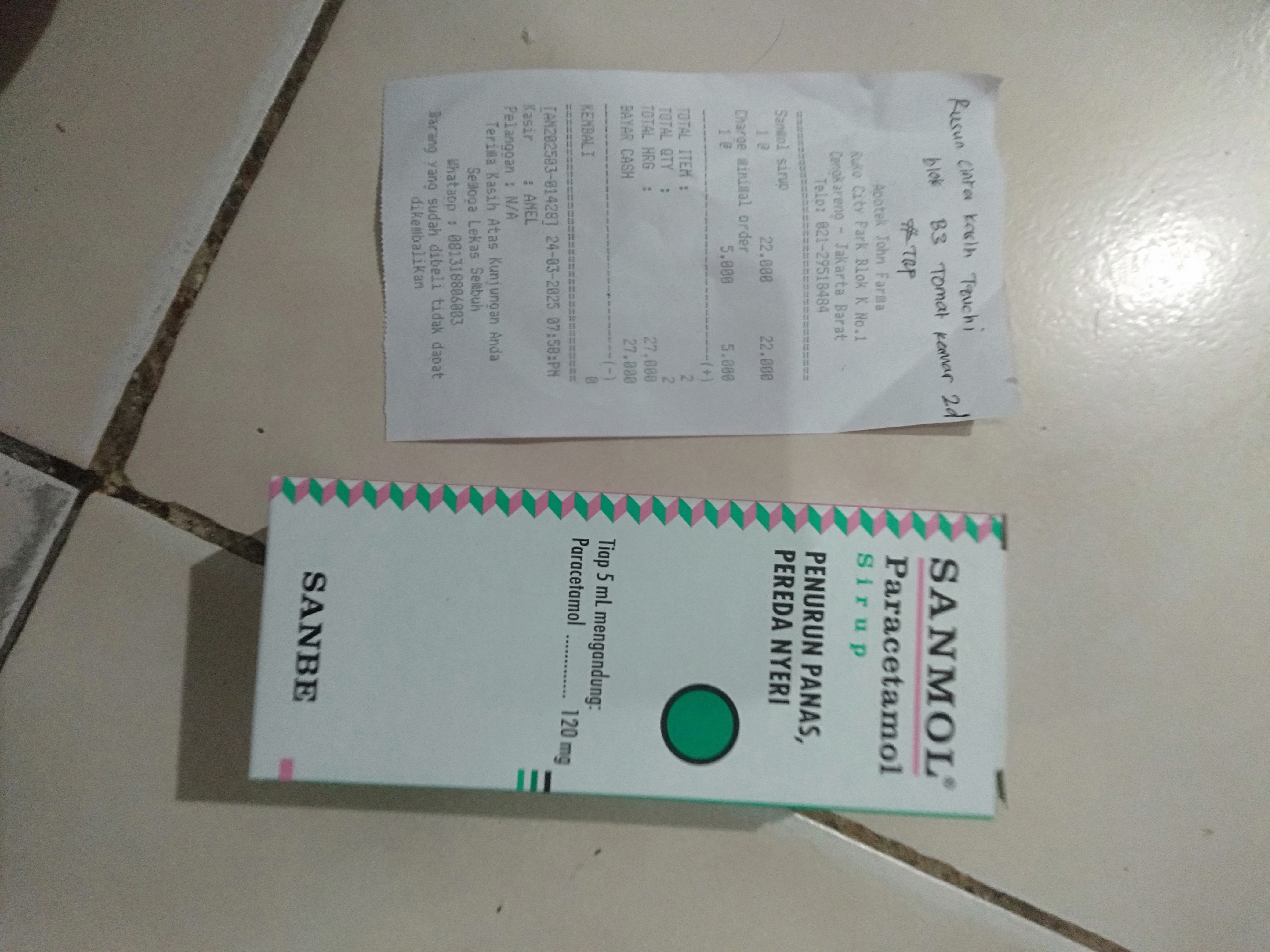 Dana digunakan untuk 1. Pampers Rp57.000 x 3 ball= Rp171.000 2. Susu SGM optigrow Rp182.000 x 2 box = Rp364.000 3. Reimburse obat parasetamol Rp27.000 4. Konsumsi di jakarta Rp1.100.0002025-04-14 08:58:12