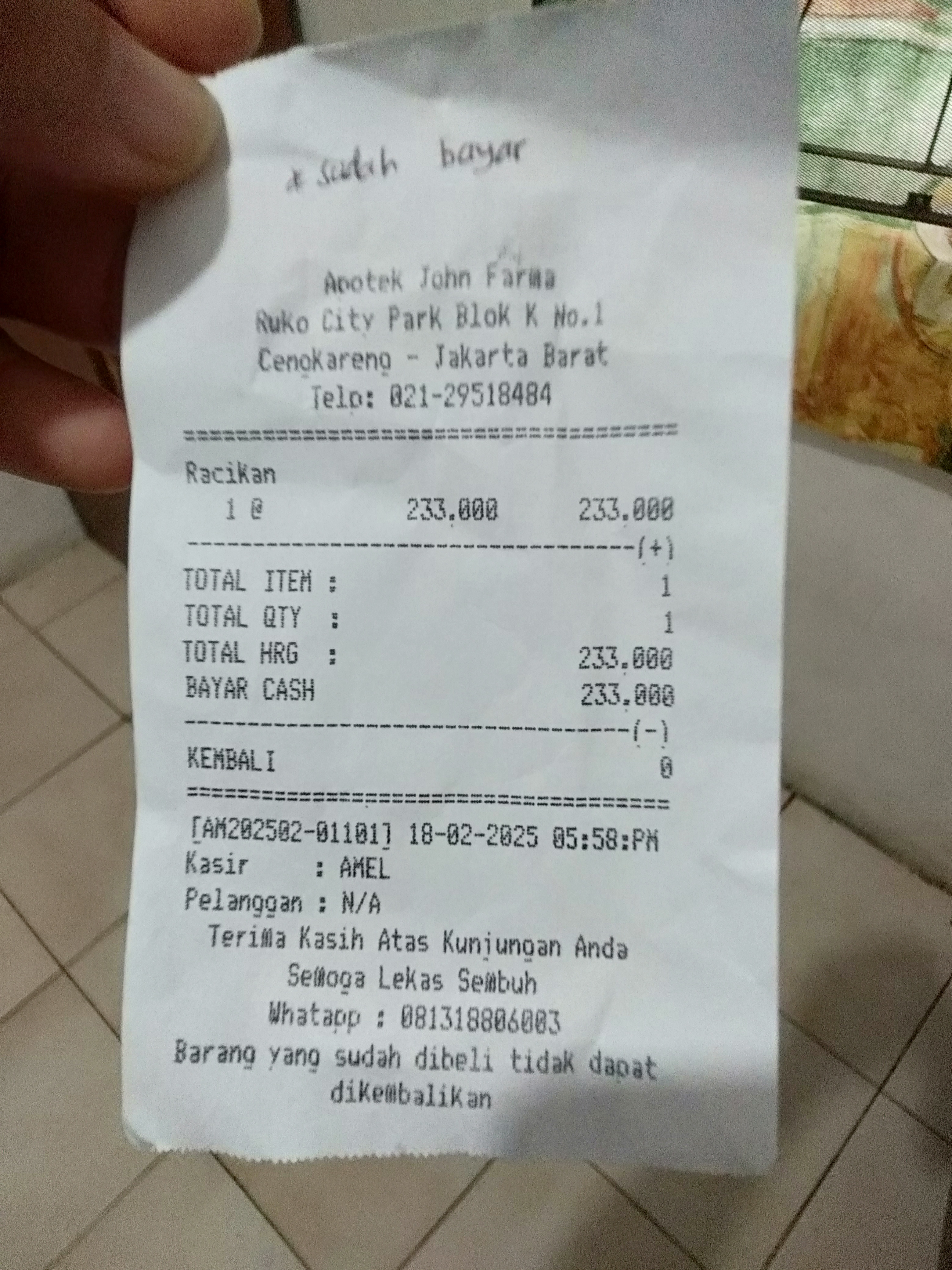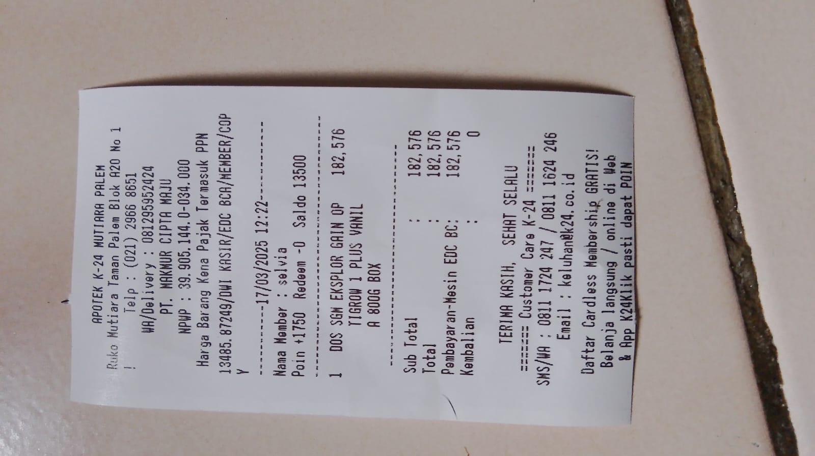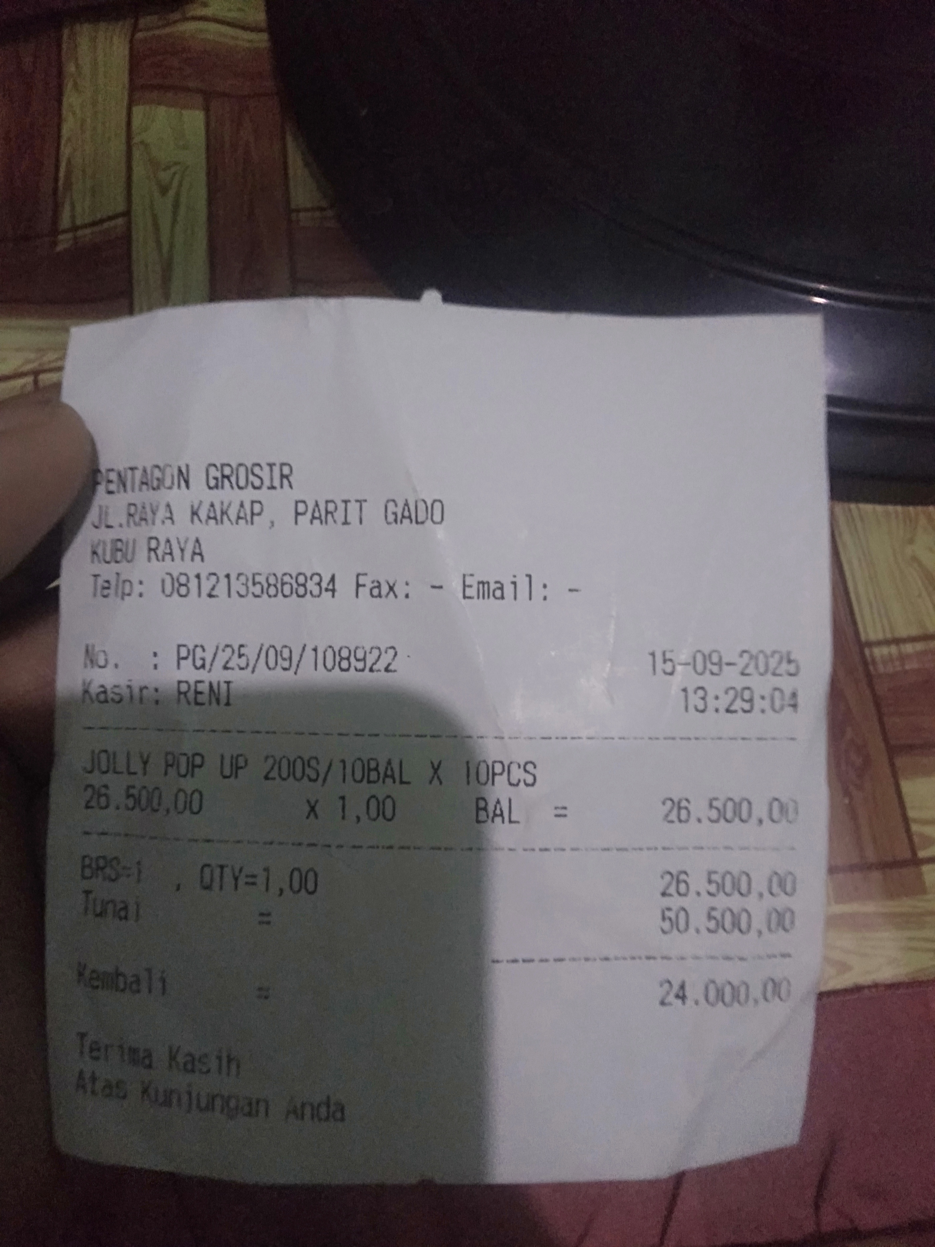 Dana digunakan untuk 1. Pampers Rp57.000 x 3 ball= Rp171.000 2. Susu SGM optigrow Rp182.000 x 2 box = Rp364.000 3. Reimburse obat parasetamol Rp27.000 4. Konsumsi di jakarta Rp1.100.0002025-04-14 08:58:12