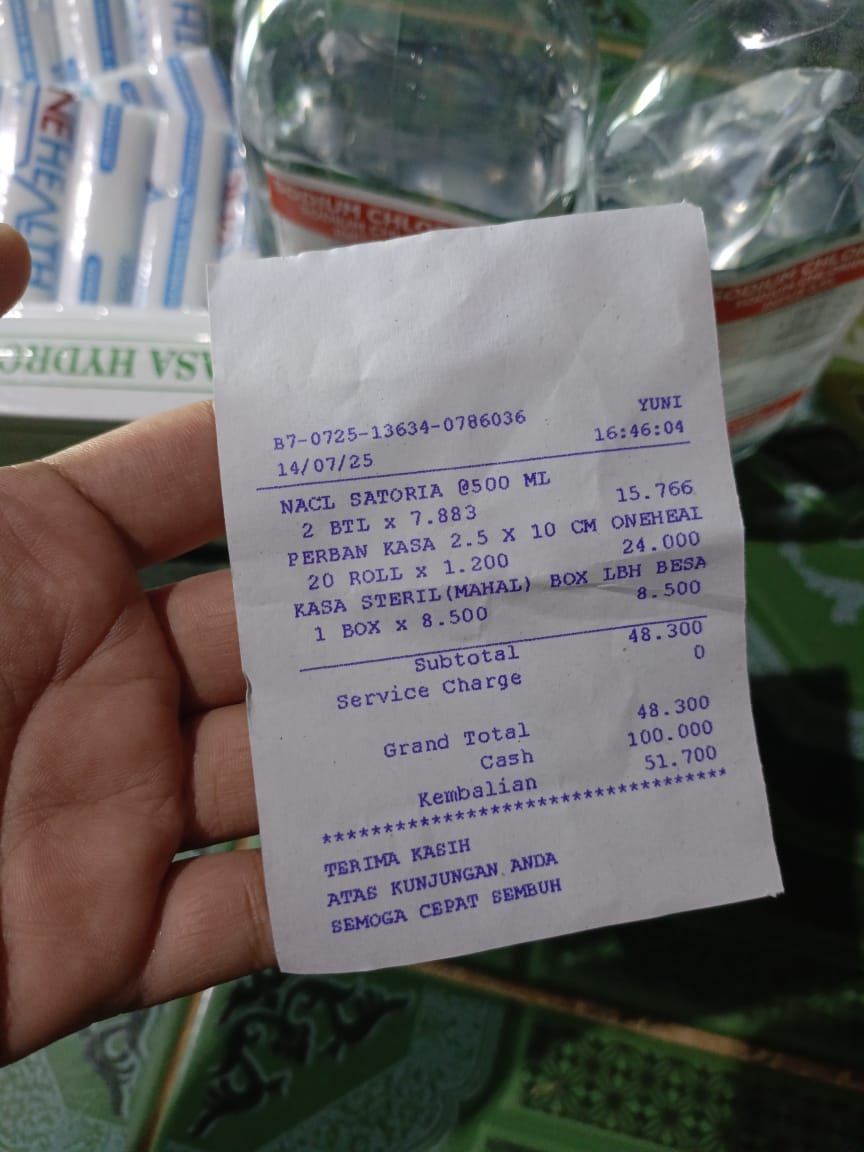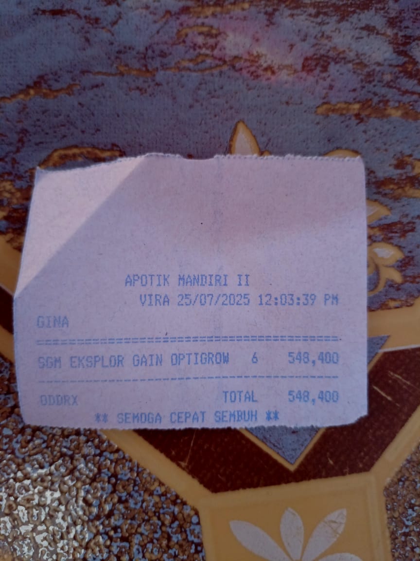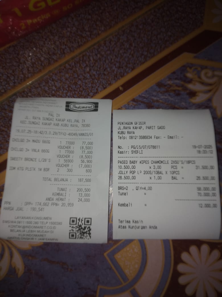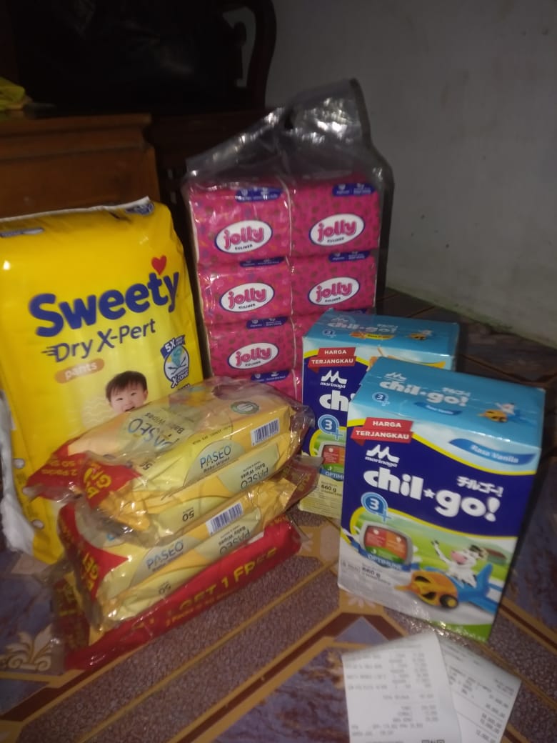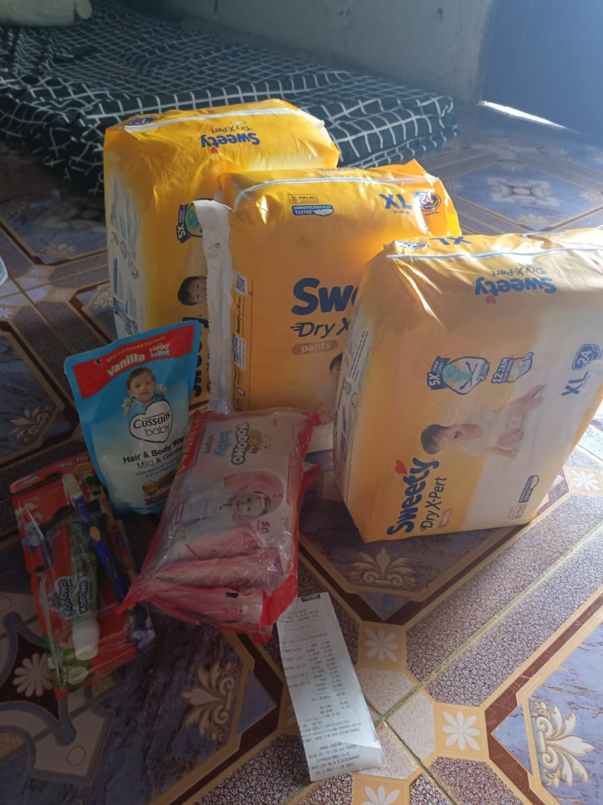 Dana digunakan untuk 1. Susu SGM optigrow 6 kotak Rp548.400 2. Susu Morinaga cilgo 3 kotak Rp205.500 3. Pampers sweety 5 ball Rp248.300 4. Tisu basa/ kering Rp82.000 5. Perawatan luka Rp48.300 6. Obat diare Rp110,0002025-07-31 09:46:06