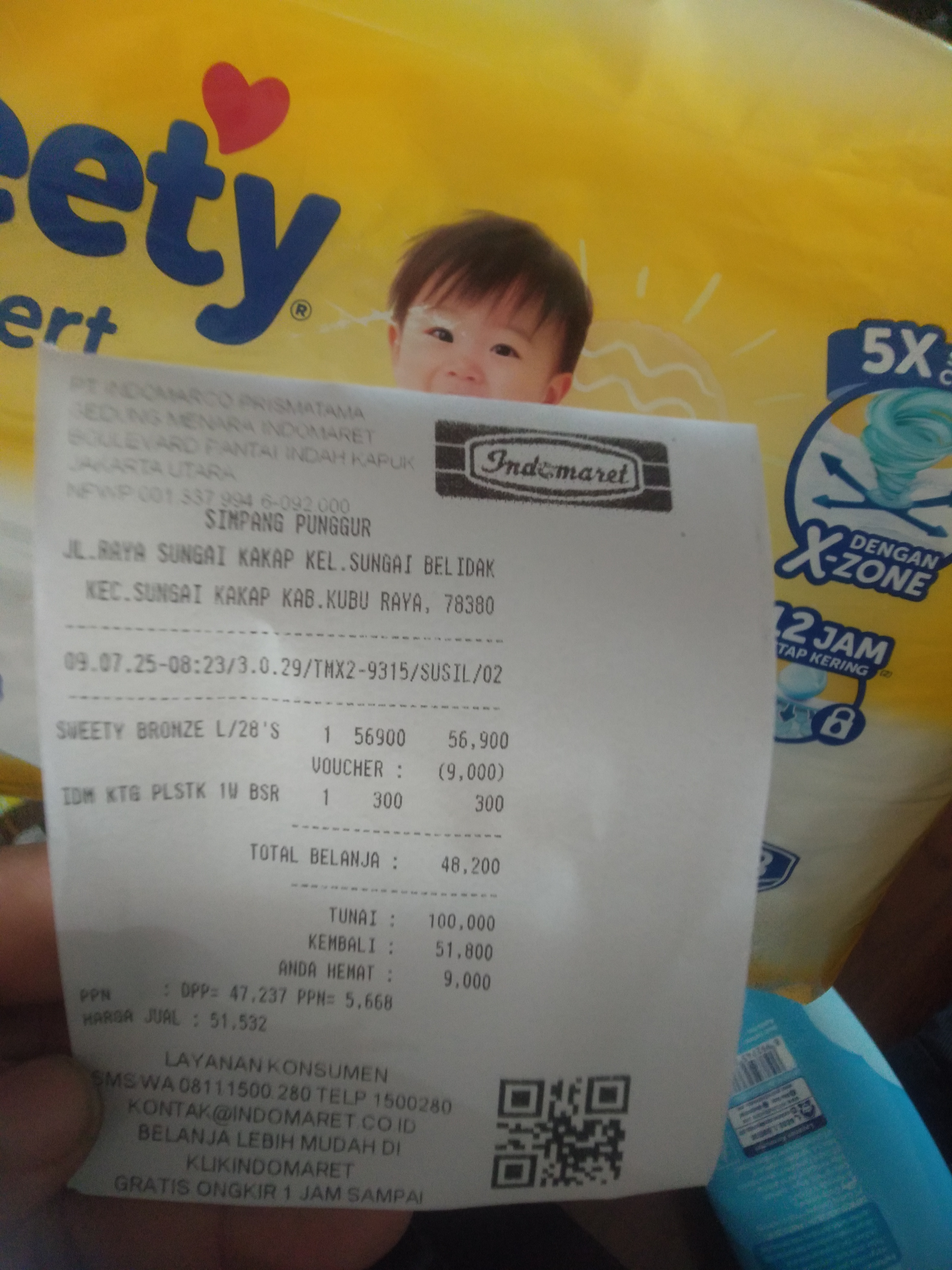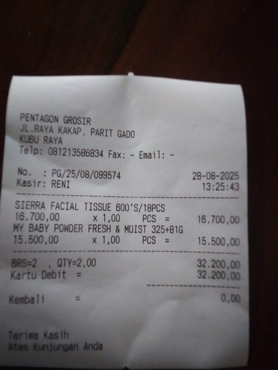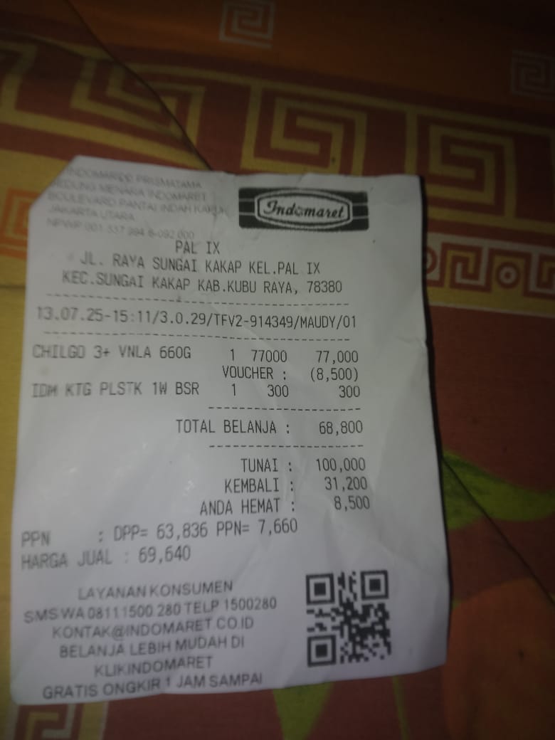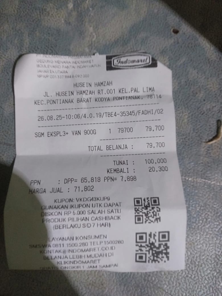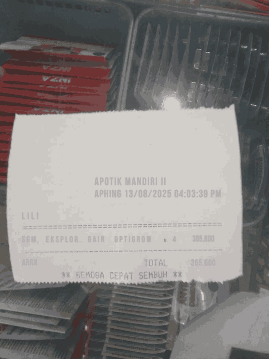 Dana digunakan untuk 1. Susu SGM optigrow 6 kotak Rp548.400 2. Susu Morinaga cilgo 3 kotak Rp205.500 3. Pampers sweety 5 ball Rp248.300 4. Tisu basa/ kering Rp82.000 5. Perawatan luka Rp48.300 6. Obat diare Rp110,0002025-07-31 09:46:06
