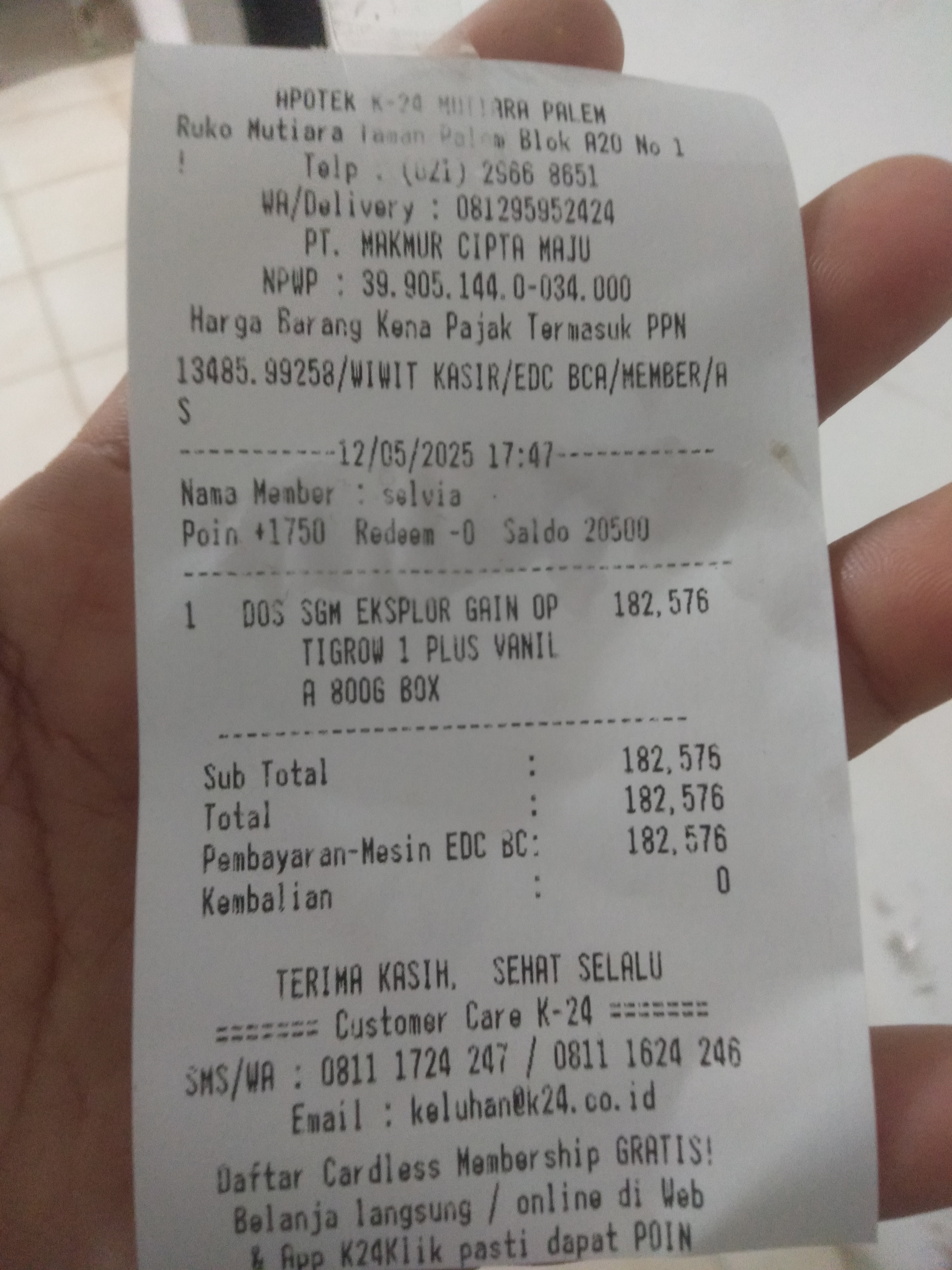 Dana digunakan untuk 1. Reimburse susu SGM optigrow 800gr Rp182.500 2. Pampers Rp54.000 x 3 ball= Rp162.000 3. Uang konsumsi di jakarta Rp900.0002025-05-14 11:00:36