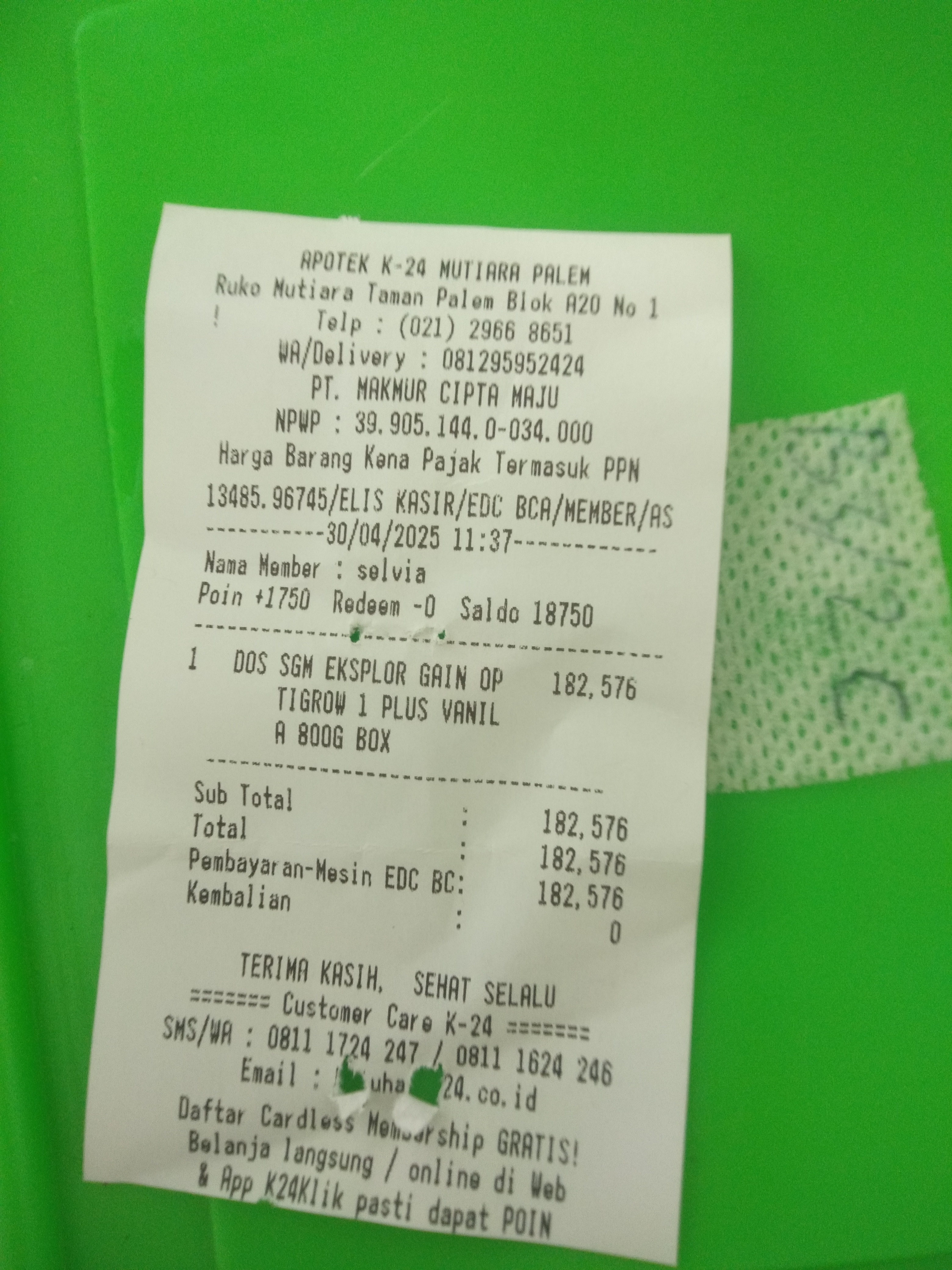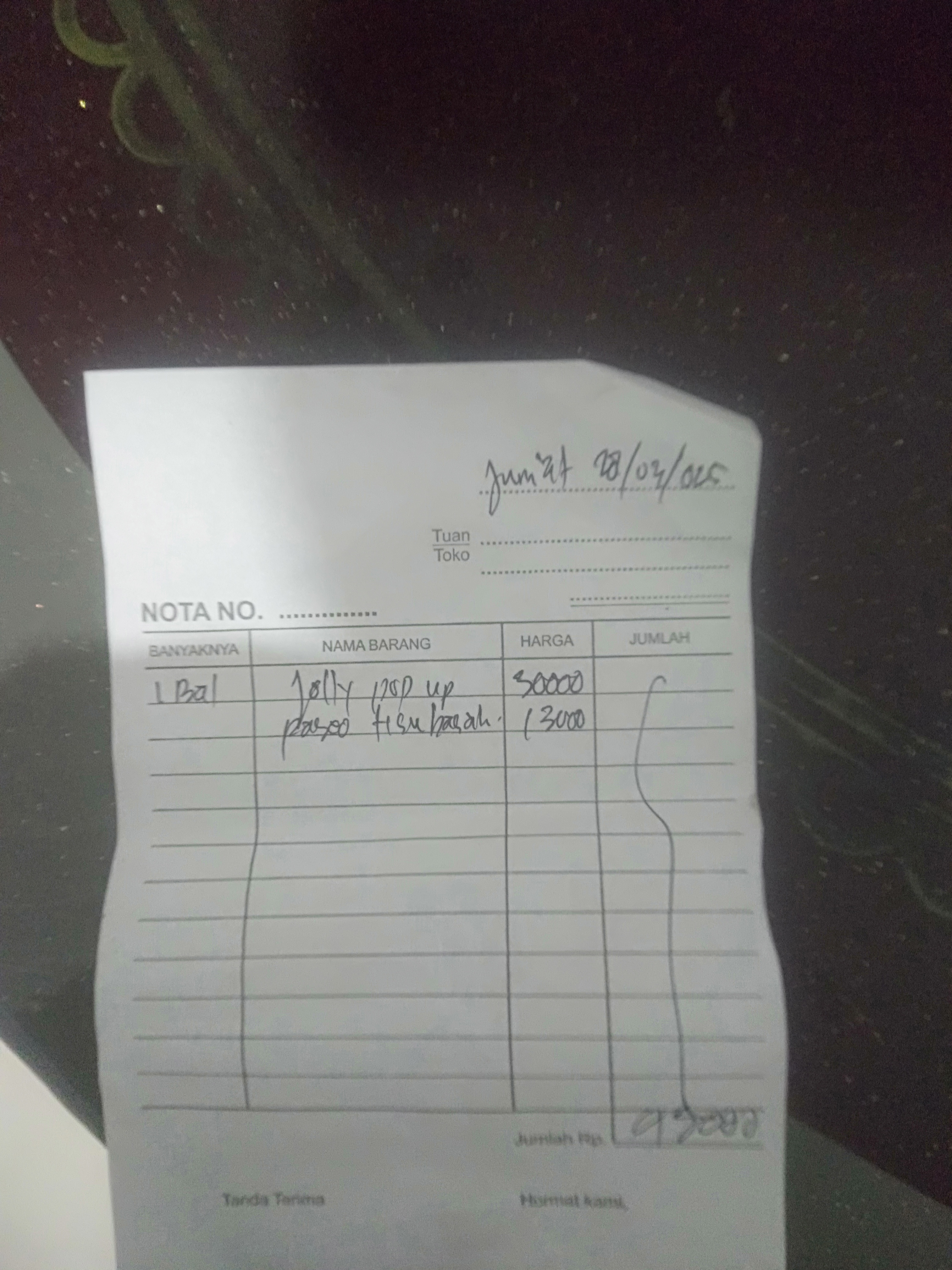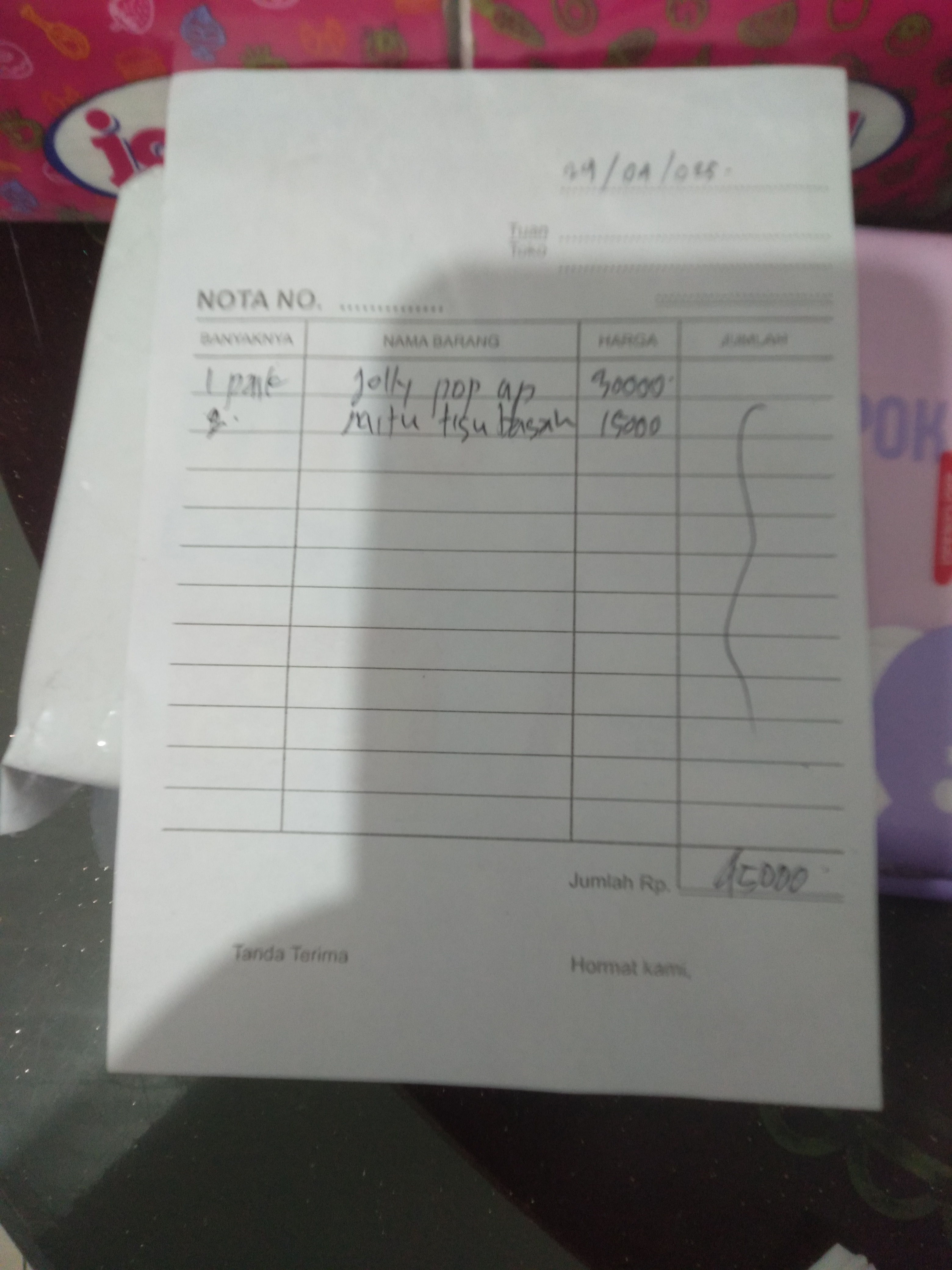 1. Susu SGM optigrow 4 box Rp396.000 2. Reimburse taxi online dan tol Rp218.000 3. Tisu kering dan basah Rp45.000 4. Konsumsi selama 2 minggu di Jakarta Rp1.500.000.2025-01-09 09:33:03