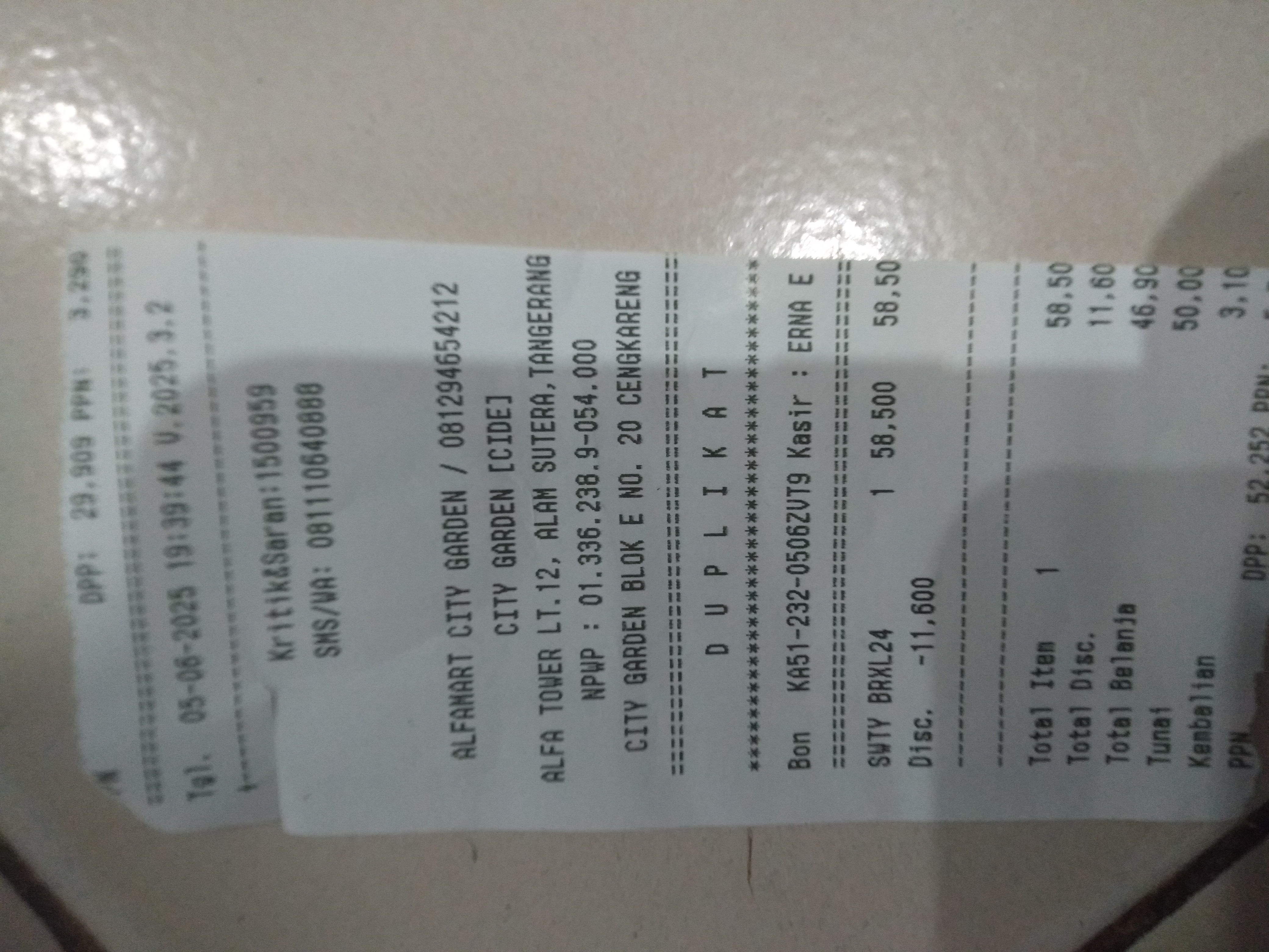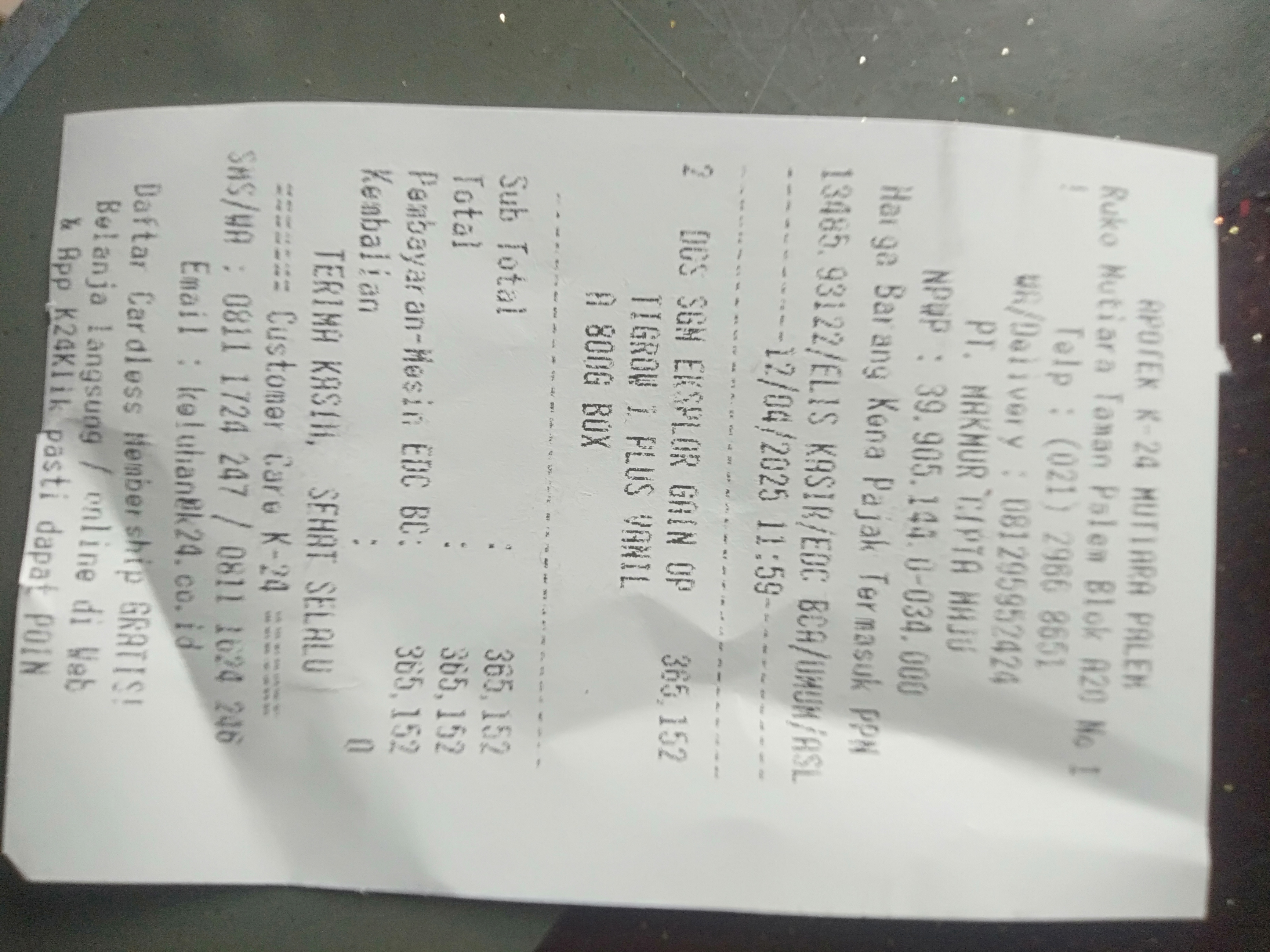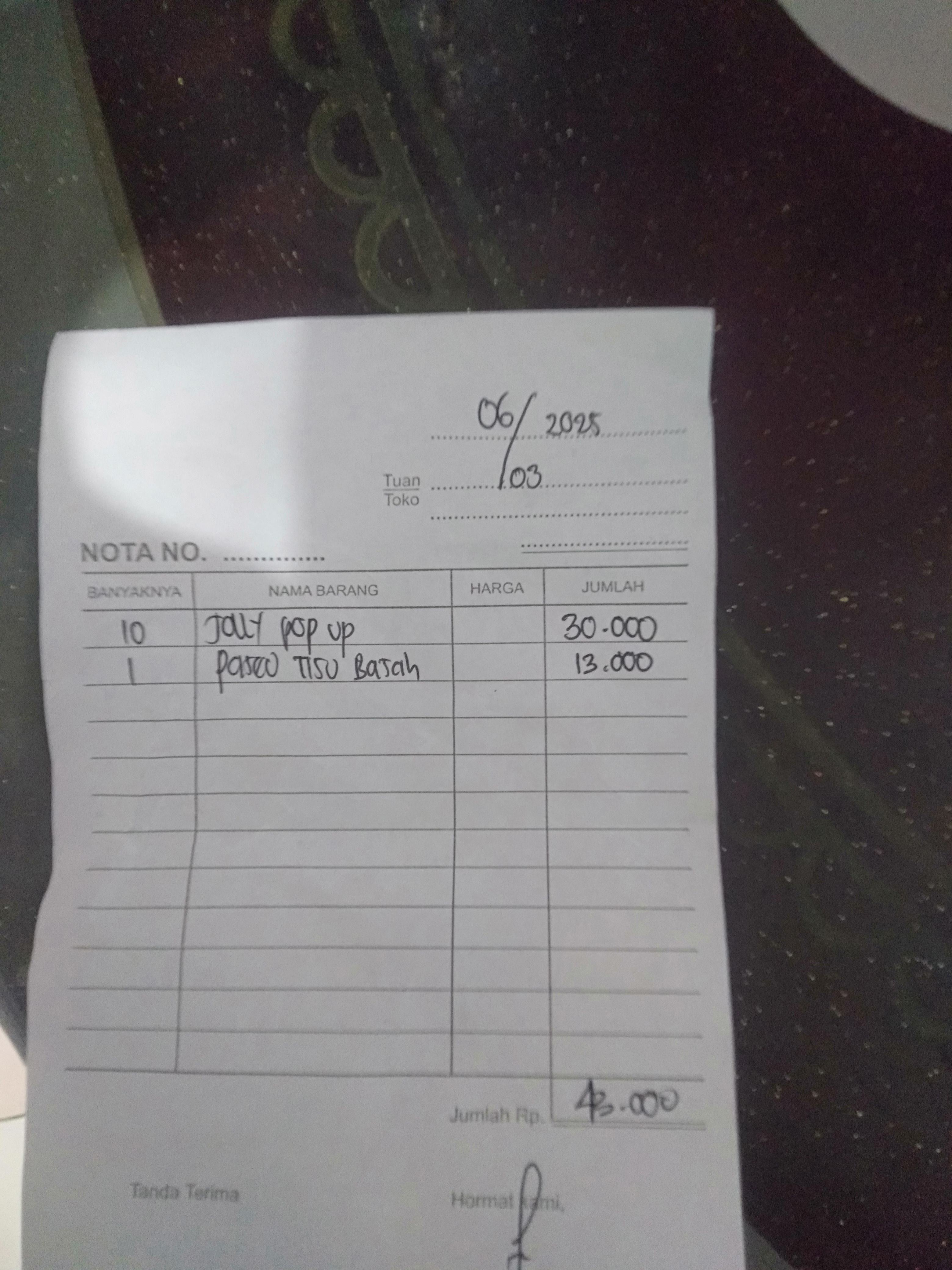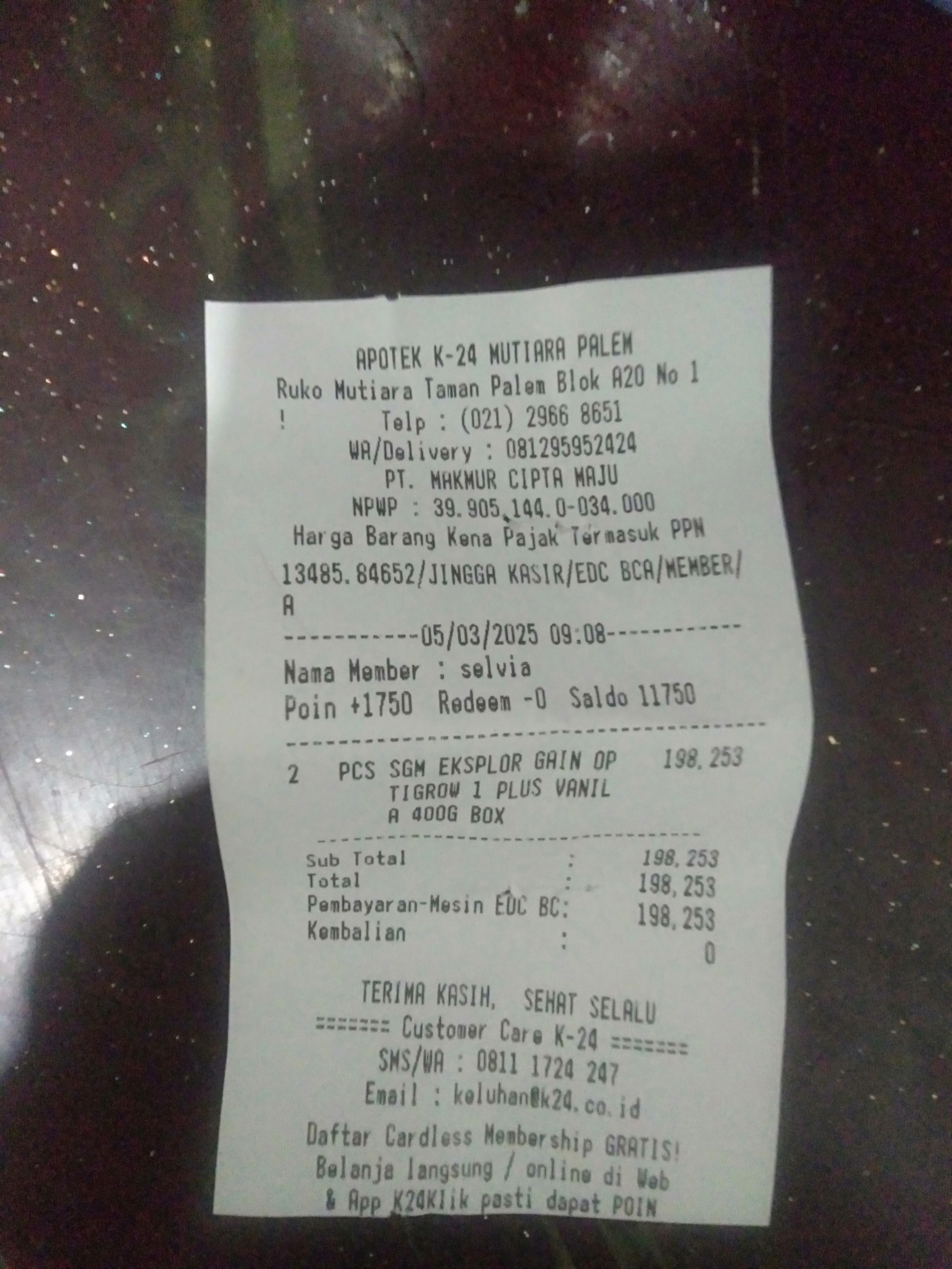 1. Susu SGM optigrow 4 box Rp396.000 2. Reimburse taxi online dan tol Rp218.000 3. Tisu kering dan basah Rp45.000 4. Konsumsi selama 2 minggu di Jakarta Rp1.500.000.2025-01-09 09:33:03