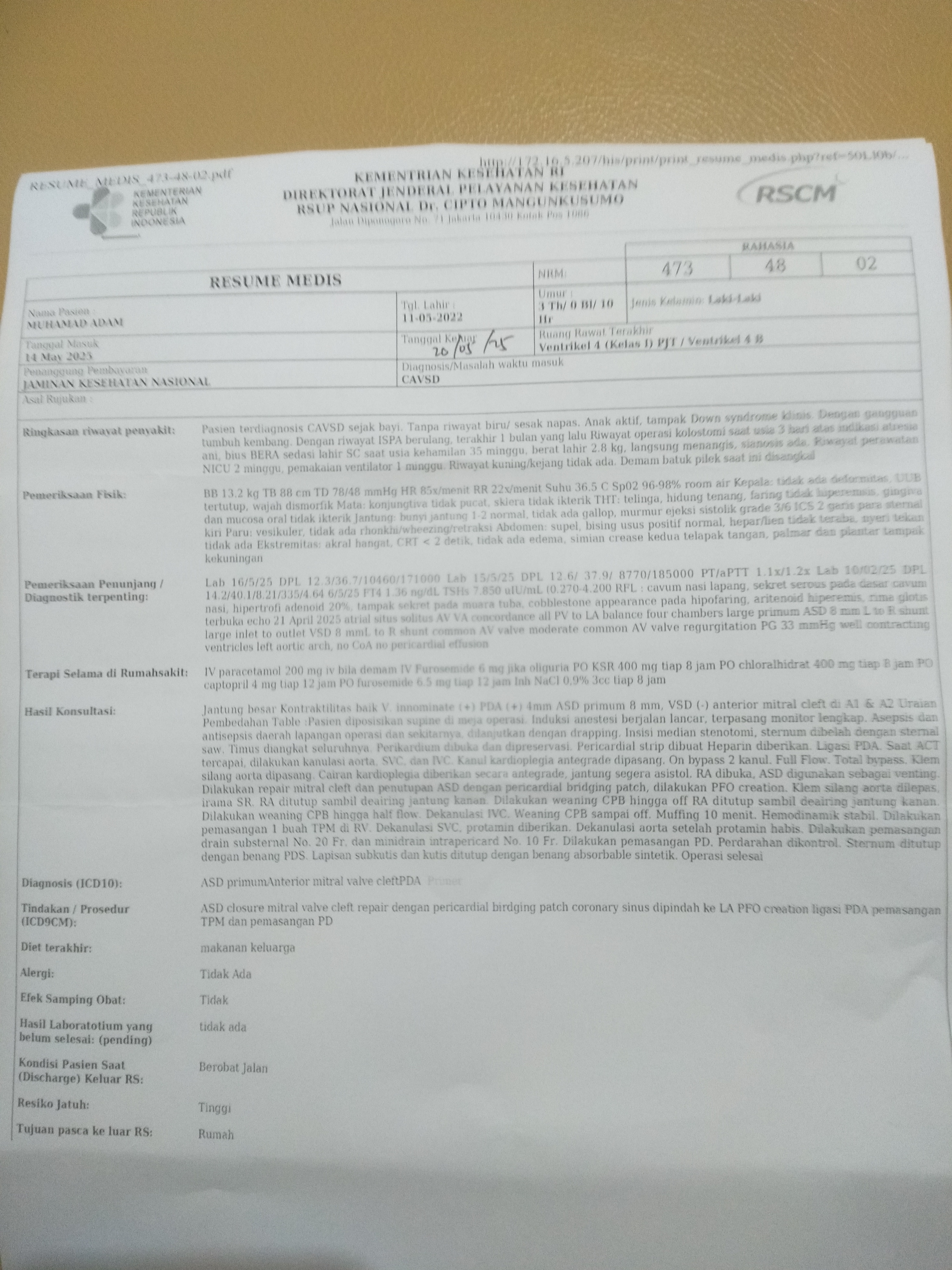 Alhamdulillah, saat ini Adam sudah diperbolehkan pulang dan sedang menjalani masa pemulihan di rumah dengan pengobatan rawat jalan.