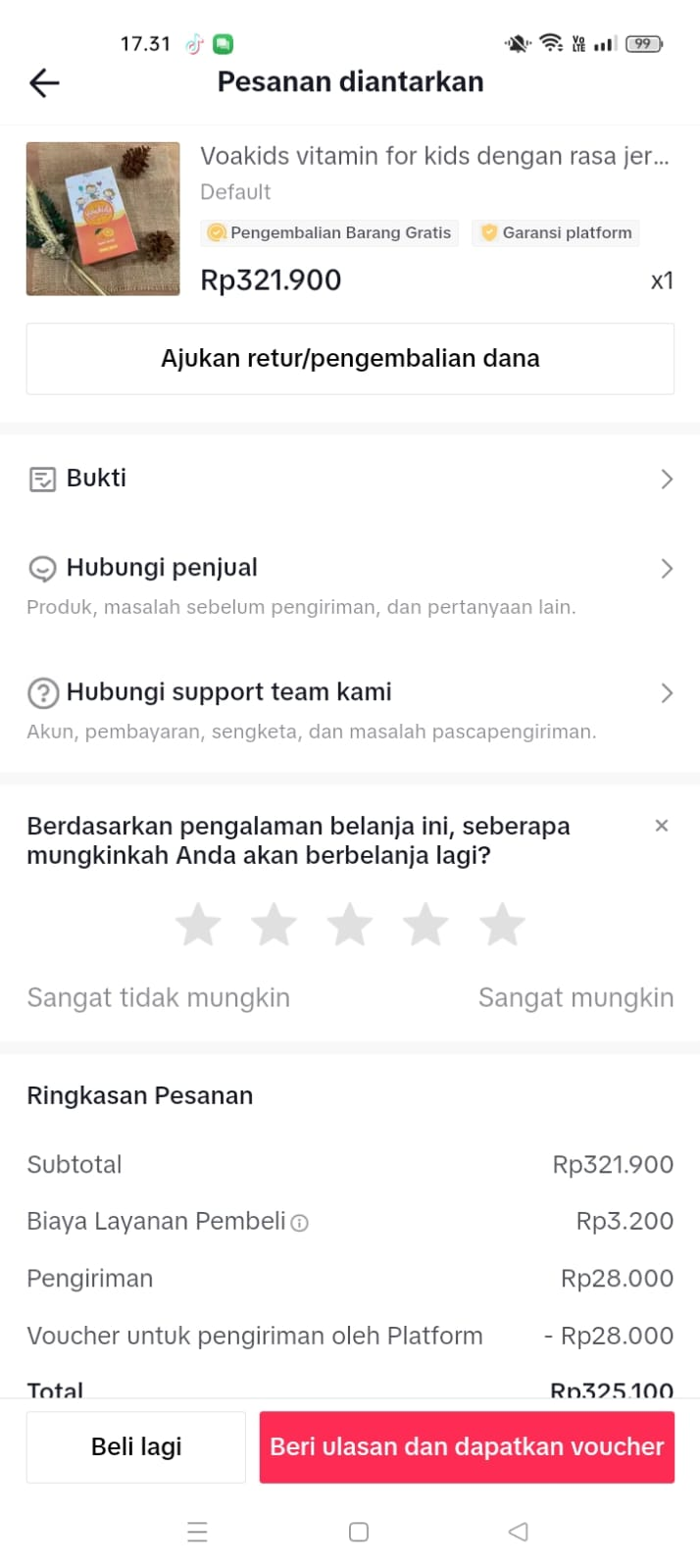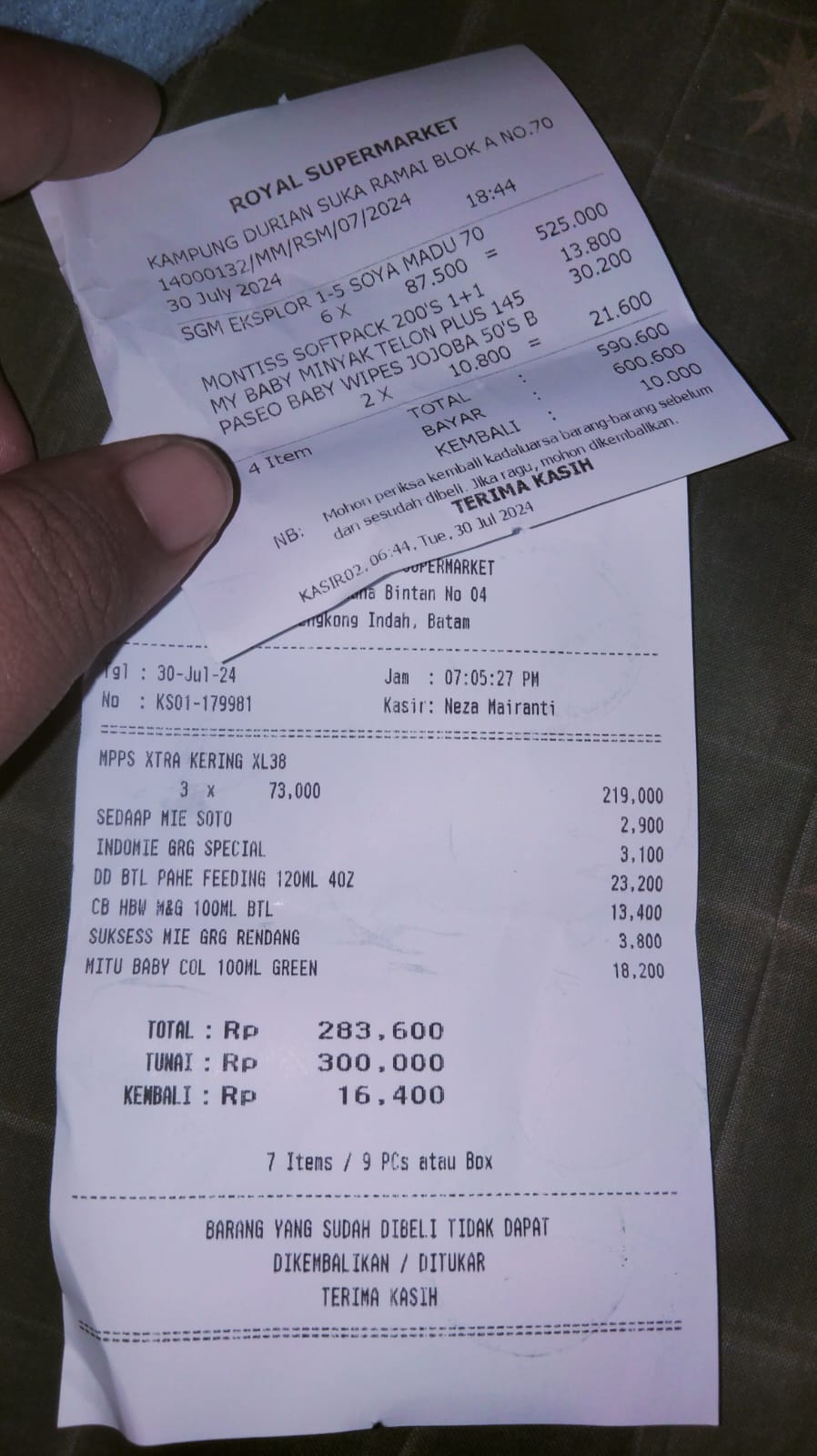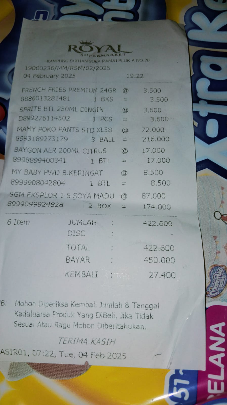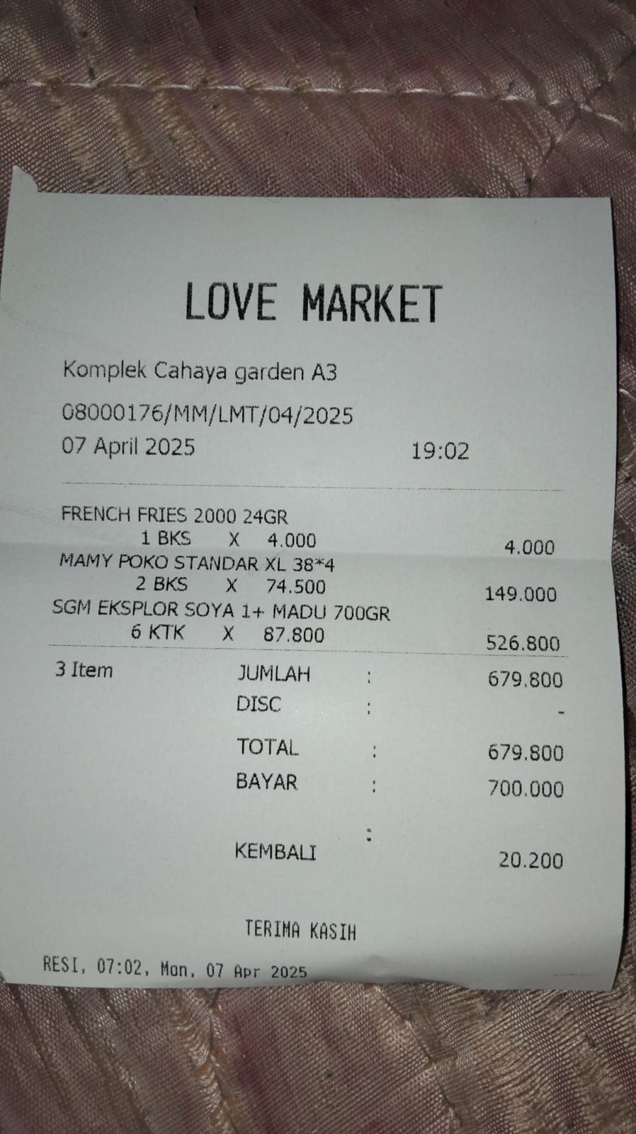 Dana digunakan untuk 1. Susu sgm 1+ soya Rp88.000 x 2 dus= Rp176.000 2. Pampers mamy popok Rp73.000 x 3 ball= Rp219.000 3. Salep Alergi Rp100.000 4. Obat batuk Rp100.0002025-02-05 09:40:45