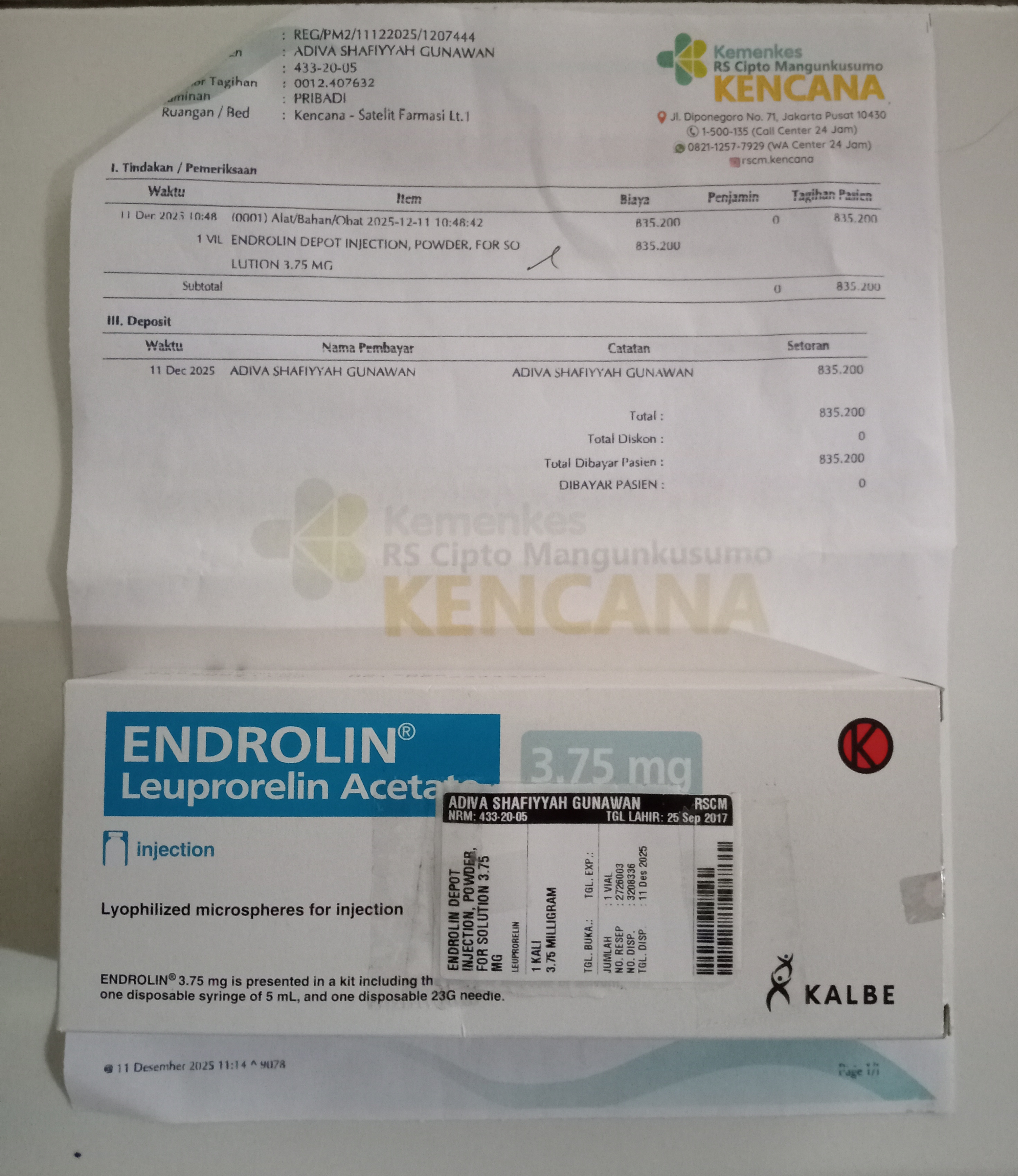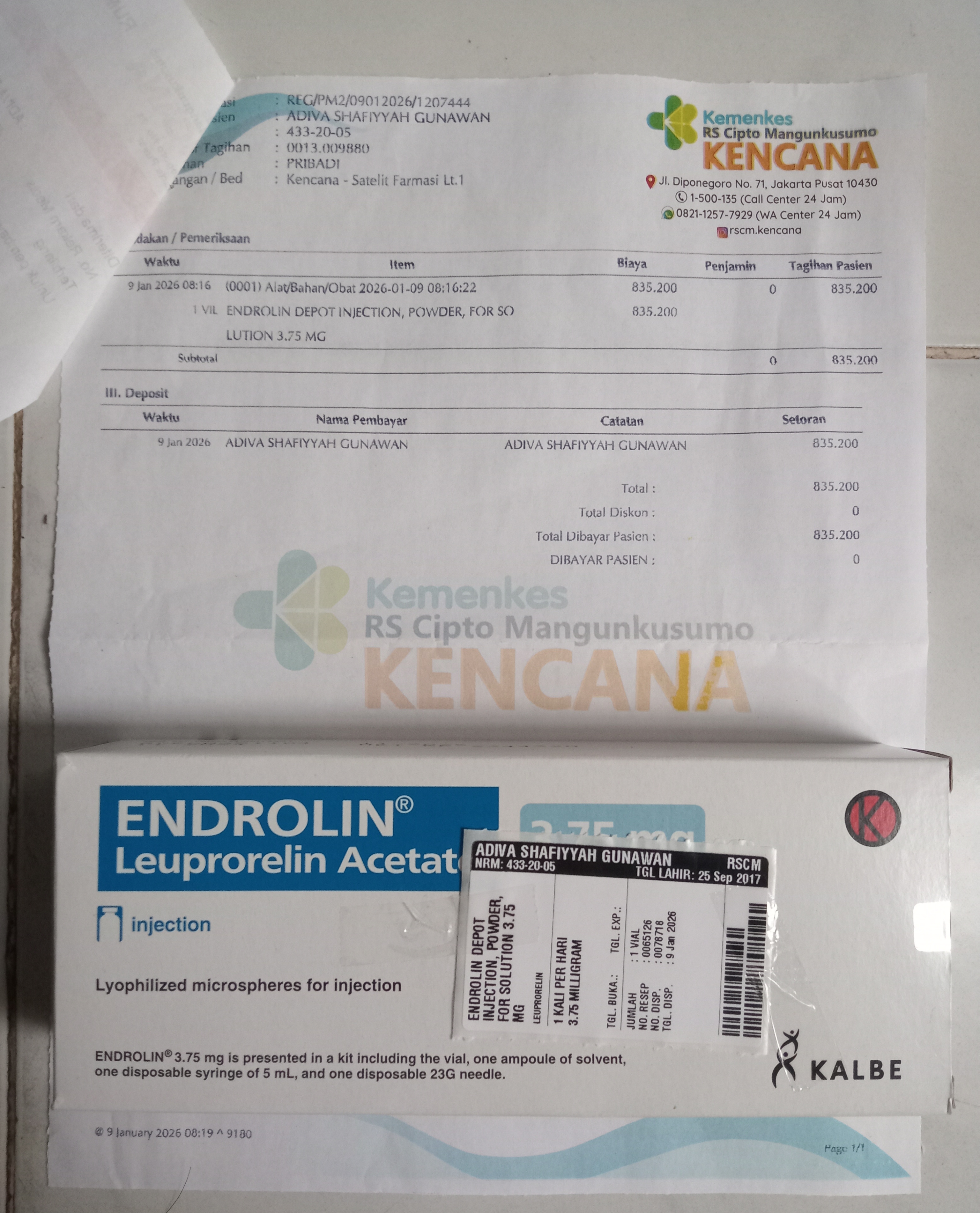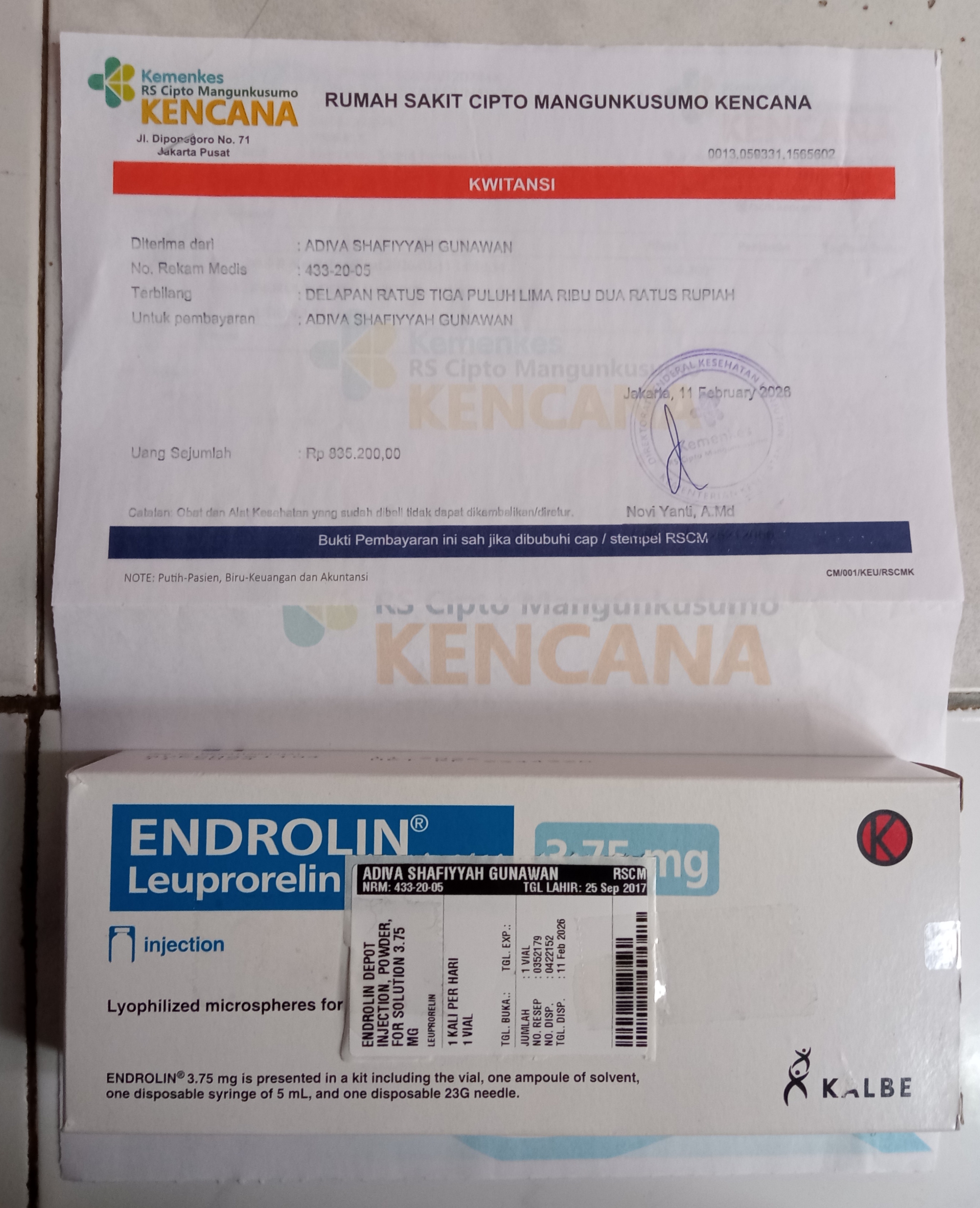 Alhamdulillah, sampai saat ini Adiva masih rutin menjalani tindakan pemberian obat Endrolin setiap bulan untuk mencegah menstruasi dini. Obat ini belum ditanggung oleh BPJS dan harganya cukup mahal.
