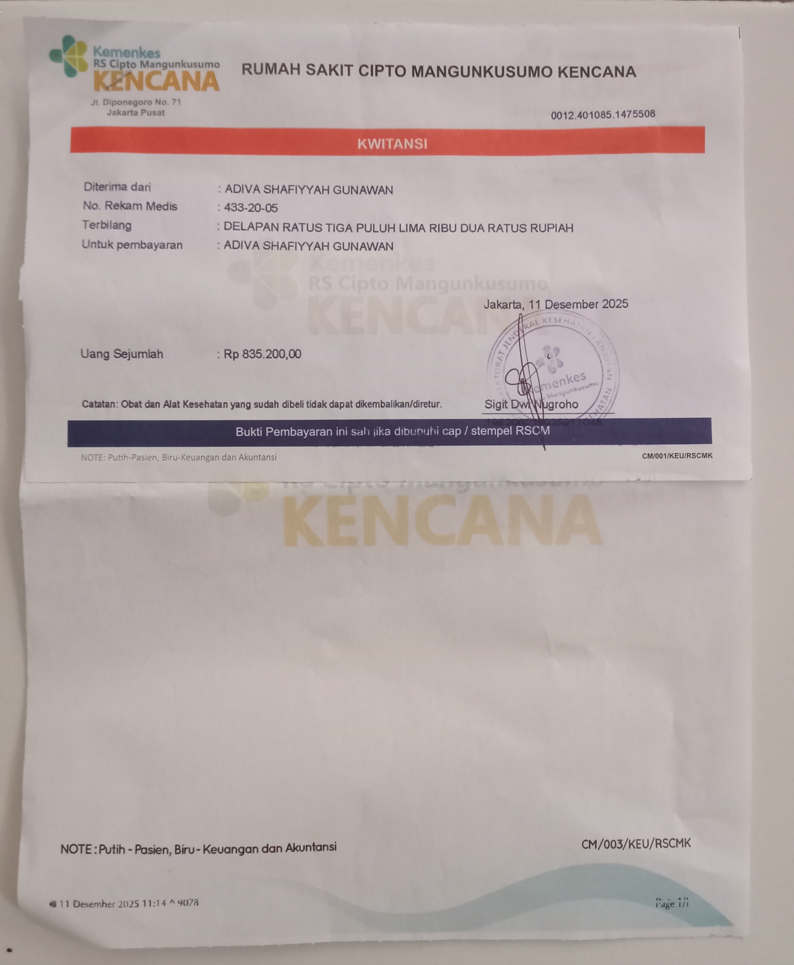 Rp. 1.000.000 untuk membeli susu nutren junior 4 kaleng @800gr Rp. 200.000 untuk ongkos kontrol rscm