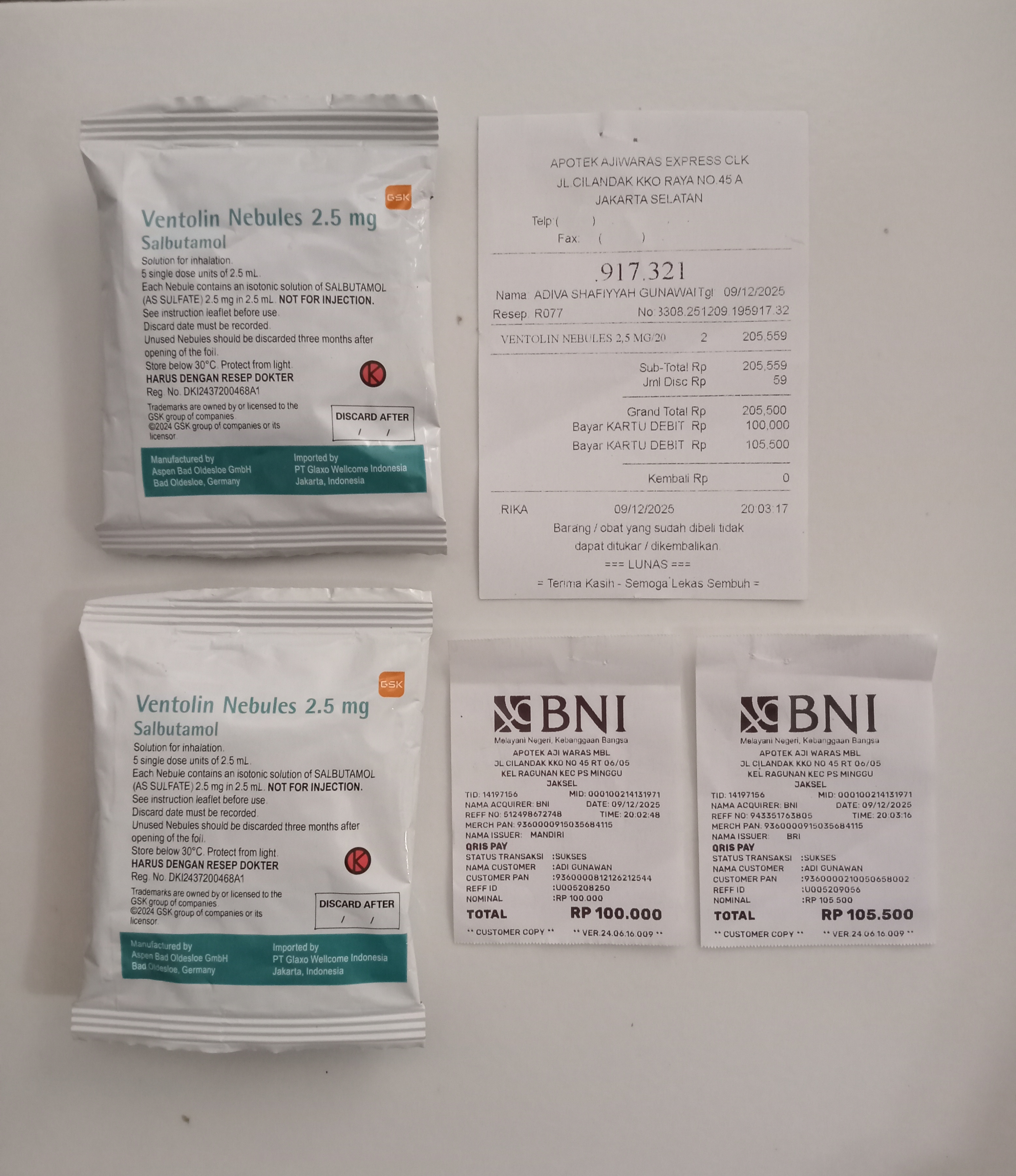 Berikut adalah bukti penggunaan dana untuk kebutuhan medis dan nonmedis Adiva, diantaranya pembelian obat injeksi Endrolin, spuit, susu, popok, serta biaya transportasi untuk kontrol ke RSCM.