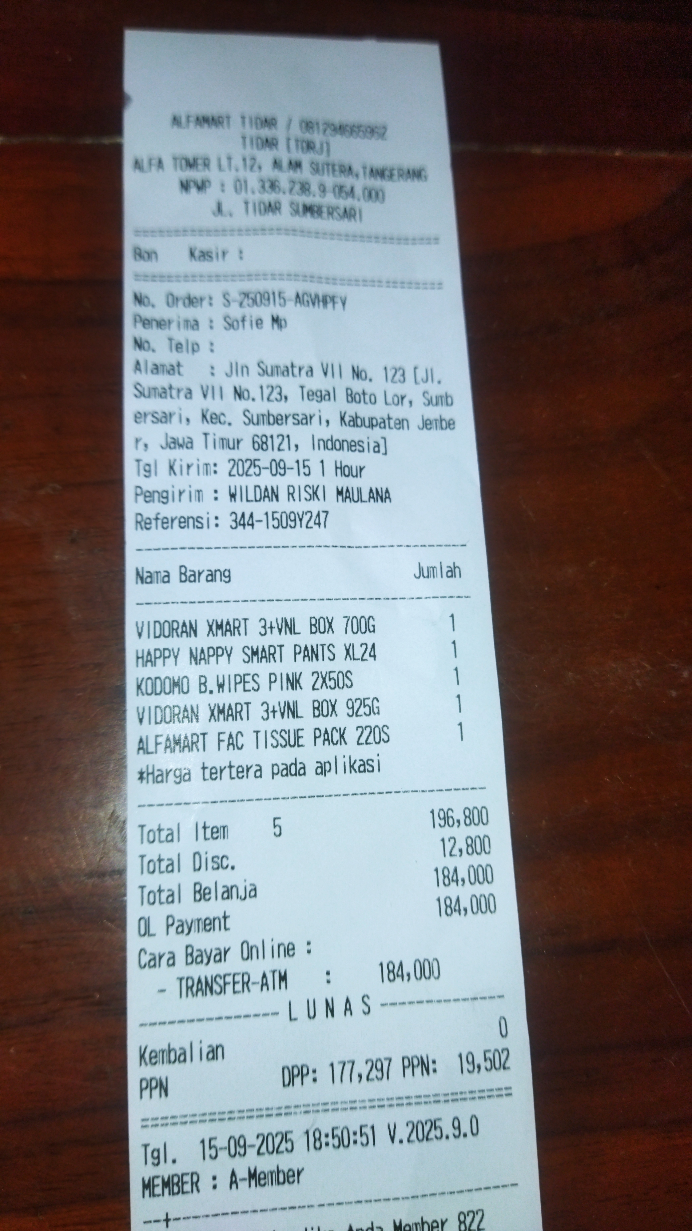 Dana digunakan untuk 1.Susu Vidoran Xmart 925gr Rp69.000x3dus = Rp207.000 2.Pampers Happy Happy XL26 Rp.51.000x2ball= Rp102.0002025-05-06 09:12:28